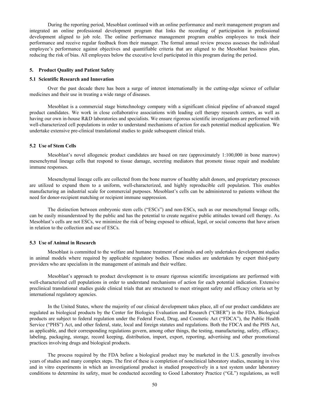 During the reporting period, Mesoblast continued with an online performance and merit management program and integrated an online professional development program that links the recording of participation in professional development aligned to job role. The online performance management program enables employees to track their performance and receive regular feedback from their manager. The formal annual review process assesses the individual employee’s performance against objectives and quantifiable criteria that are aligned to the Mesoblast business plan, reducing the risk of bias. All employees below the executive level participated in this program during the period. 5. Product Quality and Patient Safety 5.1 Scientific Research and Innovation Over the past decade there has been a surge of interest internationally in the cutting-edge science of cellular medicines and their use in treating a wide range of diseases. Mesoblast is a commercial stage biotechnology company with a significant clinical pipeline of advanced staged product candidates. We work in close collaborative associations with leading cell therapy research centers, as well as having our own in-house R&D laboratories and specialists. We ensure rigorous scientific investigations are performed with well-characterized cell populations in order to understand mechanisms of action for each potential medical application. We undertake extensive pre-clinical translational studies to guide subsequent clinical trials. 5.2 Use of Stem Cells Mesoblast’s novel allogeneic product candidates are based on rare (approximately 1:100,000 in bone marrow) mesenchymal lineage cells that respond to tissue damage, secreting mediators that promote tissue repair and modulate immune responses. Mesenchymal lineage cells are collected from the bone marrow of healthy adult donors, and proprietary processes are utilized to expand them to a uniform, well-characterized, and highly reproducible cell population. This enables manufacturing an industrial scale for commercial purposes. Mesoblast’s cells can be administered to patients without the need for donor-recipient matching or recipient immune suppression. The distinction between embryonic stem cells (“ESCs”) and non-ESCs, such as our mesenchymal lineage cells, can be easily misunderstood by the public and has the potential to create negative public attitudes toward cell therapy. As Mesoblast’s cells are not ESCs, we minimize the risk of being exposed to ethical, legal, or social concerns that have arisen in relation to the collection and use of ESCs. 5.3 Use of Animal in Research Mesoblast is committed to the welfare and humane treatment of animals and only undertakes development studies in animal models where required by applicable regulatory bodies. These studies are undertaken by expert third-party providers who are specialists in the management of animals and their welfare. Mesoblast’s approach to product development is to ensure rigorous scientific investigations are performed with well-characterized cell populations in order to understand mechanisms of action for each potential indication. Extensive preclinical translational studies guide clinical trials that are structured to meet stringent safety and efficacy criteria set by international regulatory agencies. In the United States, where the majority of our clinical development takes place, all of our product candidates are regulated as biological products by the Center for Biologics Evaluation and Research (“CBER”) in the FDA. Biological products are subject to federal regulation under the Federal Food, Drug, and Cosmetic Act (“FDCA”), the Public Health Service (“PHS”) Act, and other federal, state, local and foreign statutes and regulations. Both the FDCA and the PHS Act, as applicable, and their corresponding regulations govern, among other things, the testing, manufacturing, safety, efficacy, labeling, packaging, storage, record keeping, distribution, import, export, reporting, advertising and other promotional practices involving drugs and biological products. The process required by the FDA before a biological product may be marketed in the U.S. generally involves years of studies and many complex steps. The first of these is completion of nonclinical laboratory studies, meaning in vivo and in vitro experiments in which an investigational product is studied prospectively in a test system under laboratory conditions to determine its safety, must be conducted according to Good Laboratory Practice (“GL”) regulations, as well 50