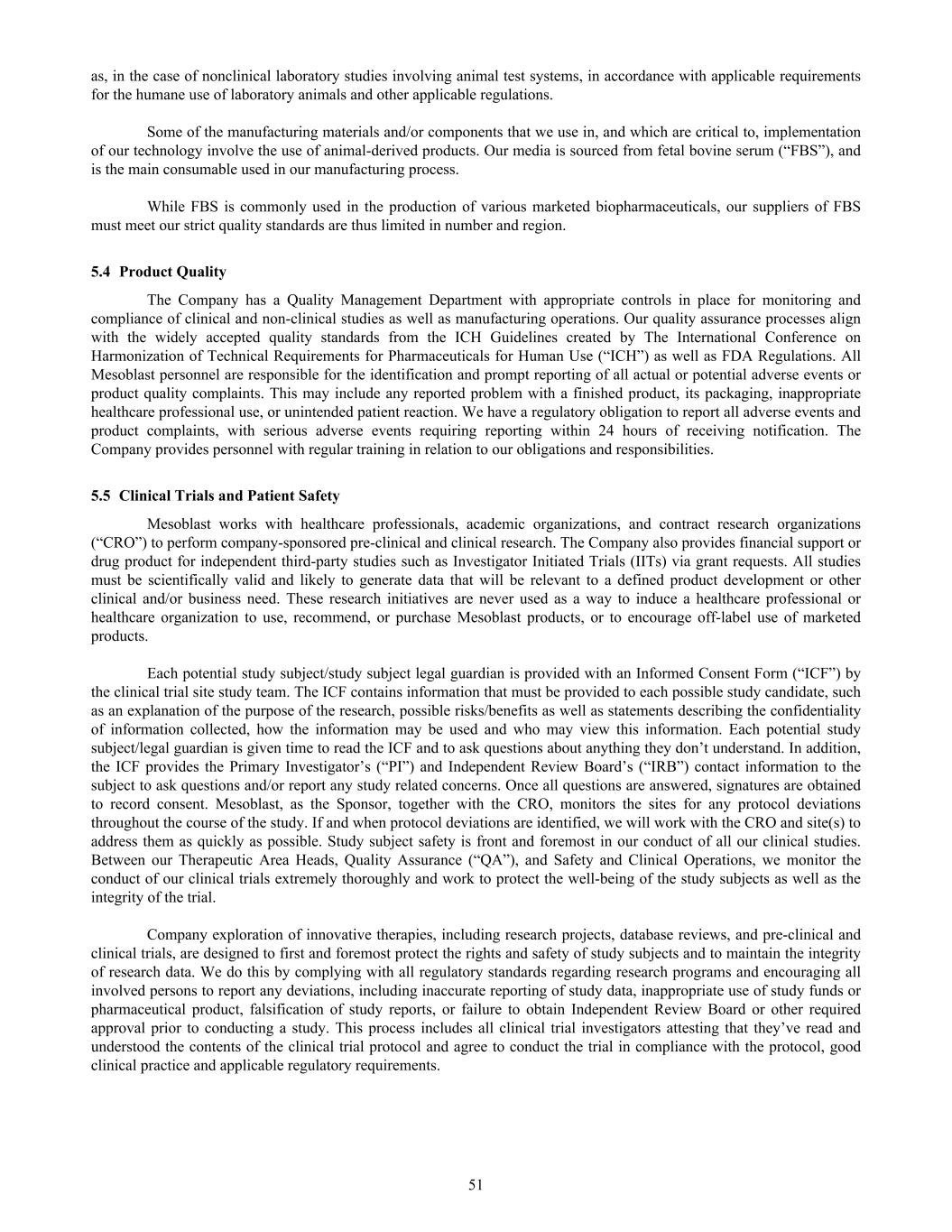 as, in the case of nonclinical laboratory studies involving animal test systems, in accordance with applicable requirements for the humane use of laboratory animals and other applicable regulations. Some of the manufacturing materials and/or components that we use in, and which are critical to, implementation of our technology involve the use of animal-derived products. Our media is sourced from fetal bovine serum (“FBS”), and is the main consumable used in our manufacturing process. While FBS is commonly used in the production of various marketed biopharmaceuticals, our suppliers of FBS must meet our strict quality standards are thus limited in number and region. 5.4 Product Quality The Company has a Quality Management Department with appropriate controls in place for monitoring and compliance of clinical and non-clinical studies as well as manufacturing operations. Our quality assurance processes align with the widely accepted quality standards from the ICH Guidelines created by The International Conference on Harmonization of Technical Requirements for Pharmaceuticals for Human Use (“ICH”) as well as FDA Regulations. All Mesoblast personnel are responsible for the identification and prompt reporting of all actual or potential adverse events or product quality complaints. This may include any reported problem with a finished product, its packaging, inappropriate healthcare professional use, or unintended patient reaction. We have a regulatory obligation to report all adverse events and product complaints, with serious adverse events requiring reporting within 24 hours of receiving notification. The Company provides personnel with regular training in relation to our obligations and responsibilities. 5.5 Clinical Trials and Patient Safety Mesoblast works with healthcare professionals, academic organizations, and contract research organizations (“CRO”) to perform company-sponsored pre-clinical and clinical research. The Company also provides financial support or drug product for independent third-party studies such as Investigator Initiated Trials (IITs) via grant requests. All studies must be scientifically valid and likely to generate data that will be relevant to a defined product development or other clinical and/or business need. These research initiatives are never used as a way to induce a healthcare professional or healthcare organization to use, recommend, or purchase Mesoblast products, or to encourage off-label use of marketed products. Each potential study subject/study subject legal guardian is provided with an Informed Consent Form (“ICF”) by the clinical trial site study team. The ICF contains information that must be provided to each possible study candidate, such as an explanation of the purpose of the research, possible risks/benefits as well as statements describing the confidentiality of information collected, how the information may be used and who may view this information. Each potential study subject/legal guardian is given time to read the ICF and to ask questions about anything they don’t understand. In addition, the ICF provides the Primary Investigator’s (“PI”) and Independent Review Board’s (“IRB”) contact information to the subject to ask questions and/or report any study related concerns. Once all questions are answered, signatures are obtained to record consent. Mesoblast, as the Sponsor, together with the CRO, monitors the sites for any protocol deviations throughout the course of the study. If and when protocol deviations are identified, we will work with the CRO and site(s) to address them as quickly as possible. Study subject safety is front and foremost in our conduct of all our clinical studies. Between our Therapeutic Area Heads, Quality Assurance (“QA”), and Safety and Clinical Operations, we monitor the conduct of our clinical trials extremely thoroughly and work to protect the well-being of the study subjects as well as the integrity of the trial. Company exploration of innovative therapies, including research projects, database reviews, and pre-clinical and clinical trials, are designed to first and foremost protect the rights and safety of study subjects and to maintain the integrity of research data. We do this by complying with all regulatory standards regarding research programs and encouraging all involved persons to report any deviations, including inaccurate reporting of study data, inappropriate use of study funds or pharmaceutical product, falsification of study reports, or failure to obtain Independent Review Board or other required approval prior to conducting a study. This process includes all clinical trial investigators attesting that they’ve read and understood the contents of the clinical trial protocol and agree to conduct the trial in compliance with the protocol, good clinical practice and applicable regulatory requirements. 51
