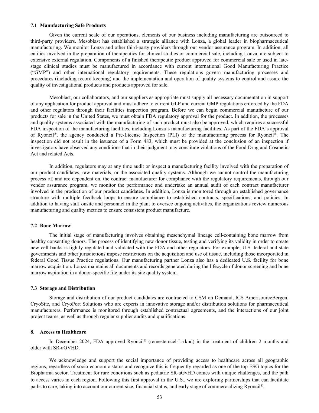 7.1 Manufacturing Safe Products Given the current scale of our operations, elements of our business including manufacturing are outsourced to third-party providers. Mesoblast has established a strategic alliance with Lonza, a global leader in biopharmaceutical manufacturing. We monitor Lonza and other third-party providers through our vendor assurance program. In addition, all entities involved in the preparation of therapeutics for clinical studies or commercial sale, including Lonza, are subject to extensive external regulation. Components of a finished therapeutic product approved for commercial sale or used in late- stage clinical studies must be manufactured in accordance with current international Good Manufacturing Practice (“GMP”) and other international regulatory requirements. These regulations govern manufacturing processes and procedures (including record keeping) and the implementation and operation of quality systems to control and assure the quality of investigational products and products approved for sale. Mesoblast, our collaborators, and our suppliers as appropriate must supply all necessary documentation in support of any application for product approval and must adhere to current GLP and current GMP regulations enforced by the FDA and other regulators through their facilities inspection program. Before we can begin commercial manufacture of our products for sale in the United States, we must obtain FDA regulatory approval for the product. In addition, the processes and quality systems associated with the manufacturing of such product must also be approved, which requires a successful FDA inspection of the manufacturing facilities, including Lonza’s manufacturing facilities. As part of the FDA’s approval of Ryoncil®, the agency conducted a Pre-License Inspection (PLI) of the manufacturing process for Ryoncil®. The inspection did not result in the issuance of a Form 483, which must be provided at the conclusion of an inspection if investigators have observed any conditions that in their judgment may constitute violations of the Food Drug and Cosmetic Act and related Acts. In addition, regulators may at any time audit or inspect a manufacturing facility involved with the preparation of our product candidates, raw materials, or the associated quality systems. Although we cannot control the manufacturing process of, and are dependent on, the contract manufacturer for compliance with the regulatory requirements, through our vendor assurance program, we monitor the performance and undertake an annual audit of each contract manufacturer involved in the production of our product candidates. In addition, Lonza is monitored through an established governance structure with multiple feedback loops to ensure compliance to established contracts, specifications, and policies. In addition to having staff onsite and personnel in the plant to oversee ongoing activities, the organizations review numerous manufacturing and quality metrics to ensure consistent product manufacture. 7.2 Bone Marrow The initial stage of manufacturing involves obtaining mesenchymal lineage cell-containing bone marrow from healthy consenting donors. The process of identifying new donor tissue, testing and verifying its validity in order to create new cell banks is tightly regulated and validated with the FDA and other regulators. For example, U.S. federal and state governments and other jurisdictions impose restrictions on the acquisition and use of tissue, including those incorporated in federal Good Tissue Practice regulations. Our manufacturing partner Lonza also has a dedicated U.S. facility for bone marrow acquisition. Lonza maintains all documents and records generated during the lifecycle of donor screening and bone marrow aspiration in a donor-specific file under its site quality system. 7.3 Storage and Distribution Storage and distribution of our product candidates are contracted to CSM on Demand, ICS AmerisourceBergen, CryoSite, and CryoPort Solutions who are experts in innovative storage and/or distribution solutions for pharmaceutical manufacturers. Performance is monitored through established contractual agreements, and the interactions of our joint project teams, as well as through regular supplier audits and qualifications. 8. Access to Healthcare In December 2024, FDA approved Ryoncil® (remestemcel-L-rknd) in the treatment of children 2 months and older with SR-aGVHD. We acknowledge and support the social importance of providing access to healthcare across all geographic regions, regardless of socio-economic status and recognize this is frequently regarded as one of the top ESG topics for the Biopharma sector. Treatment for rare conditions such as pediatric SR-aGvHD comes with unique challenges, and the path to access varies in each region. Following this first approval in the U.S., we are exploring partnerships that can facilitate paths to care, taking into account our current size, financial status, and early stage of commercializing Ryoncil®. 53