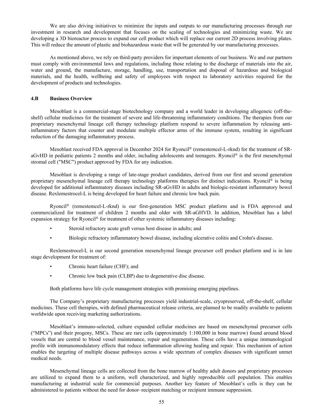 We are also driving initiatives to minimize the inputs and outputs to our manufacturing processes through our investment in research and development that focuses on the scaling of technologies and minimizing waste. We are developing a 3D bioreactor process to expand our cell product which will replace our current 2D process involving plates. This will reduce the amount of plastic and biohazardous waste that will be generated by our manufacturing processes. As mentioned above, we rely on third-party providers for important elements of our business. We and our partners must comply with environmental laws and regulations, including those relating to the discharge of materials into the air, water and ground, the manufacture, storage, handling, use, transportation and disposal of hazardous and biological materials, and the health, wellbeing and safety of employees with respect to laboratory activities required for the development of products and technologies. 4.B Business Overview Mesoblast is a commercial-stage biotechnology company and a world leader in developing allogeneic (off-the- shelf) cellular medicines for the treatment of severe and life-threatening inflammatory conditions. The therapies from our proprietary mesenchymal lineage cell therapy technology platform respond to severe inflammation by releasing anti- inflammatory factors that counter and modulate multiple effector arms of the immune system, resulting in significant reduction of the damaging inflammatory process. Mesoblast received FDA approval in December 2024 for Ryoncil® (remestemcel-L-rknd) for the treatment of SR- aGvHD in pediatric patients 2 months and older, including adolescents and teenagers. Ryoncil® is the first mesenchymal stromal cell ("MSC") product approved by FDA for any indication. Mesoblast is developing a range of late-stage product candidates, derived from our first and second generation proprietary mesenchymal lineage cell therapy technology platforms therapies for distinct indications. Ryoncil® is being developed for additional inflammatory diseases including SR-aGvHD in adults and biologic-resistant inflammatory bowel disease. Rexlemestrocel-L is being developed for heart failure and chronic low back pain. Ryoncil® (remestemcel-L-rknd) is our first-generation MSC product platform and is FDA approved and commercialized for treatment of children 2 months and older with SR-aGHVD. In addition, Mesoblast has a label expansion strategy for Ryoncil® for treatment of other systemic inflammatory diseases including: • Steroid refractory acute graft versus host disease in adults; and • Biologic refractory inflammatory bowel disease, including ulcerative colitis and Crohn's disease. Rexlemestrocel-L is our second generation mesenchymal lineage precursor cell product platform and is in late stage development for treatment of: • Chronic heart failure (CHF); and • Chronic low back pain (CLBP) due to degenerative disc disease. Both platforms have life cycle management strategies with promising emerging pipelines. The Company’s proprietary manufacturing processes yield industrial-scale, cryopreserved, off-the-shelf, cellular medicines. These cell therapies, with defined pharmaceutical release criteria, are planned to be readily available to patients worldwide upon receiving marketing authorizations. Mesoblast’s immuno-selected, culture expanded cellular medicines are based on mesenchymal precursor cells (“MPCs”) and their progeny, MSCs. These are rare cells (approximately 1:100,000 in bone marrow) found around blood vessels that are central to blood vessel maintenance, repair and regeneration. These cells have a unique immunological profile with immunomodulatory effects that reduce inflammation allowing healing and repair. This mechanism of action enables the targeting of multiple disease pathways across a wide spectrum of complex diseases with significant unmet medical needs. Mesenchymal lineage cells are collected from the bone marrow of healthy adult donors and proprietary processes are utilized to expand them to a uniform, well characterized, and highly reproducible cell population. This enables manufacturing at industrial scale for commercial purposes. Another key feature of Mesoblast’s cells is they can be administered to patients without the need for donor–recipient matching or recipient immune suppression. 55