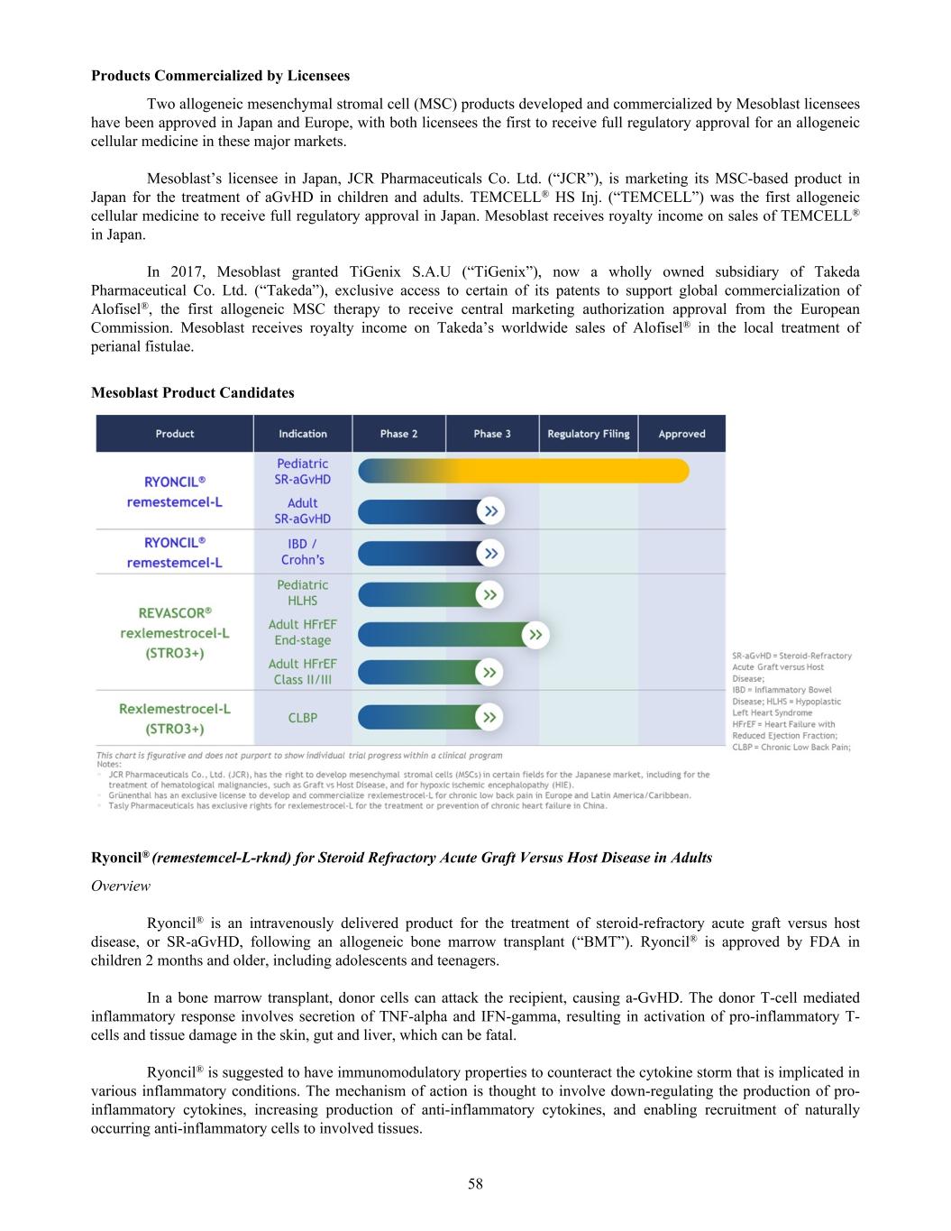 Products Commercialized by Licensees Two allogeneic mesenchymal stromal cell (MSC) products developed and commercialized by Mesoblast licensees have been approved in Japan and Europe, with both licensees the first to receive full regulatory approval for an allogeneic cellular medicine in these major markets. Mesoblast’s licensee in Japan, JCR Pharmaceuticals Co. Ltd. (“JCR”), is marketing its MSC-based product in Japan for the treatment of aGvHD in children and adults. TEMCELL® HS Inj. (“TEMCELL”) was the first allogeneic cellular medicine to receive full regulatory approval in Japan. Mesoblast receives royalty income on sales of TEMCELL® in Japan. In 2017, Mesoblast granted TiGenix S.A.U (“TiGenix”), now a wholly owned subsidiary of Takeda Pharmaceutical Co. Ltd. (“Takeda”), exclusive access to certain of its patents to support global commercialization of Alofisel®, the first allogeneic MSC therapy to receive central marketing authorization approval from the European Commission. Mesoblast receives royalty income on Takeda’s worldwide sales of Alofisel® in the local treatment of perianal fistulae. Mesoblast Product Candidates Ryoncil® (remestemcel-L-rknd) for Steroid Refractory Acute Graft Versus Host Disease in Adults Overview Ryoncil® is an intravenously delivered product for the treatment of steroid-refractory acute graft versus host disease, or SR-aGvHD, following an allogeneic bone marrow transplant (“BMT”). Ryoncil® is approved by FDA in children 2 months and older, including adolescents and teenagers. In a bone marrow transplant, donor cells can attack the recipient, causing a-GvHD. The donor T-cell mediated inflammatory response involves secretion of TNF-alpha and IFN-gamma, resulting in activation of pro-inflammatory T- cells and tissue damage in the skin, gut and liver, which can be fatal. Ryoncil® is suggested to have immunomodulatory properties to counteract the cytokine storm that is implicated in various inflammatory conditions. The mechanism of action is thought to involve down-regulating the production of pro- inflammatory cytokines, increasing production of anti-inflammatory cytokines, and enabling recruitment of naturally occurring anti-inflammatory cells to involved tissues. 58