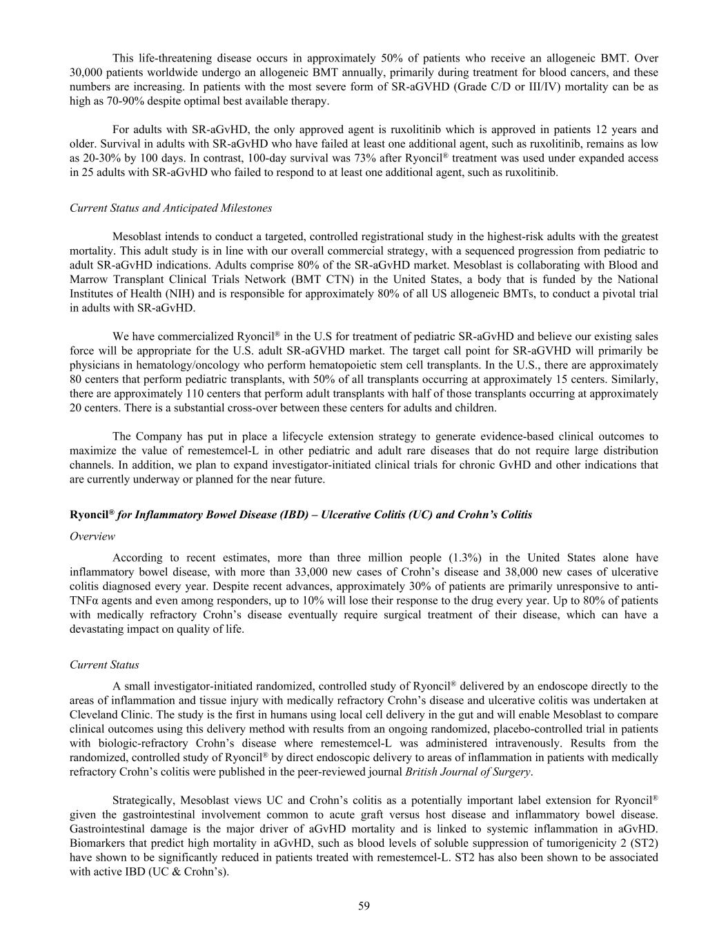 This life-threatening disease occurs in approximately 50% of patients who receive an allogeneic BMT. Over 30,000 patients worldwide undergo an allogeneic BMT annually, primarily during treatment for blood cancers, and these numbers are increasing. In patients with the most severe form of SR-aGVHD (Grade C/D or III/IV) mortality can be as high as 70-90% despite optimal best available therapy. For adults with SR-aGvHD, the only approved agent is ruxolitinib which is approved in patients 12 years and older. Survival in adults with SR-aGvHD who have failed at least one additional agent, such as ruxolitinib, remains as low as 20-30% by 100 days. In contrast, 100-day survival was 73% after Ryoncil® treatment was used under expanded access in 25 adults with SR-aGvHD who failed to respond to at least one additional agent, such as ruxolitinib. Current Status and Anticipated Milestones Mesoblast intends to conduct a targeted, controlled registrational study in the highest-risk adults with the greatest mortality. This adult study is in line with our overall commercial strategy, with a sequenced progression from pediatric to adult SR-aGvHD indications. Adults comprise 80% of the SR-aGvHD market. Mesoblast is collaborating with Blood and Marrow Transplant Clinical Trials Network (BMT CTN) in the United States, a body that is funded by the National Institutes of Health (NIH) and is responsible for approximately 80% of all US allogeneic BMTs, to conduct a pivotal trial in adults with SR-aGvHD. We have commercialized Ryoncil® in the U.S for treatment of pediatric SR-aGvHD and believe our existing sales force will be appropriate for the U.S. adult SR-aGVHD market. The target call point for SR-aGVHD will primarily be physicians in hematology/oncology who perform hematopoietic stem cell transplants. In the U.S., there are approximately 80 centers that perform pediatric transplants, with 50% of all transplants occurring at approximately 15 centers. Similarly, there are approximately 110 centers that perform adult transplants with half of those transplants occurring at approximately 20 centers. There is a substantial cross-over between these centers for adults and children. The Company has put in place a lifecycle extension strategy to generate evidence-based clinical outcomes to maximize the value of remestemcel-L in other pediatric and adult rare diseases that do not require large distribution channels. In addition, we plan to expand investigator-initiated clinical trials for chronic GvHD and other indications that are currently underway or planned for the near future. Ryoncil® for Inflammatory Bowel Disease (IBD) – Ulcerative Colitis (UC) and Crohn’s Colitis Overview According to recent estimates, more than three million people (1.3%) in the United States alone have inflammatory bowel disease, with more than 33,000 new cases of Crohn’s disease and 38,000 new cases of ulcerative colitis diagnosed every year. Despite recent advances, approximately 30% of patients are primarily unresponsive to anti- TNFα agents and even among responders, up to 10% will lose their response to the drug every year. Up to 80% of patients with medically refractory Crohn’s disease eventually require surgical treatment of their disease, which can have a devastating impact on quality of life. Current Status A small investigator-initiated randomized, controlled study of Ryoncil® delivered by an endoscope directly to the areas of inflammation and tissue injury with medically refractory Crohn’s disease and ulcerative colitis was undertaken at Cleveland Clinic. The study is the first in humans using local cell delivery in the gut and will enable Mesoblast to compare clinical outcomes using this delivery method with results from an ongoing randomized, placebo-controlled trial in patients with biologic-refractory Crohn’s disease where remestemcel-L was administered intravenously. Results from the randomized, controlled study of Ryoncil® by direct endoscopic delivery to areas of inflammation in patients with medically refractory Crohn’s colitis were published in the peer-reviewed journal British Journal of Surgery. Strategically, Mesoblast views UC and Crohn’s colitis as a potentially important label extension for Ryoncil® given the gastrointestinal involvement common to acute graft versus host disease and inflammatory bowel disease. Gastrointestinal damage is the major driver of aGvHD mortality and is linked to systemic inflammation in aGvHD. Biomarkers that predict high mortality in aGvHD, such as blood levels of soluble suppression of tumorigenicity 2 (ST2) have shown to be significantly reduced in patients treated with remestemcel-L. ST2 has also been shown to be associated with active IBD (UC & Crohn’s). 59