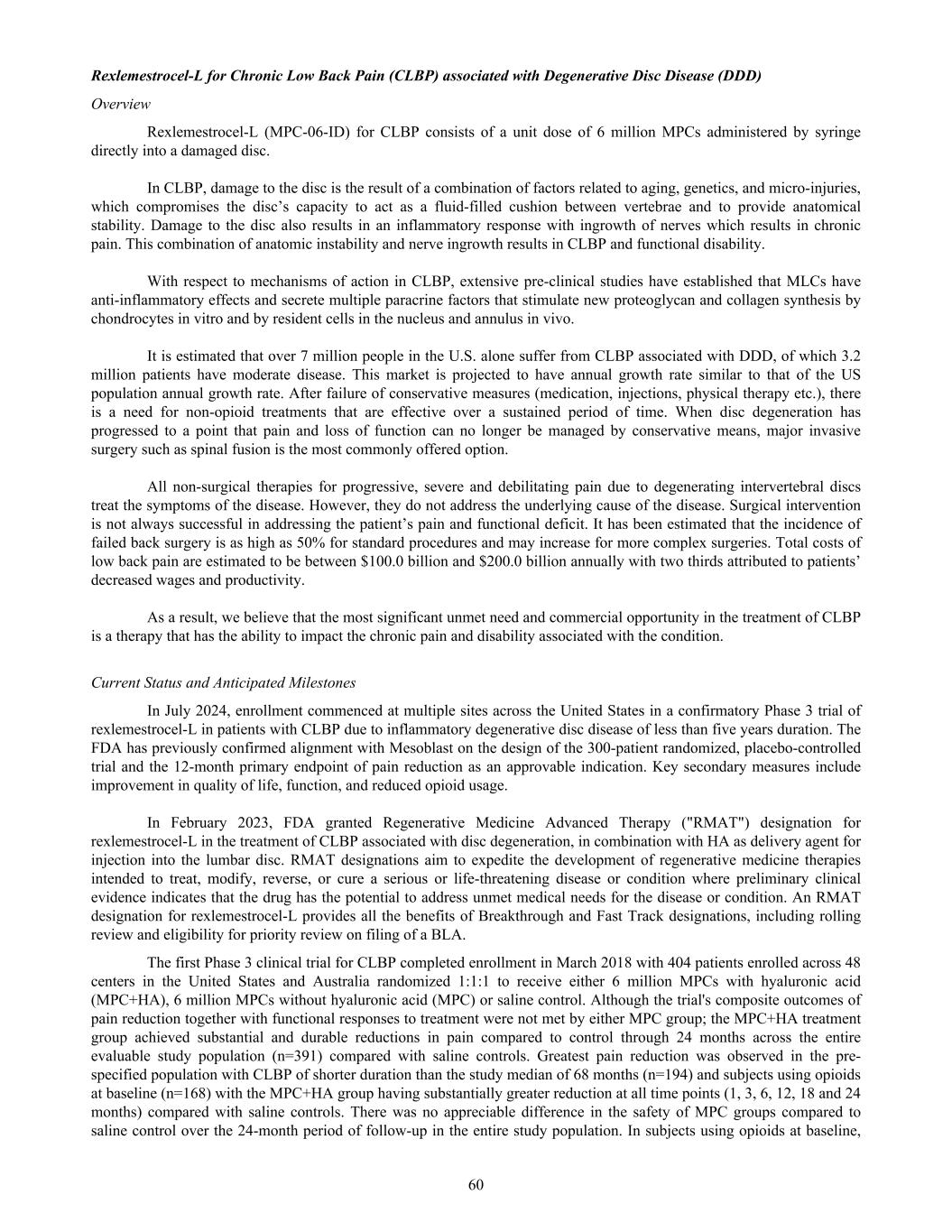 Rexlemestrocel-L for Chronic Low Back Pain (CLBP) associated with Degenerative Disc Disease (DDD) Overview Rexlemestrocel-L (MPC-06-ID) for CLBP consists of a unit dose of 6 million MPCs administered by syringe directly into a damaged disc. In CLBP, damage to the disc is the result of a combination of factors related to aging, genetics, and micro-injuries, which compromises the disc’s capacity to act as a fluid-filled cushion between vertebrae and to provide anatomical stability. Damage to the disc also results in an inflammatory response with ingrowth of nerves which results in chronic pain. This combination of anatomic instability and nerve ingrowth results in CLBP and functional disability. With respect to mechanisms of action in CLBP, extensive pre-clinical studies have established that MLCs have anti-inflammatory effects and secrete multiple paracrine factors that stimulate new proteoglycan and collagen synthesis by chondrocytes in vitro and by resident cells in the nucleus and annulus in vivo. It is estimated that over 7 million people in the U.S. alone suffer from CLBP associated with DDD, of which 3.2 million patients have moderate disease. This market is projected to have annual growth rate similar to that of the US population annual growth rate. After failure of conservative measures (medication, injections, physical therapy etc.), there is a need for non-opioid treatments that are effective over a sustained period of time. When disc degeneration has progressed to a point that pain and loss of function can no longer be managed by conservative means, major invasive surgery such as spinal fusion is the most commonly offered option. All non-surgical therapies for progressive, severe and debilitating pain due to degenerating intervertebral discs treat the symptoms of the disease. However, they do not address the underlying cause of the disease. Surgical intervention is not always successful in addressing the patient’s pain and functional deficit. It has been estimated that the incidence of failed back surgery is as high as 50% for standard procedures and may increase for more complex surgeries. Total costs of low back pain are estimated to be between $100.0 billion and $200.0 billion annually with two thirds attributed to patients’ decreased wages and productivity. As a result, we believe that the most significant unmet need and commercial opportunity in the treatment of CLBP is a therapy that has the ability to impact the chronic pain and disability associated with the condition. Current Status and Anticipated Milestones In July 2024, enrollment commenced at multiple sites across the United States in a confirmatory Phase 3 trial of rexlemestrocel-L in patients with CLBP due to inflammatory degenerative disc disease of less than five years duration. The FDA has previously confirmed alignment with Mesoblast on the design of the 300-patient randomized, placebo-controlled trial and the 12-month primary endpoint of pain reduction as an approvable indication. Key secondary measures include improvement in quality of life, function, and reduced opioid usage. In February 2023, FDA granted Regenerative Medicine Advanced Therapy ("RMAT") designation for rexlemestrocel-L in the treatment of CLBP associated with disc degeneration, in combination with HA as delivery agent for injection into the lumbar disc. RMAT designations aim to expedite the development of regenerative medicine therapies intended to treat, modify, reverse, or cure a serious or life-threatening disease or condition where preliminary clinical evidence indicates that the drug has the potential to address unmet medical needs for the disease or condition. An RMAT designation for rexlemestrocel-L provides all the benefits of Breakthrough and Fast Track designations, including rolling review and eligibility for priority review on filing of a BLA. The first Phase 3 clinical trial for CLBP completed enrollment in March 2018 with 404 patients enrolled across 48 centers in the United States and Australia randomized 1:1:1 to receive either 6 million MPCs with hyaluronic acid (MPC+HA), 6 million MPCs without hyaluronic acid (MPC) or saline control. Although the trial's composite outcomes of pain reduction together with functional responses to treatment were not met by either MPC group; the MPC+HA treatment group achieved substantial and durable reductions in pain compared to control through 24 months across the entire evaluable study population (n=391) compared with saline controls. Greatest pain reduction was observed in the pre- specified population with CLBP of shorter duration than the study median of 68 months (n=194) and subjects using opioids at baseline (n=168) with the MPC+HA group having substantially greater reduction at all time points (1, 3, 6, 12, 18 and 24 months) compared with saline controls. There was no appreciable difference in the safety of MPC groups compared to saline control over the 24-month period of follow-up in the entire study population. In subjects using opioids at baseline, 60