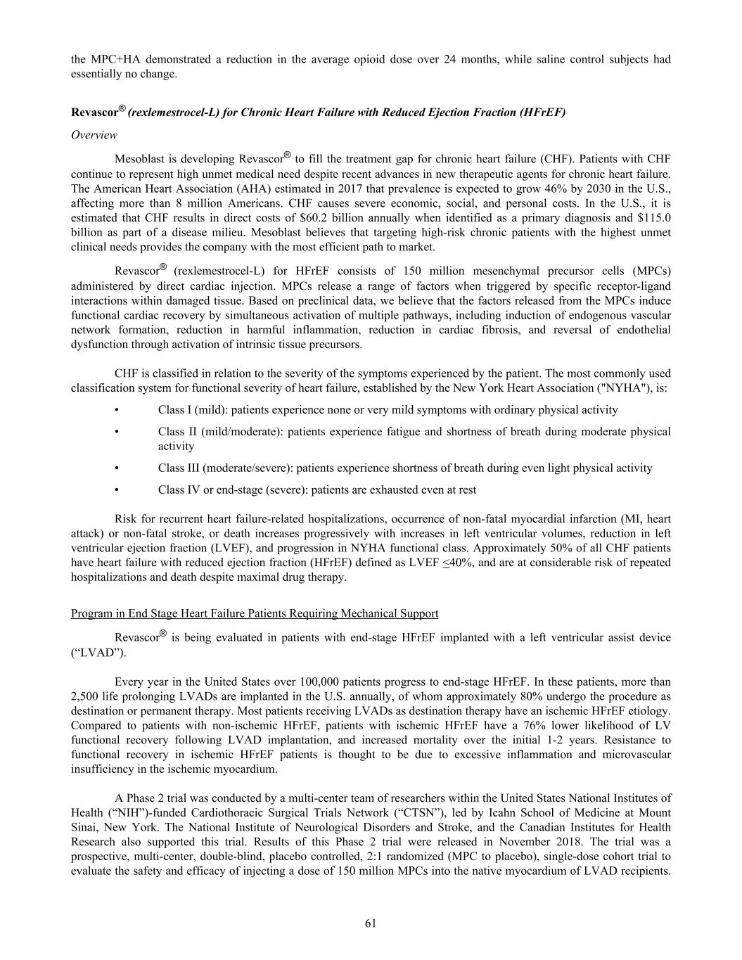 the MPC+HA demonstrated a reduction in the average opioid dose over 24 months, while saline control subjects had essentially no change. Revascor® (rexlemestrocel-L) for Chronic Heart Failure with Reduced Ejection Fraction (HFrEF) Overview Mesoblast is developing Revascor® to fill the treatment gap for chronic heart failure (CHF). Patients with CHF continue to represent high unmet medical need despite recent advances in new therapeutic agents for chronic heart failure. The American Heart Association (AHA) estimated in 2017 that prevalence is expected to grow 46% by 2030 in the U.S., affecting more than 8 million Americans. CHF causes severe economic, social, and personal costs. In the U.S., it is estimated that CHF results in direct costs of $60.2 billion annually when identified as a primary diagnosis and $115.0 billion as part of a disease milieu. Mesoblast believes that targeting high-risk chronic patients with the highest unmet clinical needs provides the company with the most efficient path to market. Revascor® (rexlemestrocel-L) for HFrEF consists of 150 million mesenchymal precursor cells (MPCs) administered by direct cardiac injection. MPCs release a range of factors when triggered by specific receptor-ligand interactions within damaged tissue. Based on preclinical data, we believe that the factors released from the MPCs induce functional cardiac recovery by simultaneous activation of multiple pathways, including induction of endogenous vascular network formation, reduction in harmful inflammation, reduction in cardiac fibrosis, and reversal of endothelial dysfunction through activation of intrinsic tissue precursors. CHF is classified in relation to the severity of the symptoms experienced by the patient. The most commonly used classification system for functional severity of heart failure, established by the New York Heart Association ("NYHA"), is: • Class I (mild): patients experience none or very mild symptoms with ordinary physical activity • Class II (mild/moderate): patients experience fatigue and shortness of breath during moderate physical activity • Class III (moderate/severe): patients experience shortness of breath during even light physical activity • Class IV or end-stage (severe): patients are exhausted even at rest Risk for recurrent heart failure-related hospitalizations, occurrence of non-fatal myocardial infarction (MI, heart attack) or non-fatal stroke, or death increases progressively with increases in left ventricular volumes, reduction in left ventricular ejection fraction (LVEF), and progression in NYHA functional class. Approximately 50% of all CHF patients have heart failure with reduced ejection fraction (HFrEF) defined as LVEF <40%, and are at considerable risk of repeated hospitalizations and death despite maximal drug therapy. Program in End Stage Heart Failure Patients Requiring Mechanical Support Revascor® is being evaluated in patients with end-stage HFrEF implanted with a left ventricular assist device (“LVAD”). Every year in the United States over 100,000 patients progress to end-stage HFrEF. In these patients, more than 2,500 life prolonging LVADs are implanted in the U.S. annually, of whom approximately 80% undergo the procedure as destination or permanent therapy. Most patients receiving LVADs as destination therapy have an ischemic HFrEF etiology. Compared to patients with non-ischemic HFrEF, patients with ischemic HFrEF have a 76% lower likelihood of LV functional recovery following LVAD implantation, and increased mortality over the initial 1-2 years. Resistance to functional recovery in ischemic HFrEF patients is thought to be due to excessive inflammation and microvascular insufficiency in the ischemic myocardium. A Phase 2 trial was conducted by a multi-center team of researchers within the United States National Institutes of Health (“NIH”)-funded Cardiothoracic Surgical Trials Network (“CTSN”), led by Icahn School of Medicine at Mount Sinai, New York. The National Institute of Neurological Disorders and Stroke, and the Canadian Institutes for Health Research also supported this trial. Results of this Phase 2 trial were released in November 2018. The trial was a prospective, multi-center, double-blind, placebo controlled, 2:1 randomized (MPC to placebo), single-dose cohort trial to evaluate the safety and efficacy of injecting a dose of 150 million MPCs into the native myocardium of LVAD recipients. 61