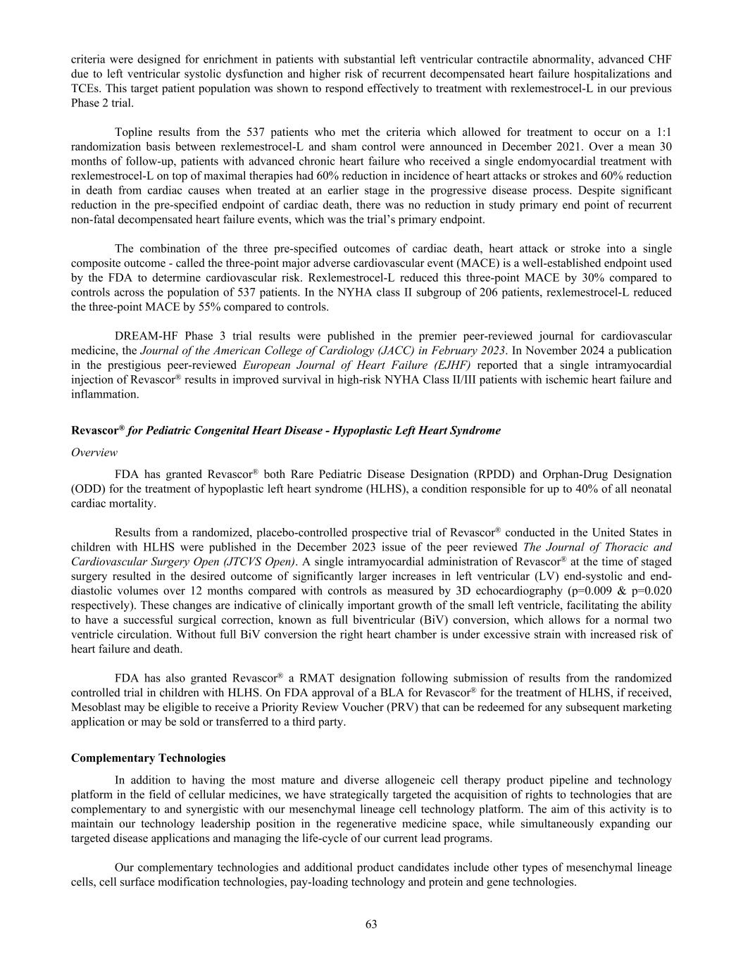 criteria were designed for enrichment in patients with substantial left ventricular contractile abnormality, advanced CHF due to left ventricular systolic dysfunction and higher risk of recurrent decompensated heart failure hospitalizations and TCEs. This target patient population was shown to respond effectively to treatment with rexlemestrocel-L in our previous Phase 2 trial. Topline results from the 537 patients who met the criteria which allowed for treatment to occur on a 1:1 randomization basis between rexlemestrocel-L and sham control were announced in December 2021. Over a mean 30 months of follow-up, patients with advanced chronic heart failure who received a single endomyocardial treatment with rexlemestrocel-L on top of maximal therapies had 60% reduction in incidence of heart attacks or strokes and 60% reduction in death from cardiac causes when treated at an earlier stage in the progressive disease process. Despite significant reduction in the pre-specified endpoint of cardiac death, there was no reduction in study primary end point of recurrent non-fatal decompensated heart failure events, which was the trial’s primary endpoint. The combination of the three pre-specified outcomes of cardiac death, heart attack or stroke into a single composite outcome - called the three-point major adverse cardiovascular event (MACE) is a well-established endpoint used by the FDA to determine cardiovascular risk. Rexlemestrocel-L reduced this three-point MACE by 30% compared to controls across the population of 537 patients. In the NYHA class II subgroup of 206 patients, rexlemestrocel-L reduced the three-point MACE by 55% compared to controls. DREAM-HF Phase 3 trial results were published in the premier peer-reviewed journal for cardiovascular medicine, the Journal of the American College of Cardiology (JACC) in February 2023. In November 2024 a publication in the prestigious peer-reviewed European Journal of Heart Failure (EJHF) reported that a single intramyocardial injection of Revascor® results in improved survival in high-risk NYHA Class II/III patients with ischemic heart failure and inflammation. Revascor® for Pediatric Congenital Heart Disease - Hypoplastic Left Heart Syndrome Overview FDA has granted Revascor® both Rare Pediatric Disease Designation (RPDD) and Orphan-Drug Designation (ODD) for the treatment of hypoplastic left heart syndrome (HLHS), a condition responsible for up to 40% of all neonatal cardiac mortality. Results from a randomized, placebo-controlled prospective trial of Revascor® conducted in the United States in children with HLHS were published in the December 2023 issue of the peer reviewed The Journal of Thoracic and Cardiovascular Surgery Open (JTCVS Open). A single intramyocardial administration of Revascor® at the time of staged surgery resulted in the desired outcome of significantly larger increases in left ventricular (LV) end-systolic and end- diastolic volumes over 12 months compared with controls as measured by 3D echocardiography (p=0.009 & p=0.020 respectively). These changes are indicative of clinically important growth of the small left ventricle, facilitating the ability to have a successful surgical correction, known as full biventricular (BiV) conversion, which allows for a normal two ventricle circulation. Without full BiV conversion the right heart chamber is under excessive strain with increased risk of heart failure and death. FDA has also granted Revascor® a RMAT designation following submission of results from the randomized controlled trial in children with HLHS. On FDA approval of a BLA for Revascor® for the treatment of HLHS, if received, Mesoblast may be eligible to receive a Priority Review Voucher (PRV) that can be redeemed for any subsequent marketing application or may be sold or transferred to a third party. Complementary Technologies In addition to having the most mature and diverse allogeneic cell therapy product pipeline and technology platform in the field of cellular medicines, we have strategically targeted the acquisition of rights to technologies that are complementary to and synergistic with our mesenchymal lineage cell technology platform. The aim of this activity is to maintain our technology leadership position in the regenerative medicine space, while simultaneously expanding our targeted disease applications and managing the life-cycle of our current lead programs. Our complementary technologies and additional product candidates include other types of mesenchymal lineage cells, cell surface modification technologies, pay-loading technology and protein and gene technologies. 63