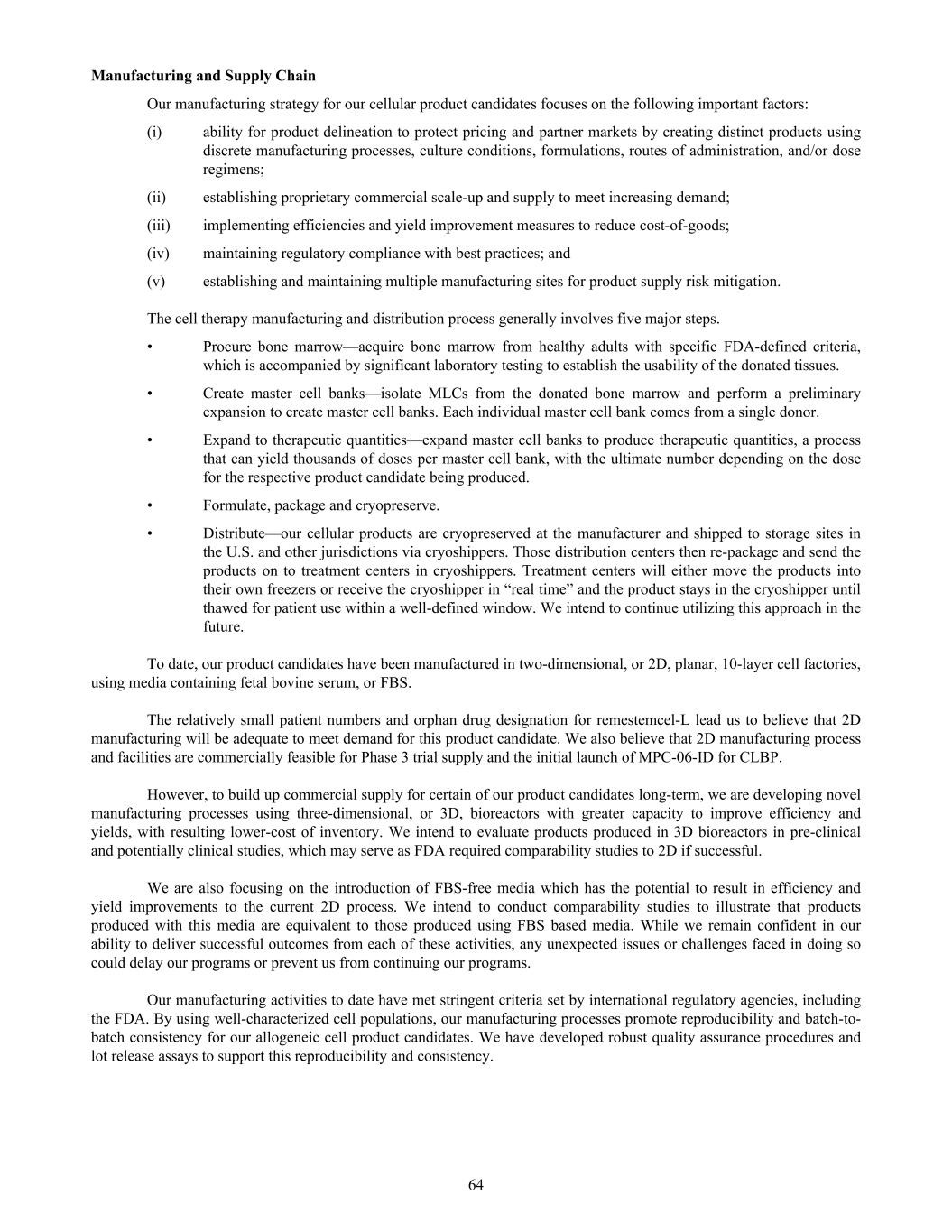 Manufacturing and Supply Chain Our manufacturing strategy for our cellular product candidates focuses on the following important factors: (i) ability for product delineation to protect pricing and partner markets by creating distinct products using discrete manufacturing processes, culture conditions, formulations, routes of administration, and/or dose regimens; (ii) establishing proprietary commercial scale-up and supply to meet increasing demand; (iii) implementing efficiencies and yield improvement measures to reduce cost-of-goods; (iv) maintaining regulatory compliance with best practices; and (v) establishing and maintaining multiple manufacturing sites for product supply risk mitigation. The cell therapy manufacturing and distribution process generally involves five major steps. • Procure bone marrow—acquire bone marrow from healthy adults with specific FDA-defined criteria, which is accompanied by significant laboratory testing to establish the usability of the donated tissues. • Create master cell banks—isolate MLCs from the donated bone marrow and perform a preliminary expansion to create master cell banks. Each individual master cell bank comes from a single donor. • Expand to therapeutic quantities—expand master cell banks to produce therapeutic quantities, a process that can yield thousands of doses per master cell bank, with the ultimate number depending on the dose for the respective product candidate being produced. • Formulate, package and cryopreserve. • Distribute—our cellular products are cryopreserved at the manufacturer and shipped to storage sites in the U.S. and other jurisdictions via cryoshippers. Those distribution centers then re-package and send the products on to treatment centers in cryoshippers. Treatment centers will either move the products into their own freezers or receive the cryoshipper in “real time” and the product stays in the cryoshipper until thawed for patient use within a well-defined window. We intend to continue utilizing this approach in the future. To date, our product candidates have been manufactured in two-dimensional, or 2D, planar, 10-layer cell factories, using media containing fetal bovine serum, or FBS. The relatively small patient numbers and orphan drug designation for remestemcel-L lead us to believe that 2D manufacturing will be adequate to meet demand for this product candidate. We also believe that 2D manufacturing process and facilities are commercially feasible for Phase 3 trial supply and the initial launch of MPC-06-ID for CLBP. However, to build up commercial supply for certain of our product candidates long-term, we are developing novel manufacturing processes using three-dimensional, or 3D, bioreactors with greater capacity to improve efficiency and yields, with resulting lower-cost of inventory. We intend to evaluate products produced in 3D bioreactors in pre-clinical and potentially clinical studies, which may serve as FDA required comparability studies to 2D if successful. We are also focusing on the introduction of FBS-free media which has the potential to result in efficiency and yield improvements to the current 2D process. We intend to conduct comparability studies to illustrate that products produced with this media are equivalent to those produced using FBS based media. While we remain confident in our ability to deliver successful outcomes from each of these activities, any unexpected issues or challenges faced in doing so could delay our programs or prevent us from continuing our programs. Our manufacturing activities to date have met stringent criteria set by international regulatory agencies, including the FDA. By using well-characterized cell populations, our manufacturing processes promote reproducibility and batch-to- batch consistency for our allogeneic cell product candidates. We have developed robust quality assurance procedures and lot release assays to support this reproducibility and consistency. 64