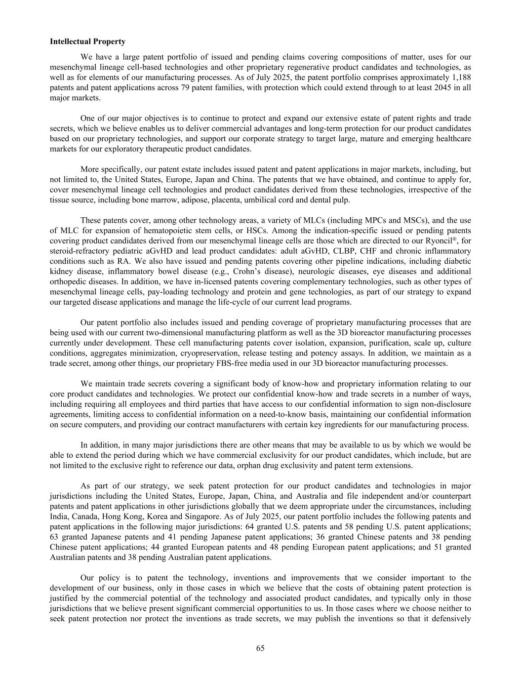 Intellectual Property We have a large patent portfolio of issued and pending claims covering compositions of matter, uses for our mesenchymal lineage cell-based technologies and other proprietary regenerative product candidates and technologies, as well as for elements of our manufacturing processes. As of July 2025, the patent portfolio comprises approximately 1,188 patents and patent applications across 79 patent families, with protection which could extend through to at least 2045 in all major markets. One of our major objectives is to continue to protect and expand our extensive estate of patent rights and trade secrets, which we believe enables us to deliver commercial advantages and long-term protection for our product candidates based on our proprietary technologies, and support our corporate strategy to target large, mature and emerging healthcare markets for our exploratory therapeutic product candidates. More specifically, our patent estate includes issued patent and patent applications in major markets, including, but not limited to, the United States, Europe, Japan and China. The patents that we have obtained, and continue to apply for, cover mesenchymal lineage cell technologies and product candidates derived from these technologies, irrespective of the tissue source, including bone marrow, adipose, placenta, umbilical cord and dental pulp. These patents cover, among other technology areas, a variety of MLCs (including MPCs and MSCs), and the use of MLC for expansion of hematopoietic stem cells, or HSCs. Among the indication-specific issued or pending patents covering product candidates derived from our mesenchymal lineage cells are those which are directed to our Ryoncil®, for steroid-refractory pediatric aGvHD and lead product candidates: adult aGvHD, CLBP, CHF and chronic inflammatory conditions such as RA. We also have issued and pending patents covering other pipeline indications, including diabetic kidney disease, inflammatory bowel disease (e.g., Crohn’s disease), neurologic diseases, eye diseases and additional orthopedic diseases. In addition, we have in-licensed patents covering complementary technologies, such as other types of mesenchymal lineage cells, pay-loading technology and protein and gene technologies, as part of our strategy to expand our targeted disease applications and manage the life-cycle of our current lead programs. Our patent portfolio also includes issued and pending coverage of proprietary manufacturing processes that are being used with our current two-dimensional manufacturing platform as well as the 3D bioreactor manufacturing processes currently under development. These cell manufacturing patents cover isolation, expansion, purification, scale up, culture conditions, aggregates minimization, cryopreservation, release testing and potency assays. In addition, we maintain as a trade secret, among other things, our proprietary FBS-free media used in our 3D bioreactor manufacturing processes. We maintain trade secrets covering a significant body of know-how and proprietary information relating to our core product candidates and technologies. We protect our confidential know-how and trade secrets in a number of ways, including requiring all employees and third parties that have access to our confidential information to sign non-disclosure agreements, limiting access to confidential information on a need-to-know basis, maintaining our confidential information on secure computers, and providing our contract manufacturers with certain key ingredients for our manufacturing process. In addition, in many major jurisdictions there are other means that may be available to us by which we would be able to extend the period during which we have commercial exclusivity for our product candidates, which include, but are not limited to the exclusive right to reference our data, orphan drug exclusivity and patent term extensions. As part of our strategy, we seek patent protection for our product candidates and technologies in major jurisdictions including the United States, Europe, Japan, China, and Australia and file independent and/or counterpart patents and patent applications in other jurisdictions globally that we deem appropriate under the circumstances, including India, Canada, Hong Kong, Korea and Singapore. As of July 2025, our patent portfolio includes the following patents and patent applications in the following major jurisdictions: 64 granted U.S. patents and 58 pending U.S. patent applications; 63 granted Japanese patents and 41 pending Japanese patent applications; 36 granted Chinese patents and 38 pending Chinese patent applications; 44 granted European patents and 48 pending European patent applications; and 51 granted Australian patents and 38 pending Australian patent applications. Our policy is to patent the technology, inventions and improvements that we consider important to the development of our business, only in those cases in which we believe that the costs of obtaining patent protection is justified by the commercial potential of the technology and associated product candidates, and typically only in those jurisdictions that we believe present significant commercial opportunities to us. In those cases where we choose neither to seek patent protection nor protect the inventions as trade secrets, we may publish the inventions so that it defensively 65