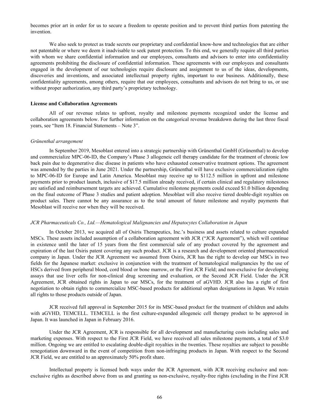 becomes prior art in order for us to secure a freedom to operate position and to prevent third parties from patenting the invention. We also seek to protect as trade secrets our proprietary and confidential know-how and technologies that are either not patentable or where we deem it inadvisable to seek patent protection. To this end, we generally require all third parties with whom we share confidential information and our employees, consultants and advisors to enter into confidentiality agreements prohibiting the disclosure of confidential information. These agreements with our employees and consultants engaged in the development of our technologies require disclosure and assignment to us of the ideas, developments, discoveries and inventions, and associated intellectual property rights, important to our business. Additionally, these confidentiality agreements, among others, require that our employees, consultants and advisors do not bring to us, or use without proper authorization, any third party’s proprietary technology. License and Collaboration Agreements All of our revenue relates to upfront, royalty and milestone payments recognized under the license and collaboration agreements below. For further information on the categorical revenue breakdown during the last three fiscal years, see “Item 18. Financial Statements – Note 3”. Grünenthal arrangement In September 2019, Mesoblast entered into a strategic partnership with Grünenthal GmbH (Grünenthal) to develop and commercialize MPC-06-ID, the Company’s Phase 3 allogeneic cell therapy candidate for the treatment of chronic low back pain due to degenerative disc disease in patients who have exhausted conservative treatment options. The agreement was amended by the parties in June 2021. Under the partnership, Grünenthal will have exclusive commercialization rights to MPC-06-ID for Europe and Latin America. Mesoblast may receive up to $112.5 million in upfront and milestone payments prior to product launch, inclusive of $17.5 million already received, if certain clinical and regulatory milestones are satisfied and reimbursement targets are achieved. Cumulative milestone payments could exceed $1.0 billion depending on the final outcome of Phase 3 studies and patient adoption. Mesoblast will also receive tiered double-digit royalties on product sales. There cannot be any assurance as to the total amount of future milestone and royalty payments that Mesoblast will receive nor when they will be received. JCR Pharmaceuticals Co., Ltd.—Hematological Malignancies and Hepatocytes Collaboration in Japan In October 2013, we acquired all of Osiris Therapeutics, Inc.’s business and assets related to culture expanded MSCs. These assets included assumption of a collaboration agreement with JCR (“JCR Agreement”), which will continue in existence until the later of 15 years from the first commercial sale of any product covered by the agreement and expiration of the last Osiris patent covering any such product. JCR is a research and development oriented pharmaceutical company in Japan. Under the JCR Agreement we assumed from Osiris, JCR has the right to develop our MSCs in two fields for the Japanese market: exclusive in conjunction with the treatment of hematological malignancies by the use of HSCs derived from peripheral blood, cord blood or bone marrow, or the First JCR Field; and non-exclusive for developing assays that use liver cells for non-clinical drug screening and evaluation, or the Second JCR Field. Under the JCR Agreement, JCR obtained rights in Japan to our MSCs, for the treatment of aGVHD. JCR also has a right of first negotiation to obtain rights to commercialize MSC-based products for additional orphan designations in Japan. We retain all rights to those products outside of Japan. JCR received full approval in September 2015 for its MSC-based product for the treatment of children and adults with aGVHD, TEMCELL. TEMCELL is the first culture-expanded allogeneic cell therapy product to be approved in Japan. It was launched in Japan in February 2016. Under the JCR Agreement, JCR is responsible for all development and manufacturing costs including sales and marketing expenses. With respect to the First JCR Field, we have received all sales milestone payments, a total of $3.0 million. Ongoing we are entitled to escalating double-digit royalties in the twenties. These royalties are subject to possible renegotiation downward in the event of competition from non-infringing products in Japan. With respect to the Second JCR Field, we are entitled to an approximately 50% profit share. Intellectual property is licensed both ways under the JCR Agreement, with JCR receiving exclusive and non- exclusive rights as described above from us and granting us non-exclusive, royalty-free rights (excluding in the First JCR 66