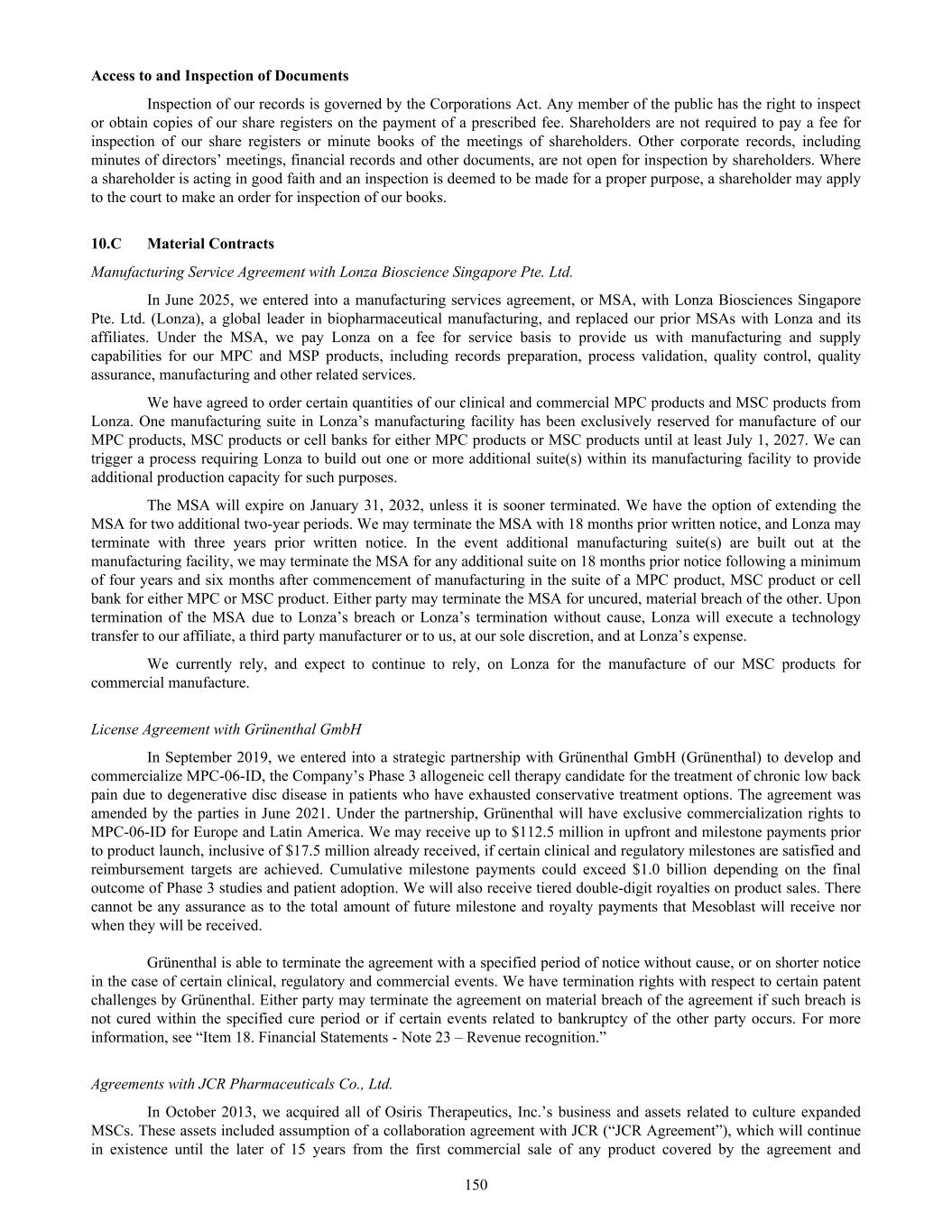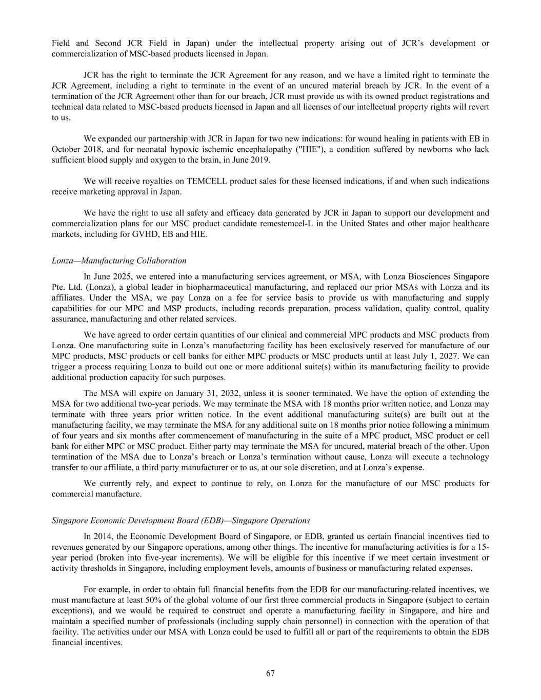 Field and Second JCR Field in Japan) under the intellectual property arising out of JCR’s development or commercialization of MSC-based products licensed in Japan. JCR has the right to terminate the JCR Agreement for any reason, and we have a limited right to terminate the JCR Agreement, including a right to terminate in the event of an uncured material breach by JCR. In the event of a termination of the JCR Agreement other than for our breach, JCR must provide us with its owned product registrations and technical data related to MSC-based products licensed in Japan and all licenses of our intellectual property rights will revert to us. We expanded our partnership with JCR in Japan for two new indications: for wound healing in patients with EB in October 2018, and for neonatal hypoxic ischemic encephalopathy ("HIE"), a condition suffered by newborns who lack sufficient blood supply and oxygen to the brain, in June 2019. We will receive royalties on TEMCELL product sales for these licensed indications, if and when such indications receive marketing approval in Japan. We have the right to use all safety and efficacy data generated by JCR in Japan to support our development and commercialization plans for our MSC product candidate remestemcel-L in the United States and other major healthcare markets, including for GVHD, EB and HIE. Lonza—Manufacturing Collaboration In June 2025, we entered into a manufacturing services agreement, or MSA, with Lonza Biosciences Singapore Pte. Ltd. (Lonza), a global leader in biopharmaceutical manufacturing, and replaced our prior MSAs with Lonza and its affiliates. Under the MSA, we pay Lonza on a fee for service basis to provide us with manufacturing and supply capabilities for our MPC and MSP products, including records preparation, process validation, quality control, quality assurance, manufacturing and other related services. We have agreed to order certain quantities of our clinical and commercial MPC products and MSC products from Lonza. One manufacturing suite in Lonza’s manufacturing facility has been exclusively reserved for manufacture of our MPC products, MSC products or cell banks for either MPC products or MSC products until at least July 1, 2027. We can trigger a process requiring Lonza to build out one or more additional suite(s) within its manufacturing facility to provide additional production capacity for such purposes. The MSA will expire on January 31, 2032, unless it is sooner terminated. We have the option of extending the MSA for two additional two-year periods. We may terminate the MSA with 18 months prior written notice, and Lonza may terminate with three years prior written notice. In the event additional manufacturing suite(s) are built out at the manufacturing facility, we may terminate the MSA for any additional suite on 18 months prior notice following a minimum of four years and six months after commencement of manufacturing in the suite of a MPC product, MSC product or cell bank for either MPC or MSC product. Either party may terminate the MSA for uncured, material breach of the other. Upon termination of the MSA due to Lonza’s breach or Lonza’s termination without cause, Lonza will execute a technology transfer to our affiliate, a third party manufacturer or to us, at our sole discretion, and at Lonza’s expense. We currently rely, and expect to continue to rely, on Lonza for the manufacture of our MSC products for commercial manufacture. Singapore Economic Development Board (EDB)—Singapore Operations In 2014, the Economic Development Board of Singapore, or EDB, granted us certain financial incentives tied to revenues generated by our Singapore operations, among other things. The incentive for manufacturing activities is for a 15- year period (broken into five-year increments). We will be eligible for this incentive if we meet certain investment or activity thresholds in Singapore, including employment levels, amounts of business or manufacturing related expenses. For example, in order to obtain full financial benefits from the EDB for our manufacturing-related incentives, we must manufacture at least 50% of the global volume of our first three commercial products in Singapore (subject to certain exceptions), and we would be required to construct and operate a manufacturing facility in Singapore, and hire and maintain a specified number of professionals (including supply chain personnel) in connection with the operation of that facility. The activities under our MSA with Lonza could be used to fulfill all or part of the requirements to obtain the EDB financial incentives. 67