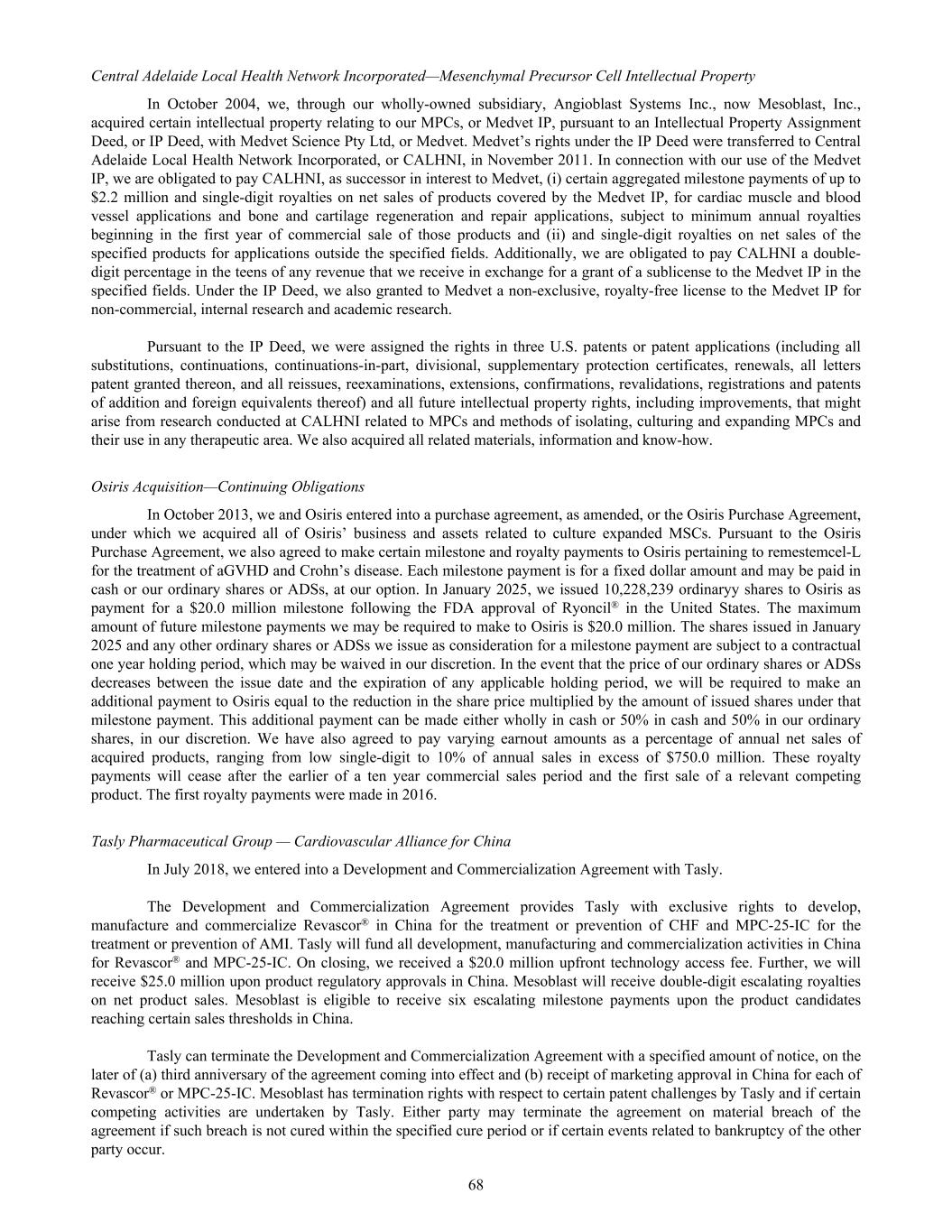 Central Adelaide Local Health Network Incorporated—Mesenchymal Precursor Cell Intellectual Property In October 2004, we, through our wholly-owned subsidiary, Angioblast Systems Inc., now Mesoblast, Inc., acquired certain intellectual property relating to our MPCs, or Medvet IP, pursuant to an Intellectual Property Assignment Deed, or IP Deed, with Medvet Science Pty Ltd, or Medvet. Medvet’s rights under the IP Deed were transferred to Central Adelaide Local Health Network Incorporated, or CALHNI, in November 2011. In connection with our use of the Medvet IP, we are obligated to pay CALHNI, as successor in interest to Medvet, (i) certain aggregated milestone payments of up to $2.2 million and single-digit royalties on net sales of products covered by the Medvet IP, for cardiac muscle and blood vessel applications and bone and cartilage regeneration and repair applications, subject to minimum annual royalties beginning in the first year of commercial sale of those products and (ii) and single-digit royalties on net sales of the specified products for applications outside the specified fields. Additionally, we are obligated to pay CALHNI a double- digit percentage in the teens of any revenue that we receive in exchange for a grant of a sublicense to the Medvet IP in the specified fields. Under the IP Deed, we also granted to Medvet a non-exclusive, royalty-free license to the Medvet IP for non-commercial, internal research and academic research. Pursuant to the IP Deed, we were assigned the rights in three U.S. patents or patent applications (including all substitutions, continuations, continuations-in-part, divisional, supplementary protection certificates, renewals, all letters patent granted thereon, and all reissues, reexaminations, extensions, confirmations, revalidations, registrations and patents of addition and foreign equivalents thereof) and all future intellectual property rights, including improvements, that might arise from research conducted at CALHNI related to MPCs and methods of isolating, culturing and expanding MPCs and their use in any therapeutic area. We also acquired all related materials, information and know-how. Osiris Acquisition—Continuing Obligations In October 2013, we and Osiris entered into a purchase agreement, as amended, or the Osiris Purchase Agreement, under which we acquired all of Osiris’ business and assets related to culture expanded MSCs. Pursuant to the Osiris Purchase Agreement, we also agreed to make certain milestone and royalty payments to Osiris pertaining to remestemcel-L for the treatment of aGVHD and Crohn’s disease. Each milestone payment is for a fixed dollar amount and may be paid in cash or our ordinary shares or ADSs, at our option. In January 2025, we issued 10,228,239 ordinaryy shares to Osiris as payment for a $20.0 million milestone following the FDA approval of Ryoncil® in the United States. The maximum amount of future milestone payments we may be required to make to Osiris is $20.0 million. The shares issued in January 2025 and any other ordinary shares or ADSs we issue as consideration for a milestone payment are subject to a contractual one year holding period, which may be waived in our discretion. In the event that the price of our ordinary shares or ADSs decreases between the issue date and the expiration of any applicable holding period, we will be required to make an additional payment to Osiris equal to the reduction in the share price multiplied by the amount of issued shares under that milestone payment. This additional payment can be made either wholly in cash or 50% in cash and 50% in our ordinary shares, in our discretion. We have also agreed to pay varying earnout amounts as a percentage of annual net sales of acquired products, ranging from low single-digit to 10% of annual sales in excess of $750.0 million. These royalty payments will cease after the earlier of a ten year commercial sales period and the first sale of a relevant competing product. The first royalty payments were made in 2016. Tasly Pharmaceutical Group — Cardiovascular Alliance for China In July 2018, we entered into a Development and Commercialization Agreement with Tasly. The Development and Commercialization Agreement provides Tasly with exclusive rights to develop, manufacture and commercialize Revascor® in China for the treatment or prevention of CHF and MPC-25-IC for the treatment or prevention of AMI. Tasly will fund all development, manufacturing and commercialization activities in China for Revascor® and MPC-25-IC. On closing, we received a $20.0 million upfront technology access fee. Further, we will receive $25.0 million upon product regulatory approvals in China. Mesoblast will receive double-digit escalating royalties on net product sales. Mesoblast is eligible to receive six escalating milestone payments upon the product candidates reaching certain sales thresholds in China. Tasly can terminate the Development and Commercialization Agreement with a specified amount of notice, on the later of (a) third anniversary of the agreement coming into effect and (b) receipt of marketing approval in China for each of Revascor® or MPC-25-IC. Mesoblast has termination rights with respect to certain patent challenges by Tasly and if certain competing activities are undertaken by Tasly. Either party may terminate the agreement on material breach of the agreement if such breach is not cured within the specified cure period or if certain events related to bankruptcy of the other party occur. 68