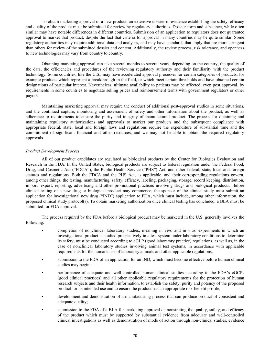 To obtain marketing approval of a new product, an extensive dossier of evidence establishing the safety, efficacy and quality of the product must be submitted for review by regulatory authorities. Dossier form and substance, while often similar may have notable differences in different countries. Submission of an application to regulators does not guarantee approval to market that product, despite the fact that criteria for approval in many countries may be quite similar. Some regulatory authorities may require additional data and analyses, and may have standards that apply that are more stringent than others for review of the submitted dossier and content. Additionally, the review process, risk tolerance, and openness to new technologies may vary from country to country. Obtaining marketing approval can take several months to several years, depending on the country, the quality of the data, the efficiencies and procedures of the reviewing regulatory authority and their familiarity with the product technology. Some countries, like the U.S., may have accelerated approval processes for certain categories of products, for example products which represent a breakthrough in the field, or which meet certain thresholds and have obtained certain designations of particular interest. Nevertheless, ultimate availability to patients may be affected, even post approval, by requirements in some countries to negotiate selling prices and reimbursement terms with government regulators or other payors. Maintaining marketing approval may require the conduct of additional post-approval studies in some situations, and the continued capture, monitoring and assessment of safety and other information about the product, as well as adherence to requirements to ensure the purity and integrity of manufactured product. The process for obtaining and maintaining regulatory authorizations and approvals to market our products and the subsequent compliance with appropriate federal, state, local and foreign laws and regulations require the expenditure of substantial time and the commitment of significant financial and other resources, and we may not be able to obtain the required regulatory approvals. Product Development Process All of our product candidates are regulated as biological products by the Center for Biologics Evaluation and Research in the FDA. In the United States, biological products are subject to federal regulation under the Federal Food, Drug, and Cosmetic Act (“FDCA”), the Public Health Service (“PHS”) Act, and other federal, state, local and foreign statutes and regulations. Both the FDCA and the PHS Act, as applicable, and their corresponding regulations govern, among other things, the testing, manufacturing, safety, efficacy, labeling, packaging, storage, record keeping, distribution, import, export, reporting, advertising and other promotional practices involving drugs and biological products. Before clinical testing of a new drug or biological product may commence, the sponsor of the clinical study must submit an application for investigational new drug (“IND”) application to FDA, which must include, among other information, the proposed clinical study protocol(s). To obtain marketing authorization once clinical testing has concluded, a BLA must be submitted for FDA approval. The process required by the FDA before a biological product may be marketed in the U.S. generally involves the following: • completion of nonclinical laboratory studies, meaning in vivo and in vitro experiments in which an investigational product is studied prospectively in a test system under laboratory conditions to determine its safety, must be conducted according to cGLP (good laboratory practice) regulations, as well as, in the case of nonclinical laboratory studies involving animal test systems, in accordance with applicable requirements for the humane use of laboratory animals and other applicable regulations; • submission to the FDA of an application for an IND, which must become effective before human clinical studies may begin; • performance of adequate and well-controlled human clinical studies according to the FDA’s cGCPs (good clinical practices) and all other applicable regulatory requirements for the protection of human research subjects and their health information, to establish the safety, purity and potency of the proposed product for its intended use and to ensure the product has an appropriate risk-benefit profile; • development and demonstration of a manufacturing process that can produce product of consistent and adequate quality; • submission to the FDA of a BLA for marketing approval demonstrating the quality, safety, and efficacy of the product which must be supported by substantial evidence from adequate and well-controlled clinical investigations as well as demonstration of mode of action through non-clinical studies, evidence 70