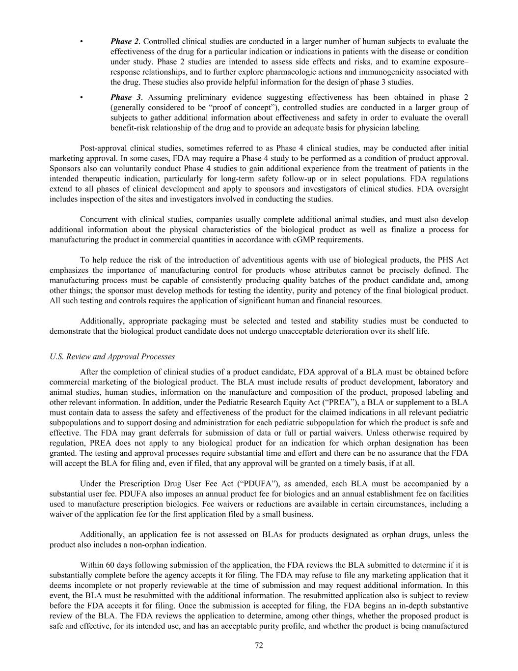 • Phase 2. Controlled clinical studies are conducted in a larger number of human subjects to evaluate the effectiveness of the drug for a particular indication or indications in patients with the disease or condition under study. Phase 2 studies are intended to assess side effects and risks, and to examine exposure– response relationships, and to further explore pharmacologic actions and immunogenicity associated with the drug. These studies also provide helpful information for the design of phase 3 studies. • Phase 3. Assuming preliminary evidence suggesting effectiveness has been obtained in phase 2 (generally considered to be “proof of concept”), controlled studies are conducted in a larger group of subjects to gather additional information about effectiveness and safety in order to evaluate the overall benefit-risk relationship of the drug and to provide an adequate basis for physician labeling. Post-approval clinical studies, sometimes referred to as Phase 4 clinical studies, may be conducted after initial marketing approval. In some cases, FDA may require a Phase 4 study to be performed as a condition of product approval. Sponsors also can voluntarily conduct Phase 4 studies to gain additional experience from the treatment of patients in the intended therapeutic indication, particularly for long-term safety follow-up or in select populations. FDA regulations extend to all phases of clinical development and apply to sponsors and investigators of clinical studies. FDA oversight includes inspection of the sites and investigators involved in conducting the studies. Concurrent with clinical studies, companies usually complete additional animal studies, and must also develop additional information about the physical characteristics of the biological product as well as finalize a process for manufacturing the product in commercial quantities in accordance with cGMP requirements. To help reduce the risk of the introduction of adventitious agents with use of biological products, the PHS Act emphasizes the importance of manufacturing control for products whose attributes cannot be precisely defined. The manufacturing process must be capable of consistently producing quality batches of the product candidate and, among other things; the sponsor must develop methods for testing the identity, purity and potency of the final biological product. All such testing and controls requires the application of significant human and financial resources. Additionally, appropriate packaging must be selected and tested and stability studies must be conducted to demonstrate that the biological product candidate does not undergo unacceptable deterioration over its shelf life. U.S. Review and Approval Processes After the completion of clinical studies of a product candidate, FDA approval of a BLA must be obtained before commercial marketing of the biological product. The BLA must include results of product development, laboratory and animal studies, human studies, information on the manufacture and composition of the product, proposed labeling and other relevant information. In addition, under the Pediatric Research Equity Act (“PREA”), a BLA or supplement to a BLA must contain data to assess the safety and effectiveness of the product for the claimed indications in all relevant pediatric subpopulations and to support dosing and administration for each pediatric subpopulation for which the product is safe and effective. The FDA may grant deferrals for submission of data or full or partial waivers. Unless otherwise required by regulation, PREA does not apply to any biological product for an indication for which orphan designation has been granted. The testing and approval processes require substantial time and effort and there can be no assurance that the FDA will accept the BLA for filing and, even if filed, that any approval will be granted on a timely basis, if at all. Under the Prescription Drug User Fee Act (“PDUFA”), as amended, each BLA must be accompanied by a substantial user fee. PDUFA also imposes an annual product fee for biologics and an annual establishment fee on facilities used to manufacture prescription biologics. Fee waivers or reductions are available in certain circumstances, including a waiver of the application fee for the first application filed by a small business. Additionally, an application fee is not assessed on BLAs for products designated as orphan drugs, unless the product also includes a non-orphan indication. Within 60 days following submission of the application, the FDA reviews the BLA submitted to determine if it is substantially complete before the agency accepts it for filing. The FDA may refuse to file any marketing application that it deems incomplete or not properly reviewable at the time of submission and may request additional information. In this event, the BLA must be resubmitted with the additional information. The resubmitted application also is subject to review before the FDA accepts it for filing. Once the submission is accepted for filing, the FDA begins an in-depth substantive review of the BLA. The FDA reviews the application to determine, among other things, whether the proposed product is safe and effective, for its intended use, and has an acceptable purity profile, and whether the product is being manufactured 72