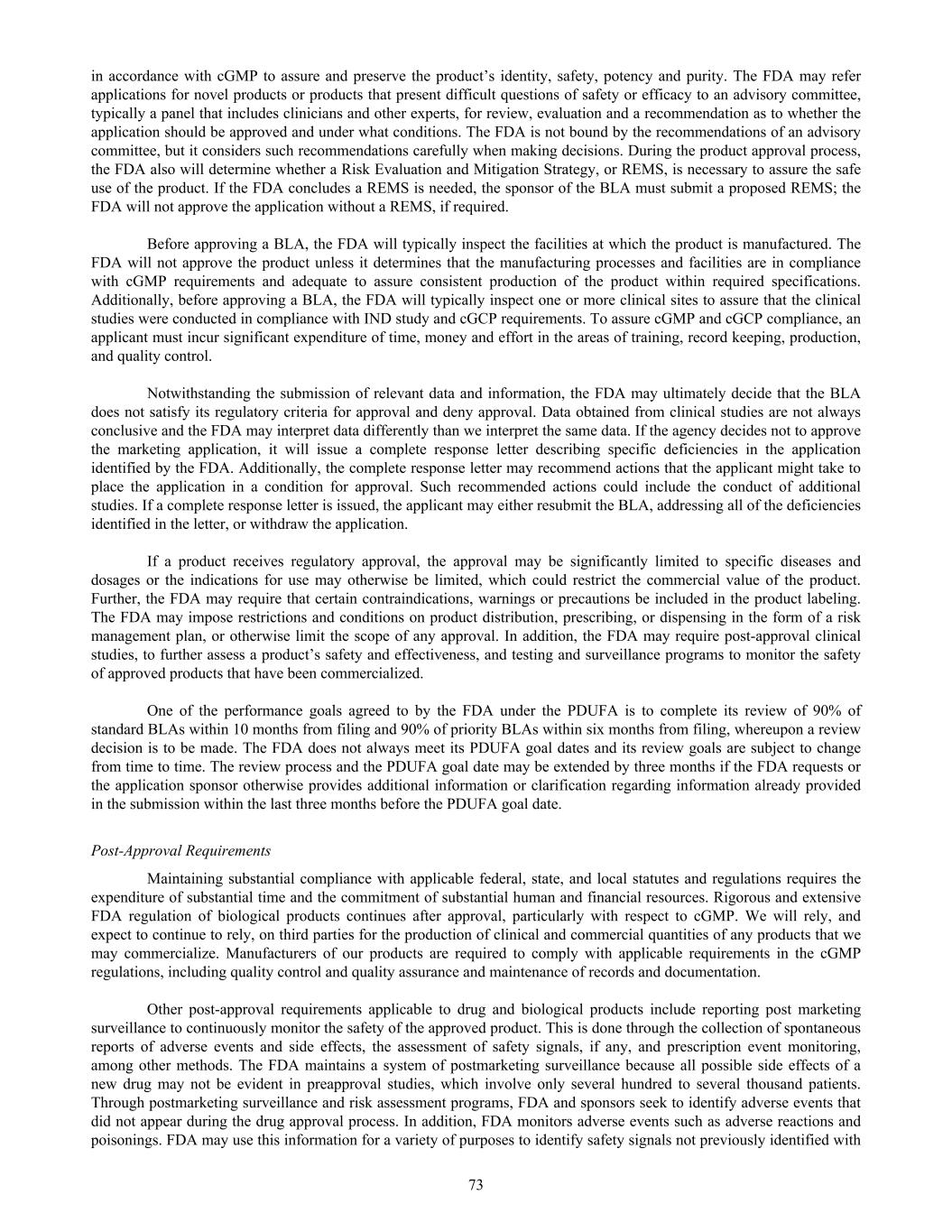 in accordance with cGMP to assure and preserve the product’s identity, safety, potency and purity. The FDA may refer applications for novel products or products that present difficult questions of safety or efficacy to an advisory committee, typically a panel that includes clinicians and other experts, for review, evaluation and a recommendation as to whether the application should be approved and under what conditions. The FDA is not bound by the recommendations of an advisory committee, but it considers such recommendations carefully when making decisions. During the product approval process, the FDA also will determine whether a Risk Evaluation and Mitigation Strategy, or REMS, is necessary to assure the safe use of the product. If the FDA concludes a REMS is needed, the sponsor of the BLA must submit a proposed REMS; the FDA will not approve the application without a REMS, if required. Before approving a BLA, the FDA will typically inspect the facilities at which the product is manufactured. The FDA will not approve the product unless it determines that the manufacturing processes and facilities are in compliance with cGMP requirements and adequate to assure consistent production of the product within required specifications. Additionally, before approving a BLA, the FDA will typically inspect one or more clinical sites to assure that the clinical studies were conducted in compliance with IND study and cGCP requirements. To assure cGMP and cGCP compliance, an applicant must incur significant expenditure of time, money and effort in the areas of training, record keeping, production, and quality control. Notwithstanding the submission of relevant data and information, the FDA may ultimately decide that the BLA does not satisfy its regulatory criteria for approval and deny approval. Data obtained from clinical studies are not always conclusive and the FDA may interpret data differently than we interpret the same data. If the agency decides not to approve the marketing application, it will issue a complete response letter describing specific deficiencies in the application identified by the FDA. Additionally, the complete response letter may recommend actions that the applicant might take to place the application in a condition for approval. Such recommended actions could include the conduct of additional studies. If a complete response letter is issued, the applicant may either resubmit the BLA, addressing all of the deficiencies identified in the letter, or withdraw the application. If a product receives regulatory approval, the approval may be significantly limited to specific diseases and dosages or the indications for use may otherwise be limited, which could restrict the commercial value of the product. Further, the FDA may require that certain contraindications, warnings or precautions be included in the product labeling. The FDA may impose restrictions and conditions on product distribution, prescribing, or dispensing in the form of a risk management plan, or otherwise limit the scope of any approval. In addition, the FDA may require post-approval clinical studies, to further assess a product’s safety and effectiveness, and testing and surveillance programs to monitor the safety of approved products that have been commercialized. One of the performance goals agreed to by the FDA under the PDUFA is to complete its review of 90% of standard BLAs within 10 months from filing and 90% of priority BLAs within six months from filing, whereupon a review decision is to be made. The FDA does not always meet its PDUFA goal dates and its review goals are subject to change from time to time. The review process and the PDUFA goal date may be extended by three months if the FDA requests or the application sponsor otherwise provides additional information or clarification regarding information already provided in the submission within the last three months before the PDUFA goal date. Post-Approval Requirements Maintaining substantial compliance with applicable federal, state, and local statutes and regulations requires the expenditure of substantial time and the commitment of substantial human and financial resources. Rigorous and extensive FDA regulation of biological products continues after approval, particularly with respect to cGMP. We will rely, and expect to continue to rely, on third parties for the production of clinical and commercial quantities of any products that we may commercialize. Manufacturers of our products are required to comply with applicable requirements in the cGMP regulations, including quality control and quality assurance and maintenance of records and documentation. Other post-approval requirements applicable to drug and biological products include reporting post marketing surveillance to continuously monitor the safety of the approved product. This is done through the collection of spontaneous reports of adverse events and side effects, the assessment of safety signals, if any, and prescription event monitoring, among other methods. The FDA maintains a system of postmarketing surveillance because all possible side effects of a new drug may not be evident in preapproval studies, which involve only several hundred to several thousand patients. Through postmarketing surveillance and risk assessment programs, FDA and sponsors seek to identify adverse events that did not appear during the drug approval process. In addition, FDA monitors adverse events such as adverse reactions and poisonings. FDA may use this information for a variety of purposes to identify safety signals not previously identified with 73