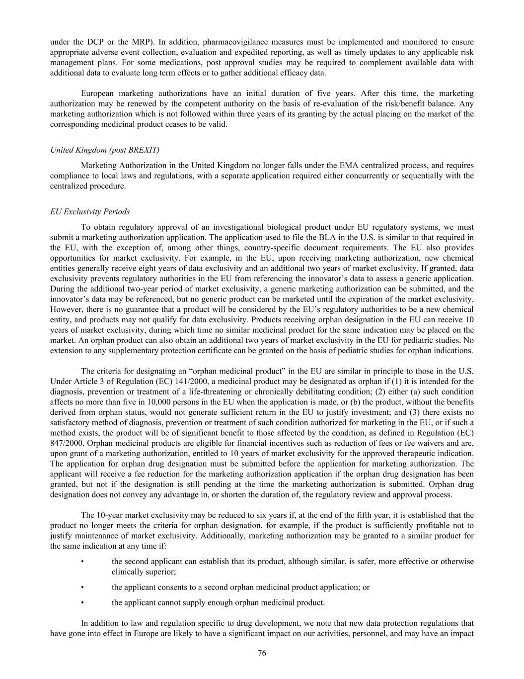 under the DCP or the MRP). In addition, pharmacovigilance measures must be implemented and monitored to ensure appropriate adverse event collection, evaluation and expedited reporting, as well as timely updates to any applicable risk management plans. For some medications, post approval studies may be required to complement available data with additional data to evaluate long term effects or to gather additional efficacy data. European marketing authorizations have an initial duration of five years. After this time, the marketing authorization may be renewed by the competent authority on the basis of re-evaluation of the risk/benefit balance. Any marketing authorization which is not followed within three years of its granting by the actual placing on the market of the corresponding medicinal product ceases to be valid. United Kingdom (post BREXIT) Marketing Authorization in the United Kingdom no longer falls under the EMA centralized process, and requires compliance to local laws and regulations, with a separate application required either concurrently or sequentially with the centralized procedure. EU Exclusivity Periods To obtain regulatory approval of an investigational biological product under EU regulatory systems, we must submit a marketing authorization application. The application used to file the BLA in the U.S. is similar to that required in the EU, with the exception of, among other things, country-specific document requirements. The EU also provides opportunities for market exclusivity. For example, in the EU, upon receiving marketing authorization, new chemical entities generally receive eight years of data exclusivity and an additional two years of market exclusivity. If granted, data exclusivity prevents regulatory authorities in the EU from referencing the innovator’s data to assess a generic application. During the additional two-year period of market exclusivity, a generic marketing authorization can be submitted, and the innovator’s data may be referenced, but no generic product can be marketed until the expiration of the market exclusivity. However, there is no guarantee that a product will be considered by the EU’s regulatory authorities to be a new chemical entity, and products may not qualify for data exclusivity. Products receiving orphan designation in the EU can receive 10 years of market exclusivity, during which time no similar medicinal product for the same indication may be placed on the market. An orphan product can also obtain an additional two years of market exclusivity in the EU for pediatric studies. No extension to any supplementary protection certificate can be granted on the basis of pediatric studies for orphan indications. The criteria for designating an “orphan medicinal product” in the EU are similar in principle to those in the U.S. Under Article 3 of Regulation (EC) 141/2000, a medicinal product may be designated as orphan if (1) it is intended for the diagnosis, prevention or treatment of a life-threatening or chronically debilitating condition; (2) either (a) such condition affects no more than five in 10,000 persons in the EU when the application is made, or (b) the product, without the benefits derived from orphan status, would not generate sufficient return in the EU to justify investment; and (3) there exists no satisfactory method of diagnosis, prevention or treatment of such condition authorized for marketing in the EU, or if such a method exists, the product will be of significant benefit to those affected by the condition, as defined in Regulation (EC) 847/2000. Orphan medicinal products are eligible for financial incentives such as reduction of fees or fee waivers and are, upon grant of a marketing authorization, entitled to 10 years of market exclusivity for the approved therapeutic indication. The application for orphan drug designation must be submitted before the application for marketing authorization. The applicant will receive a fee reduction for the marketing authorization application if the orphan drug designation has been granted, but not if the designation is still pending at the time the marketing authorization is submitted. Orphan drug designation does not convey any advantage in, or shorten the duration of, the regulatory review and approval process. The 10-year market exclusivity may be reduced to six years if, at the end of the fifth year, it is established that the product no longer meets the criteria for orphan designation, for example, if the product is sufficiently profitable not to justify maintenance of market exclusivity. Additionally, marketing authorization may be granted to a similar product for the same indication at any time if: • the second applicant can establish that its product, although similar, is safer, more effective or otherwise clinically superior; • the applicant consents to a second orphan medicinal product application; or • the applicant cannot supply enough orphan medicinal product. In addition to law and regulation specific to drug development, we note that new data protection regulations that have gone into effect in Europe are likely to have a significant impact on our activities, personnel, and may have an impact 76