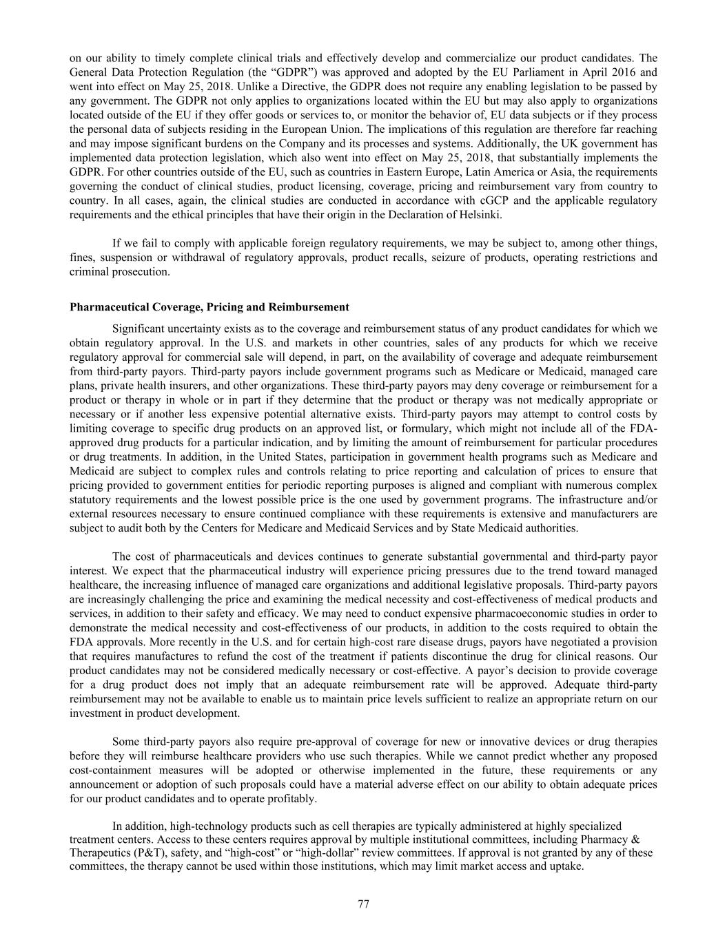 on our ability to timely complete clinical trials and effectively develop and commercialize our product candidates. The General Data Protection Regulation (the “GDPR”) was approved and adopted by the EU Parliament in April 2016 and went into effect on May 25, 2018. Unlike a Directive, the GDPR does not require any enabling legislation to be passed by any government. The GDPR not only applies to organizations located within the EU but may also apply to organizations located outside of the EU if they offer goods or services to, or monitor the behavior of, EU data subjects or if they process the personal data of subjects residing in the European Union. The implications of this regulation are therefore far reaching and may impose significant burdens on the Company and its processes and systems. Additionally, the UK government has implemented data protection legislation, which also went into effect on May 25, 2018, that substantially implements the GDPR. For other countries outside of the EU, such as countries in Eastern Europe, Latin America or Asia, the requirements governing the conduct of clinical studies, product licensing, coverage, pricing and reimbursement vary from country to country. In all cases, again, the clinical studies are conducted in accordance with cGCP and the applicable regulatory requirements and the ethical principles that have their origin in the Declaration of Helsinki. If we fail to comply with applicable foreign regulatory requirements, we may be subject to, among other things, fines, suspension or withdrawal of regulatory approvals, product recalls, seizure of products, operating restrictions and criminal prosecution. Pharmaceutical Coverage, Pricing and Reimbursement Significant uncertainty exists as to the coverage and reimbursement status of any product candidates for which we obtain regulatory approval. In the U.S. and markets in other countries, sales of any products for which we receive regulatory approval for commercial sale will depend, in part, on the availability of coverage and adequate reimbursement from third-party payors. Third-party payors include government programs such as Medicare or Medicaid, managed care plans, private health insurers, and other organizations. These third-party payors may deny coverage or reimbursement for a product or therapy in whole or in part if they determine that the product or therapy was not medically appropriate or necessary or if another less expensive potential alternative exists. Third-party payors may attempt to control costs by limiting coverage to specific drug products on an approved list, or formulary, which might not include all of the FDA- approved drug products for a particular indication, and by limiting the amount of reimbursement for particular procedures or drug treatments. In addition, in the United States, participation in government health programs such as Medicare and Medicaid are subject to complex rules and controls relating to price reporting and calculation of prices to ensure that pricing provided to government entities for periodic reporting purposes is aligned and compliant with numerous complex statutory requirements and the lowest possible price is the one used by government programs. The infrastructure and/or external resources necessary to ensure continued compliance with these requirements is extensive and manufacturers are subject to audit both by the Centers for Medicare and Medicaid Services and by State Medicaid authorities. The cost of pharmaceuticals and devices continues to generate substantial governmental and third-party payor interest. We expect that the pharmaceutical industry will experience pricing pressures due to the trend toward managed healthcare, the increasing influence of managed care organizations and additional legislative proposals. Third-party payors are increasingly challenging the price and examining the medical necessity and cost-effectiveness of medical products and services, in addition to their safety and efficacy. We may need to conduct expensive pharmacoeconomic studies in order to demonstrate the medical necessity and cost-effectiveness of our products, in addition to the costs required to obtain the FDA approvals. More recently in the U.S. and for certain high-cost rare disease drugs, payors have negotiated a provision that requires manufactures to refund the cost of the treatment if patients discontinue the drug for clinical reasons. Our product candidates may not be considered medically necessary or cost-effective. A payor’s decision to provide coverage for a drug product does not imply that an adequate reimbursement rate will be approved. Adequate third-party reimbursement may not be available to enable us to maintain price levels sufficient to realize an appropriate return on our investment in product development. Some third-party payors also require pre-approval of coverage for new or innovative devices or drug therapies before they will reimburse healthcare providers who use such therapies. While we cannot predict whether any proposed cost-containment measures will be adopted or otherwise implemented in the future, these requirements or any announcement or adoption of such proposals could have a material adverse effect on our ability to obtain adequate prices for our product candidates and to operate profitably. In addition, high-technology products such as cell therapies are typically administered at highly specialized treatment centers. Access to these centers requires approval by multiple institutional committees, including Pharmacy & Therapeutics (P&T), safety, and “high-cost” or “high-dollar” review committees. If approval is not granted by any of these committees, the therapy cannot be used within those institutions, which may limit market access and uptake. 77