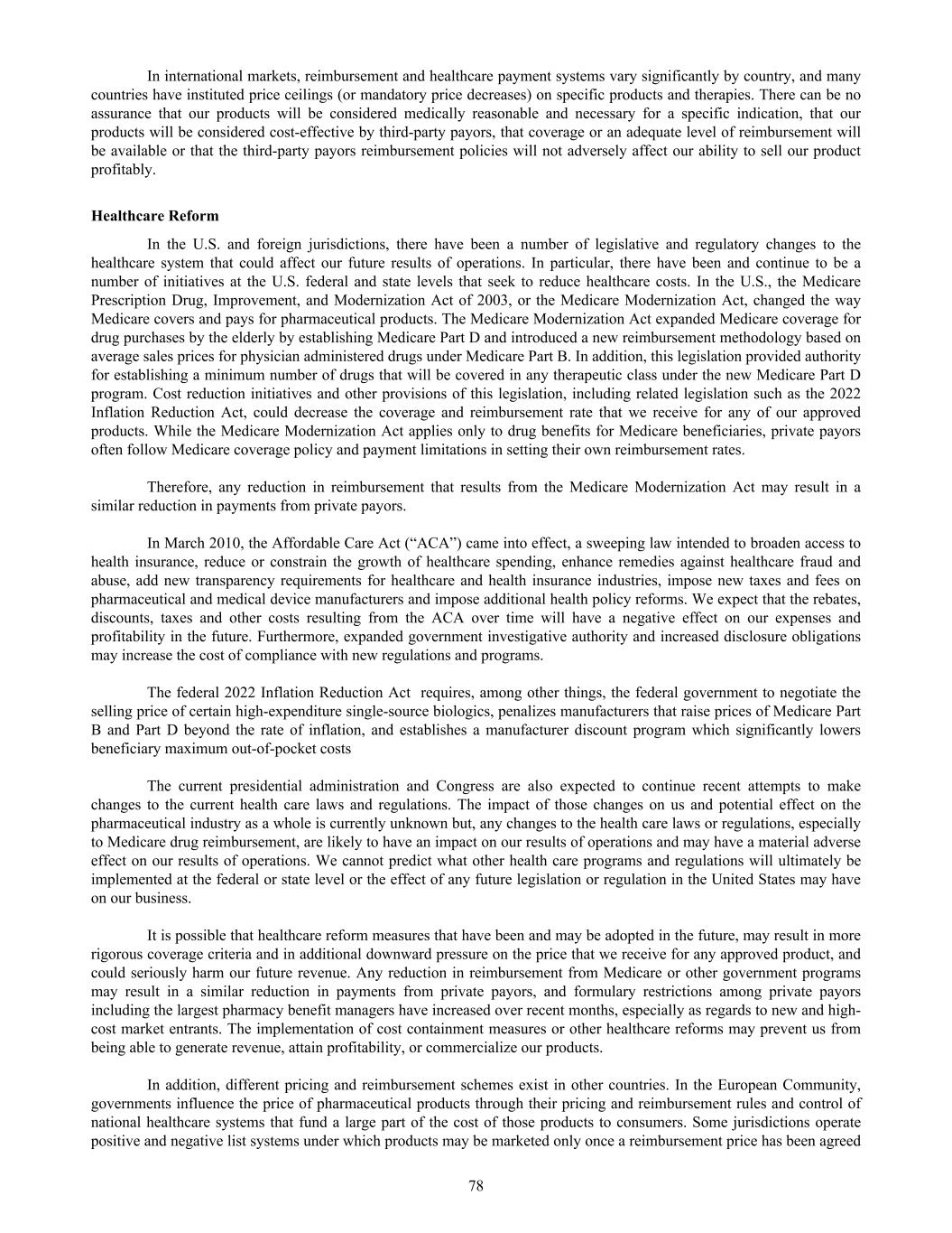 In international markets, reimbursement and healthcare payment systems vary significantly by country, and many countries have instituted price ceilings (or mandatory price decreases) on specific products and therapies. There can be no assurance that our products will be considered medically reasonable and necessary for a specific indication, that our products will be considered cost-effective by third-party payors, that coverage or an adequate level of reimbursement will be available or that the third-party payors reimbursement policies will not adversely affect our ability to sell our product profitably. Healthcare Reform In the U.S. and foreign jurisdictions, there have been a number of legislative and regulatory changes to the healthcare system that could affect our future results of operations. In particular, there have been and continue to be a number of initiatives at the U.S. federal and state levels that seek to reduce healthcare costs. In the U.S., the Medicare Prescription Drug, Improvement, and Modernization Act of 2003, or the Medicare Modernization Act, changed the way Medicare covers and pays for pharmaceutical products. The Medicare Modernization Act expanded Medicare coverage for drug purchases by the elderly by establishing Medicare Part D and introduced a new reimbursement methodology based on average sales prices for physician administered drugs under Medicare Part B. In addition, this legislation provided authority for establishing a minimum number of drugs that will be covered in any therapeutic class under the new Medicare Part D program. Cost reduction initiatives and other provisions of this legislation, including related legislation such as the 2022 Inflation Reduction Act, could decrease the coverage and reimbursement rate that we receive for any of our approved products. While the Medicare Modernization Act applies only to drug benefits for Medicare beneficiaries, private payors often follow Medicare coverage policy and payment limitations in setting their own reimbursement rates. Therefore, any reduction in reimbursement that results from the Medicare Modernization Act may result in a similar reduction in payments from private payors. In March 2010, the Affordable Care Act (“ACA”) came into effect, a sweeping law intended to broaden access to health insurance, reduce or constrain the growth of healthcare spending, enhance remedies against healthcare fraud and abuse, add new transparency requirements for healthcare and health insurance industries, impose new taxes and fees on pharmaceutical and medical device manufacturers and impose additional health policy reforms. We expect that the rebates, discounts, taxes and other costs resulting from the ACA over time will have a negative effect on our expenses and profitability in the future. Furthermore, expanded government investigative authority and increased disclosure obligations may increase the cost of compliance with new regulations and programs. The federal 2022 Inflation Reduction Act requires, among other things, the federal government to negotiate the selling price of certain high-expenditure single-source biologics, penalizes manufacturers that raise prices of Medicare Part B and Part D beyond the rate of inflation, and establishes a manufacturer discount program which significantly lowers beneficiary maximum out-of-pocket costs The current presidential administration and Congress are also expected to continue recent attempts to make changes to the current health care laws and regulations. The impact of those changes on us and potential effect on the pharmaceutical industry as a whole is currently unknown but, any changes to the health care laws or regulations, especially to Medicare drug reimbursement, are likely to have an impact on our results of operations and may have a material adverse effect on our results of operations. We cannot predict what other health care programs and regulations will ultimately be implemented at the federal or state level or the effect of any future legislation or regulation in the United States may have on our business. It is possible that healthcare reform measures that have been and may be adopted in the future, may result in more rigorous coverage criteria and in additional downward pressure on the price that we receive for any approved product, and could seriously harm our future revenue. Any reduction in reimbursement from Medicare or other government programs may result in a similar reduction in payments from private payors, and formulary restrictions among private payors including the largest pharmacy benefit managers have increased over recent months, especially as regards to new and high- cost market entrants. The implementation of cost containment measures or other healthcare reforms may prevent us from being able to generate revenue, attain profitability, or commercialize our products. In addition, different pricing and reimbursement schemes exist in other countries. In the European Community, governments influence the price of pharmaceutical products through their pricing and reimbursement rules and control of national healthcare systems that fund a large part of the cost of those products to consumers. Some jurisdictions operate positive and negative list systems under which products may be marketed only once a reimbursement price has been agreed 78