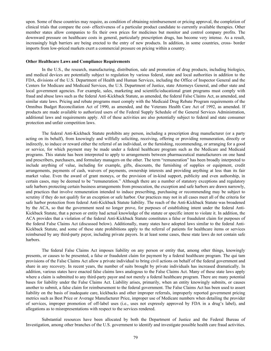 upon. Some of these countries may require, as condition of obtaining reimbursement or pricing approval, the completion of clinical trials that compare the cost- effectiveness of a particular product candidate to currently available therapies. Other member states allow companies to fix their own prices for medicines but monitor and control company profits. The downward pressure on healthcare costs in general, particularly prescription drugs, has become very intense. As a result, increasingly high barriers are being erected to the entry of new products. In addition, in some countries, cross- border imports from low-priced markets exert a commercial pressure on pricing within a country. Other Healthcare Laws and Compliance Requirements In the U.S., the research, manufacturing, distribution, sale and promotion of drug products, including biologics, and medical devices are potentially subject to regulation by various federal, state and local authorities in addition to the FDA, divisions of the U.S. Department of Health and Human Services, including the Office of Inspector General and the Centers for Medicare and Medicaid Services, the U.S. Department of Justice, state Attorneys General, and other state and local government agencies. For example, sales, marketing and scientific/educational grant programs must comply with fraud and abuse laws such as the federal Anti-Kickback Statute, as amended, the federal False Claims Act, as amended, and similar state laws. Pricing and rebate programs must comply with the Medicaid Drug Rebate Program requirements of the Omnibus Budget Reconciliation Act of 1990, as amended, and the Veterans Health Care Act of 1992, as amended. If products are made available to authorized users of the Federal Supply Schedule of the General Services Administration, additional laws and requirements apply. All of these activities are also potentially subject to federal and state consumer protection and unfair competition laws. The federal Anti-Kickback Statute prohibits any person, including a prescription drug manufacturer (or a party acting on its behalf), from knowingly and willfully soliciting, receiving, offering or providing remuneration, directly or indirectly, to induce or reward either the referral of an individual, or the furnishing, recommending, or arranging for a good or service, for which payment may be made under a federal healthcare program such as the Medicare and Medicaid programs. This statute has been interpreted to apply to arrangements between pharmaceutical manufacturers on one hand and prescribers, purchasers, and formulary managers on the other. The term “remuneration” has been broadly interpreted to include anything of value, including for example, gifts, discounts, the furnishing of supplies or equipment, credit arrangements, payments of cash, waivers of payments, ownership interests and providing anything at less than its fair market value. Even the award of grant moneys, or the provision of in-kind support, publicity and even authorship, in certain cases, may be deemed to be “remuneration.” Although there are a number of statutory exceptions and regulatory safe harbors protecting certain business arrangements from prosecution, the exception and safe harbors are drawn narrowly, and practices that involve remuneration intended to induce prescribing, purchasing or recommending may be subject to scrutiny if they do not qualify for an exception or safe harbor. Our practices may not in all cases meet all of the criteria for safe harbor protection from federal Anti-Kickback Statute liability. The reach of the Anti-Kickback Statute was broadened by the ACA, so that the government need no longer prove, for purposes of establishing intent under the federal Anti- Kickback Statute, that a person or entity had actual knowledge of the statute or specific intent to violate it. In addition, the ACA provides that a violation of the federal Anti-Kickback Statute constitutes a false or fraudulent claim for purposes of the federal False Claims Act (discussed below). Additionally, many states have adopted laws similar to the federal Anti- Kickback Statute, and some of these state prohibitions apply to the referral of patients for healthcare items or services reimbursed by any third-party payor, including private payors. In at least some cases, these state laws do not contain safe harbors. The federal False Claims Act imposes liability on any person or entity that, among other things, knowingly presents, or causes to be presented, a false or fraudulent claim for payment by a federal healthcare program. The qui tam provisions of the False Claims Act allow a private individual to bring civil actions on behalf of the federal government and share in any recovery. In recent years, the number of suits brought by private individuals has increased dramatically. In addition, various states have enacted false claims laws analogous to the False Claims Act. Many of these state laws apply where a claim is submitted to any third-party payor and not merely a federal healthcare program. There are many potential bases for liability under the False Claims Act. Liability arises, primarily, when an entity knowingly submits, or causes another to submit, a false claim for reimbursement to the federal government. The False Claims Act has been used to assert liability on the basis of inadequate care, kickbacks and other improper referrals, improperly reported government pricing metrics such as Best Price or Average Manufacturer Price, improper use of Medicare numbers when detailing the provider of services, improper promotion of off-label uses (i.e., uses not expressly approved by FDA in a drug’s label), and allegations as to misrepresentations with respect to the services rendered. Substantial resources have been allocated by both the Department of Justice and the Federal Bureau of Investigation, among other branches of the U.S. government to identify and investigate possible health 