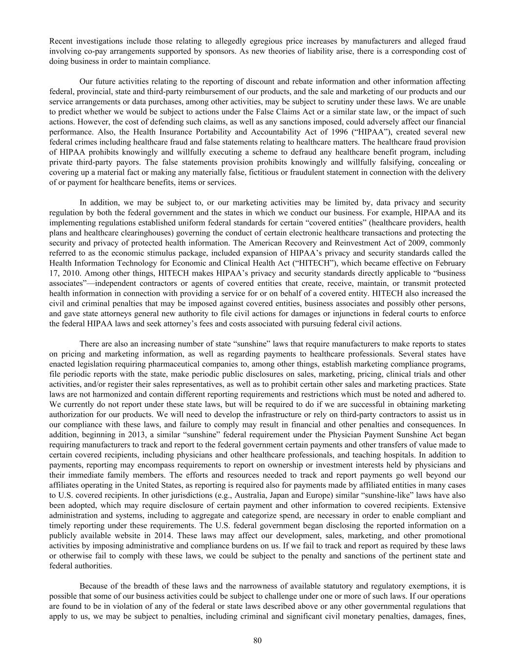 Recent investigations include those relating to allegedly egregious price increases by manufacturers and alleged fraud involving co-pay arrangements supported by sponsors. As new theories of liability arise, there is a corresponding cost of doing business in order to maintain compliance. Our future activities relating to the reporting of discount and rebate information and other information affecting federal, provincial, state and third-party reimbursement of our products, and the sale and marketing of our products and our service arrangements or data purchases, among other activities, may be subject to scrutiny under these laws. We are unable to predict whether we would be subject to actions under the False Claims Act or a similar state law, or the impact of such actions. However, the cost of defending such claims, as well as any sanctions imposed, could adversely affect our financial performance. Also, the Health Insurance Portability and Accountability Act of 1996 (“HIPAA”), created several new federal crimes including healthcare fraud and false statements relating to healthcare matters. The healthcare fraud provision of HIPAA prohibits knowingly and willfully executing a scheme to defraud any healthcare benefit program, including private third-party payors. The false statements provision prohibits knowingly and willfully falsifying, concealing or covering up a material fact or making any materially false, fictitious or fraudulent statement in connection with the delivery of or payment for healthcare benefits, items or services. In addition, we may be subject to, or our marketing activities may be limited by, data privacy and security regulation by both the federal government and the states in which we conduct our business. For example, HIPAA and its implementing regulations established uniform federal standards for certain “covered entities” (healthcare providers, health plans and healthcare clearinghouses) governing the conduct of certain electronic healthcare transactions and protecting the security and privacy of protected health information. The American Recovery and Reinvestment Act of 2009, commonly referred to as the economic stimulus package, included expansion of HIPAA’s privacy and security standards called the Health Information Technology for Economic and Clinical Health Act (“HITECH”), which became effective on February 17, 2010. Among other things, HITECH makes HIPAA’s privacy and security standards directly applicable to “business associates”—independent contractors or agents of covered entities that create, receive, maintain, or transmit protected health information in connection with providing a service for or on behalf of a covered entity. HITECH also increased the civil and criminal penalties that may be imposed against covered entities, business associates and possibly other persons, and gave state attorneys general new authority to file civil actions for damages or injunctions in federal courts to enforce the federal HIPAA laws and seek attorney’s fees and costs associated with pursuing federal civil actions. There are also an increasing number of state “sunshine” laws that require manufacturers to make reports to states on pricing and marketing information, as well as regarding payments to healthcare professionals. Several states have enacted legislation requiring pharmaceutical companies to, among other things, establish marketing compliance programs, file periodic reports with the state, make periodic public disclosures on sales, marketing, pricing, clinical trials and other activities, and/or register their sales representatives, as well as to prohibit certain other sales and marketing practices. State laws are not harmonized and contain different reporting requirements and restrictions which must be noted and adhered to. We currently do not report under these state laws, but will be required to do if we are successful in obtaining marketing authorization for our products. We will need to develop the infrastructure or rely on third-party contractors to assist us in our compliance with these laws, and failure to comply may result in financial and other penalties and consequences. In addition, beginning in 2013, a similar “sunshine” federal requirement under the Physician Payment Sunshine Act began requiring manufacturers to track and report to the federal government certain payments and other transfers of value made to certain covered recipients, including physicians and other healthcare professionals, and teaching hospitals. In addition to payments, reporting may encompass requirements to report on ownership or investment interests held by physicians and their immediate family members. The efforts and resources needed to track and report payments go well beyond our affiliates operating in the United States, as reporting is required also for payments made by affiliated entities in many cases to U.S. covered recipients. In other jurisdictions (e.g., Australia, Japan and Europe) similar “sunshine-like” laws have also been adopted, which may require disclosure of certain payment and other information to covered recipients. Extensive administration and systems, including to aggregate and categorize spend, are necessary in order to enable compliant and timely reporting under these requirements. The U.S. federal government began disclosing the reported information on a publicly available website in 2014. These laws may affect our development, sales, marketing, and other promotional activities by imposing administrative and compliance burdens on us. If we fail to track and report as required by these laws or otherwise fail to comply with these laws, we could be subject to the penalty and sanctions of the pertinent state and federal authorities. Because of the breadth of these laws and the narrowness of available statutory and regulatory exemptions, it is possible that some of our business activities could be subject to challenge un