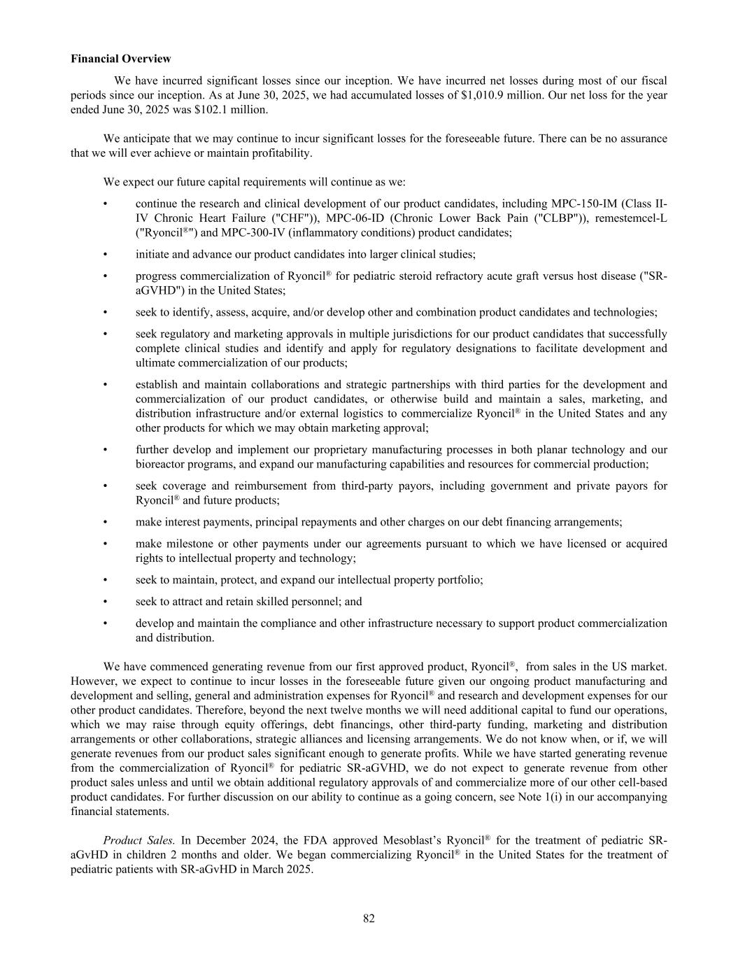 Financial Overview We have incurred significant losses since our inception. We have incurred net losses during most of our fiscal periods since our inception. As at June 30, 2025, we had accumulated losses of $1,010.9 million. Our net loss for the year ended June 30, 2025 was $102.1 million. We anticipate that we may continue to incur significant losses for the foreseeable future. There can be no assurance that we will ever achieve or maintain profitability. We expect our future capital requirements will continue as we: • continue the research and clinical development of our product candidates, including MPC-150-IM (Class II- IV Chronic Heart Failure ("CHF")), MPC-06-ID (Chronic Lower Back Pain ("CLBP")), remestemcel-L ("Ryoncil®") and MPC-300-IV (inflammatory conditions) product candidates; • initiate and advance our product candidates into larger clinical studies; • progress commercialization of Ryoncil® for pediatric steroid refractory acute graft versus host disease ("SR- aGVHD") in the United States; • seek to identify, assess, acquire, and/or develop other and combination product candidates and technologies; • seek regulatory and marketing approvals in multiple jurisdictions for our product candidates that successfully complete clinical studies and identify and apply for regulatory designations to facilitate development and ultimate commercialization of our products; • establish and maintain collaborations and strategic partnerships with third parties for the development and commercialization of our product candidates, or otherwise build and maintain a sales, marketing, and distribution infrastructure and/or external logistics to commercialize Ryoncil® in the United States and any other products for which we may obtain marketing approval; • further develop and implement our proprietary manufacturing processes in both planar technology and our bioreactor programs, and expand our manufacturing capabilities and resources for commercial production; • seek coverage and reimbursement from third-party payors, including government and private payors for Ryoncil® and future products; • make interest payments, principal repayments and other charges on our debt financing arrangements; • make milestone or other payments under our agreements pursuant to which we have licensed or acquired rights to intellectual property and technology; • seek to maintain, protect, and expand our intellectual property portfolio; • seek to attract and retain skilled personnel; and • develop and maintain the compliance and other infrastructure necessary to support product commercialization and distribution. We have commenced generating revenue from our first approved product, Ryoncil®, from sales in the US market. However, we expect to continue to incur losses in the foreseeable future given our ongoing product manufacturing and development and selling, general and administration expenses for Ryoncil® and research and development expenses for our other product candidates. Therefore, beyond the next twelve months we will need additional capital to fund our operations, which we may raise through equity offerings, debt financings, other third-party funding, marketing and distribution arrangements or other collaborations, strategic alliances and licensing arrangements. We do not know when, or if, we will generate revenues from our product sales significant enough to generate profits. While we have started generating revenue from the commercialization of Ryoncil® for pediatric SR-aGVHD, we do not expect to generate revenue from other product sales unless and until we obtain additional regulatory approvals of and commercialize more of our other cell-based product candidates. For further discussion on our ability to continue as a going concern, see Note 1(i) in our accompanying financial statements. Product Sales. In December 2024, the FDA approved Mesoblast’s Ryoncil® for the treatment of pediatric SR- aGvHD in children 2 months and older. We began commercializing Ryoncil® in the United States for the treatment of pediatric patients with SR-aGvHD in March 2025. 82