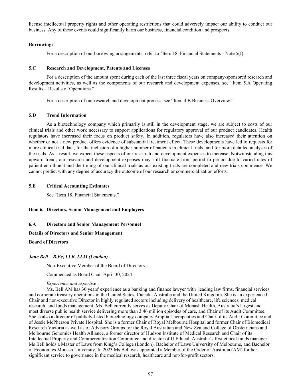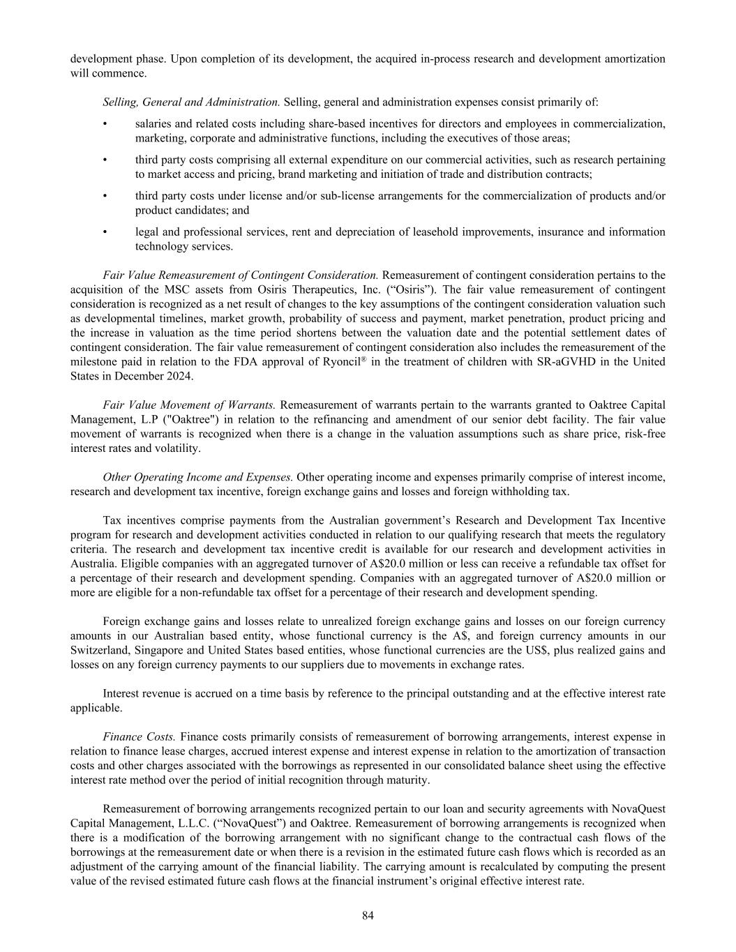 development phase. Upon completion of its development, the acquired in-process research and development amortization will commence. Selling, General and Administration. Selling, general and administration expenses consist primarily of: • salaries and related costs including share-based incentives for directors and employees in commercialization, marketing, corporate and administrative functions, including the executives of those areas; • third party costs comprising all external expenditure on our commercial activities, such as research pertaining to market access and pricing, brand marketing and initiation of trade and distribution contracts; • third party costs under license and/or sub-license arrangements for the commercialization of products and/or product candidates; and • legal and professional services, rent and depreciation of leasehold improvements, insurance and information technology services. Fair Value Remeasurement of Contingent Consideration. Remeasurement of contingent consideration pertains to the acquisition of the MSC assets from Osiris Therapeutics, Inc. (“Osiris”). The fair value remeasurement of contingent consideration is recognized as a net result of changes to the key assumptions of the contingent consideration valuation such as developmental timelines, market growth, probability of success and payment, market penetration, product pricing and the increase in valuation as the time period shortens between the valuation date and the potential settlement dates of contingent consideration. The fair value remeasurement of contingent consideration also includes the remeasurement of the milestone paid in relation to the FDA approval of Ryoncil® in the treatment of children with SR-aGVHD in the United States in December 2024. Fair Value Movement of Warrants. Remeasurement of warrants pertain to the warrants granted to Oaktree Capital Management, L.P ("Oaktree") in relation to the refinancing and amendment of our senior debt facility. The fair value movement of warrants is recognized when there is a change in the valuation assumptions such as share price, risk-free interest rates and volatility. Other Operating Income and Expenses. Other operating income and expenses primarily comprise of interest income, research and development tax incentive, foreign exchange gains and losses and foreign withholding tax. Tax incentives comprise payments from the Australian government’s Research and Development Tax Incentive program for research and development activities conducted in relation to our qualifying research that meets the regulatory criteria. The research and development tax incentive credit is available for our research and development activities in Australia. Eligible companies with an aggregated turnover of A$20.0 million or less can receive a refundable tax offset for a percentage of their research and development spending. Companies with an aggregated turnover of A$20.0 million or more are eligible for a non-refundable tax offset for a percentage of their research and development spending. Foreign exchange gains and losses relate to unrealized foreign exchange gains and losses on our foreign currency amounts in our Australian based entity, whose functional currency is the A$, and foreign currency amounts in our Switzerland, Singapore and United States based entities, whose functional currencies are the US$, plus realized gains and losses on any foreign currency payments to our suppliers due to movements in exchange rates. Interest revenue is accrued on a time basis by reference to the principal outstanding and at the effective interest rate applicable. Finance Costs. Finance costs primarily consists of remeasurement of borrowing arrangements, interest expense in relation to finance lease charges, accrued interest expense and interest expense in relation to the amortization of transaction costs and other charges associated with the borrowings as represented in our consolidated balance sheet using the effective interest rate method over the period of initial recognition through maturity. Remeasurement of borrowing arrangements recognized pertain to our loan and security agreements with NovaQuest Capital Management, L.L.C. (“NovaQuest”) and Oaktree. Remeasurement of borrowing arrangements is recognized when there is a modification of the borrowing arrangement with no significant change to the contractual cash flows of the borrowings at the remeasurement date or when there is a revision in the estimated future cash flows which is recorded as an adjustment of the carrying amount of the financial liability. The carrying amount is recalculated by computing the present value of the revised estimated future cash flows at the financial instrument’s original effective interest rate. 84