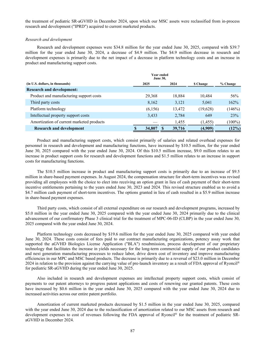 the treatment of pediatric SR-aGVHD in December 2024, upon which our MSC assets were reclassified from in-process research and development ("IPRD") acquired to current marketed products. Research and development Research and development expenses were $34.8 million for the year ended June 30, 2025, compared with $39.7 million for the year ended June 30, 2024, a decrease of $4.9 million. The $4.9 million decrease in research and development expenses is primarily due to the net impact of a decrease in platform technology costs and an increase in product and manufacturing support costs. Year ended June 30, (in U.S. dollars, in thousands) 2025 2024 $ Change % Change Research and development: Product and manufacturing support costs 29,368 18,884 10,484 56% Third party costs 8,162 3,121 5,041 162% Platform technology (6,156) 13,472 (19,628) (146%) Intellectual property support costs 3,433 2,784 649 23% Amortization of current marketed products — 1,455 (1,455) (100%) Research and development $ 34,807 $ 39,716 (4,909) (12%) Product and manufacturing support costs, which consist primarily of salaries and related overhead expenses for personnel in research and development and manufacturing functions, have increased by $10.5 million, for the year ended June 30, 2025 compared with the year ended June 30, 2024. Of this $10.5 million increase, $9.0 million relates to an increase in product support costs for research and development functions and $1.5 million relates to an increase in support costs for manufacturing functions. The $10.5 million increase in product and manufacturing support costs is primarily due to an increase of $9.5 million in share-based payment expenses. In August 2024, the compensation structure for short-term incentives was revised providing all employees with the choice to elect into receiving an option grant in lieu of cash payment of their short-term incentive entitlements pertaining to the years ended June 30, 2023 and 2024. This revised structure enabled us to avoid a $4.7 million cash payment of short-term incentives. The options granted in lieu of cash resulted in a $5.9 million increase in share-based payment expenses. Third party costs, which consist of all external expenditure on our research and development programs, increased by $5.0 million in the year ended June 30, 2025 compared with the year ended June 30, 2024 primarily due to the clinical advancement of our confirmatory Phase 3 clinical trial for the treatment of MPC-06-ID (CLBP) in the year ended June 30, 2025 compared with the year ended June 30, 2024. Platform technology costs decreased by $19.6 million for the year ended June 30, 2025 compared with year ended June 30, 2024. These costs consist of fees paid to our contract manufacturing organizations, potency assay work that supported the aGVHD Biologics License Application ("BLA") resubmission, process development of our proprietary technology that facilitates the increase in yields necessary for the long-term commercial supply of our product candidates and next generation manufacturing processes to reduce labor, drive down cost of inventory and improve manufacturing efficiencies in our MPC and MSC based products. The decrease is primarily due to a reversal of $23.0 million in December 2024 in relation to the provision against the carrying value of pre-launch inventory as a result of FDA approval of Ryoncil® for pediatric SR-aGVHD during the year ended June 30, 2025. Also included in research and development expenses are intellectual property support costs, which consist of payments to our patent attorneys to progress patent applications and costs of renewing our granted patents. These costs have increased by $0.6 million in the year ended June 30, 2025 compared with the year ended June 30, 2024 due to increased activities across our entire patent portfolio. Amortization of current marketed products decreased by $1.5 million in the year ended June 30, 2025, compared with the year ended June 30, 2024 due to the reclassification of amortization related to our MSC assets from research and development expenses to cost of revenues following the FDA approval of Ryoncil® for the treatment of pediatric SR- aGVHD in December 2024. 87