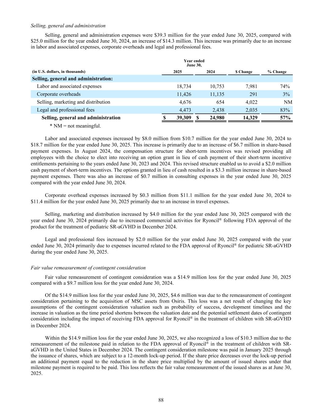 Selling, general and administration Selling, general and administration expenses were $39.3 million for the year ended June 30, 2025, compared with $25.0 million for the year ended June 30, 2024, an increase of $14.3 million. This increase was primarily due to an increase in labor and associated expenses, corporate overheads and legal and professional fees. Year ended June 30, (in U.S. dollars, in thousands) 2025 2024 $ Change % Change Selling, general and administration: Labor and associated expenses 18,734 10,753 7,981 74% Corporate overheads 11,426 11,135 291 3% Selling, marketing and distribution 4,676 654 4,022 NM Legal and professional fees 4,473 2,438 2,035 83% Selling, general and administration $ 39,309 $ 24,980 14,329 57% * NM = not meaningful. Labor and associated expenses increased by $8.0 million from $10.7 million for the year ended June 30, 2024 to $18.7 million for the year ended June 30, 2025. This increase is primarily due to an increase of $6.7 million in share-based payment expenses. In August 2024, the compensation structure for short-term incentives was revised providing all employees with the choice to elect into receiving an option grant in lieu of cash payment of their short-term incentive entitlements pertaining to the years ended June 30, 2023 and 2024. This revised structure enabled us to avoid a $2.0 million cash payment of short-term incentives. The options granted in lieu of cash resulted in a $3.3 million increase in share-based payment expenses. There was also an increase of $0.7 million in consulting expenses in the year ended June 30, 2025 compared with the year ended June 30, 2024. Corporate overhead expenses increased by $0.3 million from $11.1 million for the year ended June 30, 2024 to $11.4 million for the year ended June 30, 2025 primarily due to an increase in travel expenses. Selling, marketing and distribution increased by $4.0 million for the year ended June 30, 2025 compared with the year ended June 30, 2024 primarily due to increased commercial activities for Ryoncil® following FDA approval of the product for the treatment of pediatric SR-aGVHD in December 2024. Legal and professional fees increased by $2.0 million for the year ended June 30, 2025 compared with the year ended June 30, 2024 primarily due to expenses incurred related to the FDA approval of Ryoncil® for pediatric SR-aGVHD during the year ended June 30, 2025. Fair value remeasurement of contingent consideration Fair value remeasurement of contingent consideration was a $14.9 million loss for the year ended June 30, 2025 compared with a $9.7 million loss for the year ended June 30, 2024. Of the $14.9 million loss for the year ended June 30, 2025, $4.6 million was due to the remeasurement of contingent consideration pertaining to the acquisition of MSC assets from Osiris. This loss was a net result of changing the key assumptions of the contingent consideration valuation such as probability of success, development timelines and the increase in valuation as the time period shortens between the valuation date and the potential settlement dates of contingent consideration including the impact of receiving FDA approval for Ryoncil® in the treatment of children with SR-aGVHD in December 2024. Within the $14.9 million loss for the year ended June 30, 2025, we also recognized a loss of $10.3 million due to the remeasurement of the milestone paid in relation to the FDA approval of Ryoncil® in the treatment of children with SR- aGVHD in the United States in December 2024. The contingent consideration milestone was paid in January 2025 through the issuance of shares, which are subject to a 12-month lock-up period. If the share price decreases over the lock-up period an additional payment equal to the reduction in the share price multiplied by the amount of issued shares under that milestone payment is required to be paid. This loss reflects the fair value remeasurement of the issued shares as at June 30, 2025. 88