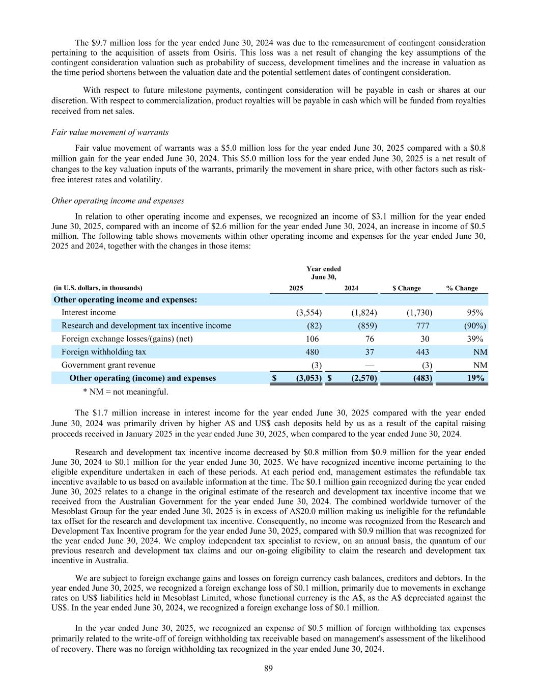 The $9.7 million loss for the year ended June 30, 2024 was due to the remeasurement of contingent consideration pertaining to the acquisition of assets from Osiris. This loss was a net result of changing the key assumptions of the contingent consideration valuation such as probability of success, development timelines and the increase in valuation as the time period shortens between the valuation date and the potential settlement dates of contingent consideration. With respect to future milestone payments, contingent consideration will be payable in cash or shares at our discretion. With respect to commercialization, product royalties will be payable in cash which will be funded from royalties received from net sales. Fair value movement of warrants Fair value movement of warrants was a $5.0 million loss for the year ended June 30, 2025 compared with a $0.8 million gain for the year ended June 30, 2024. This $5.0 million loss for the year ended June 30, 2025 is a net result of changes to the key valuation inputs of the warrants, primarily the movement in share price, with other factors such as risk- free interest rates and volatility. Other operating income and expenses In relation to other operating income and expenses, we recognized an income of $3.1 million for the year ended June 30, 2025, compared with an income of $2.6 million for the year ended June 30, 2024, an increase in income of $0.5 million. The following table shows movements within other operating income and expenses for the year ended June 30, 2025 and 2024, together with the changes in those items: Year ended June 30, (in U.S. dollars, in thousands) 2025 2024 $ Change % Change Other operating income and expenses: Interest income (3,554) (1,824) (1,730) 95% Research and development tax incentive income (82) (859) 777 (90%) Foreign exchange losses/(gains) (net) 106 76 30 39% Foreign withholding tax 480 37 443 NM Government grant revenue (3) — (3) NM Other operating (income) and expenses $ (3,053) $ (2,570) (483) 19% * NM = not meaningful. The $1.7 million increase in interest income for the year ended June 30, 2025 compared with the year ended June 30, 2024 was primarily driven by higher A$ and US$ cash deposits held by us as a result of the capital raising proceeds received in January 2025 in the year ended June 30, 2025, when compared to the year ended June 30, 2024. Research and development tax incentive income decreased by $0.8 million from $0.9 million for the year ended June 30, 2024 to $0.1 million for the year ended June 30, 2025. We have recognized incentive income pertaining to the eligible expenditure undertaken in each of these periods. At each period end, management estimates the refundable tax incentive available to us based on available information at the time. The $0.1 million gain recognized during the year ended June 30, 2025 relates to a change in the original estimate of the research and development tax incentive income that we received from the Australian Government for the year ended June 30, 2024. The combined worldwide turnover of the Mesoblast Group for the year ended June 30, 2025 is in excess of A$20.0 million making us ineligible for the refundable tax offset for the research and development tax incentive. Consequently, no income was recognized from the Research and Development Tax Incentive program for the year ended June 30, 2025, compared with $0.9 million that was recognized for the year ended June 30, 2024. We employ independent tax specialist to review, on an annual basis, the quantum of our previous research and development tax claims and our on-going eligibility to claim the research and development tax incentive in Australia. We are subject to foreign exchange gains and losses on foreign currency cash balances, creditors and debtors. In the year ended June 30, 2025, we recognized a foreign exchange loss of $0.1 million, primarily due to movements in exchange rates on US$ liabilities held in Mesoblast Limited, whose functional currency is the A$, as the A$ depreciated against the US$. In the year ended June 30, 2024, we recognized a foreign exchange loss of $0.1 million. In the year ended June 30, 2025, we recognized an expense of $0.5 million of foreign withholding tax expenses primarily related to the write-off of foreign withholding tax receivable based on management's assessment of the likelihood of recovery. There was no foreign withholding tax recognized in the year ended June 30, 2024. 89