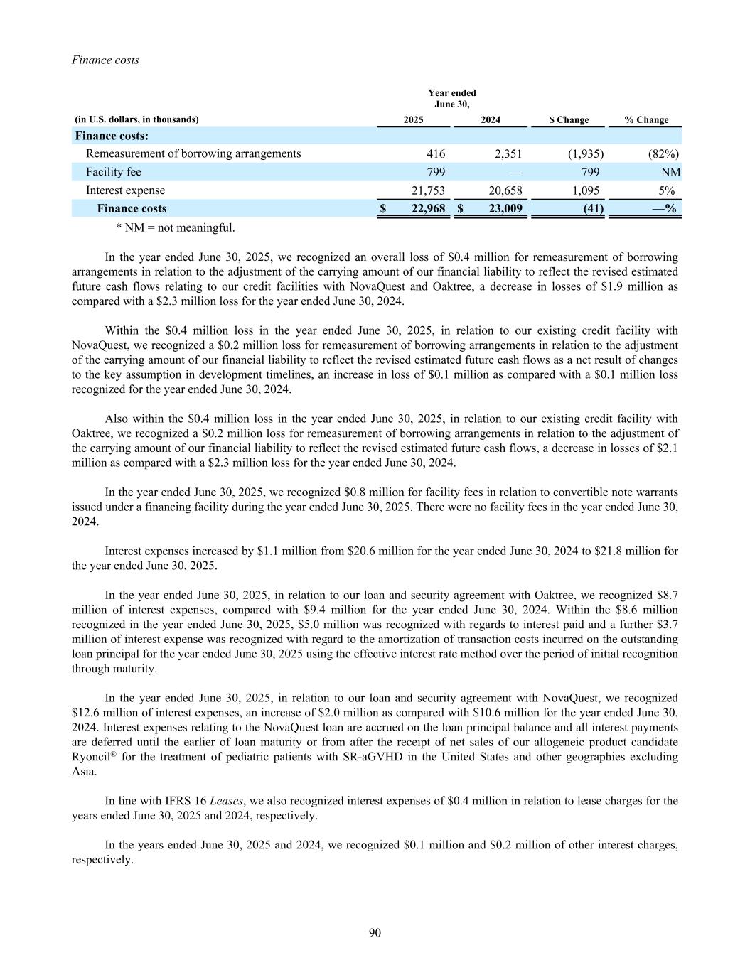 Finance costs Year ended June 30, (in U.S. dollars, in thousands) 2025 2024 $ Change % Change Finance costs: Remeasurement of borrowing arrangements 416 2,351 (1,935) (82%) Facility fee 799 — 799 NM Interest expense 21,753 20,658 1,095 5% Finance costs $ 22,968 $ 23,009 (41) —% * NM = not meaningful. In the year ended June 30, 2025, we recognized an overall loss of $0.4 million for remeasurement of borrowing arrangements in relation to the adjustment of the carrying amount of our financial liability to reflect the revised estimated future cash flows relating to our credit facilities with NovaQuest and Oaktree, a decrease in losses of $1.9 million as compared with a $2.3 million loss for the year ended June 30, 2024. Within the $0.4 million loss in the year ended June 30, 2025, in relation to our existing credit facility with NovaQuest, we recognized a $0.2 million loss for remeasurement of borrowing arrangements in relation to the adjustment of the carrying amount of our financial liability to reflect the revised estimated future cash flows as a net result of changes to the key assumption in development timelines, an increase in loss of $0.1 million as compared with a $0.1 million loss recognized for the year ended June 30, 2024. Also within the $0.4 million loss in the year ended June 30, 2025, in relation to our existing credit facility with Oaktree, we recognized a $0.2 million loss for remeasurement of borrowing arrangements in relation to the adjustment of the carrying amount of our financial liability to reflect the revised estimated future cash flows, a decrease in losses of $2.1 million as compared with a $2.3 million loss for the year ended June 30, 2024. In the year ended June 30, 2025, we recognized $0.8 million for facility fees in relation to convertible note warrants issued under a financing facility during the year ended June 30, 2025. There were no facility fees in the year ended June 30, 2024. Interest expenses increased by $1.1 million from $20.6 million for the year ended June 30, 2024 to $21.8 million for the year ended June 30, 2025. In the year ended June 30, 2025, in relation to our loan and security agreement with Oaktree, we recognized $8.7 million of interest expenses, compared with $9.4 million for the year ended June 30, 2024. Within the $8.6 million recognized in the year ended June 30, 2025, $5.0 million was recognized with regards to interest paid and a further $3.7 million of interest expense was recognized with regard to the amortization of transaction costs incurred on the outstanding loan principal for the year ended June 30, 2025 using the effective interest rate method over the period of initial recognition through maturity. In the year ended June 30, 2025, in relation to our loan and security agreement with NovaQuest, we recognized $12.6 million of interest expenses, an increase of $2.0 million as compared with $10.6 million for the year ended June 30, 2024. Interest expenses relating to the NovaQuest loan are accrued on the loan principal balance and all interest payments are deferred until the earlier of loan maturity or from after the receipt of net sales of our allogeneic product candidate Ryoncil® for the treatment of pediatric patients with SR-aGVHD in the United States and other geographies excluding Asia. In line with IFRS 16 Leases, we also recognized interest expenses of $0.4 million in relation to lease charges for the years ended June 30, 2025 and 2024, respectively. In the years ended June 30, 2025 and 2024, we recognized $0.1 million and $0.2 million of other interest charges, respectively. 90