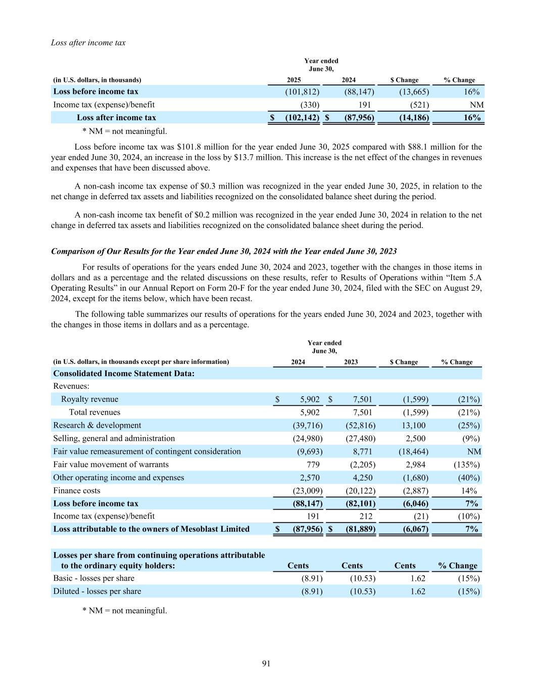 Loss after income tax Year ended June 30, (in U.S. dollars, in thousands) 2025 2024 $ Change % Change Loss before income tax (101,812) (88,147) (13,665) 16% Income tax (expense)/benefit (330) 191 (521) NM Loss after income tax $ (102,142) $ (87,956) (14,186) 16% * NM = not meaningful. Loss before income tax was $101.8 million for the year ended June 30, 2025 compared with $88.1 million for the year ended June 30, 2024, an increase in the loss by $13.7 million. This increase is the net effect of the changes in revenues and expenses that have been discussed above. A non-cash income tax expense of $0.3 million was recognized in the year ended June 30, 2025, in relation to the net change in deferred tax assets and liabilities recognized on the consolidated balance sheet during the period. A non-cash income tax benefit of $0.2 million was recognized in the year ended June 30, 2024 in relation to the net change in deferred tax assets and liabilities recognized on the consolidated balance sheet during the period. Comparison of Our Results for the Year ended June 30, 2024 with the Year ended June 30, 2023 For results of operations for the years ended June 30, 2024 and 2023, together with the changes in those items in dollars and as a percentage and the related discussions on these results, refer to Results of Operations within “Item 5.A Operating Results” in our Annual Report on Form 20-F for the year ended June 30, 2024, filed with the SEC on August 29, 2024, except for the items below, which have been recast. The following table summarizes our results of operations for the years ended June 30, 2024 and 2023, together with the changes in those items in dollars and as a percentage. Year ended June 30, (in U.S. dollars, in thousands except per share information) 2024 2023 $ Change % Change Consolidated Income Statement Data: Revenues: Royalty revenue $ 5,902 $ 7,501 (1,599) (21%) Total revenues 5,902 7,501 (1,599) (21%) Research & development (39,716) (52,816) 13,100 (25%) Selling, general and administration (24,980) (27,480) 2,500 (9%) Fair value remeasurement of contingent consideration (9,693) 8,771 (18,464) NM Fair value movement of warrants 779 (2,205) 2,984 (135%) Other operating income and expenses 2,570 4,250 (1,680) (40%) Finance costs (23,009) (20,122) (2,887) 14% Loss before income tax (88,147) (82,101) (6,046) 7% Income tax (expense)/benefit 191 212 (21) (10%) Loss attributable to the owners of Mesoblast Limited $ (87,956) $ (81,889) (6,067) 7% Losses per share from continuing operations attributable to the ordinary equity holders: Cents Cents Cents % Change Basic - losses per share (8.91) (10.53) 1.62 (15%) Diluted - losses per share (8.91) (10.53) 1.62 (15%) * NM = not meaningful. 91