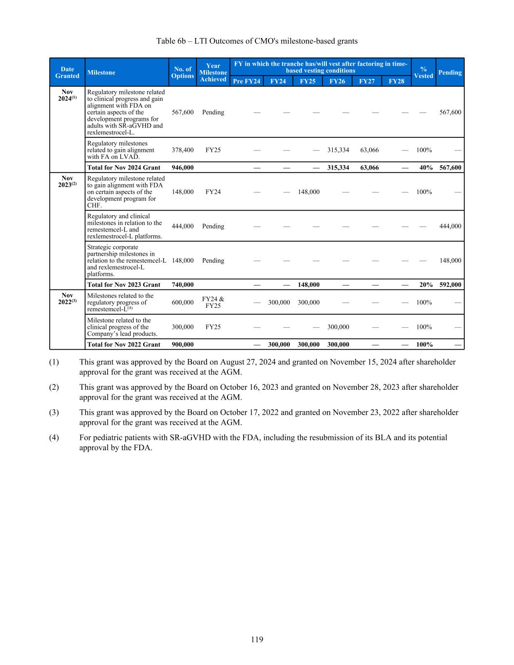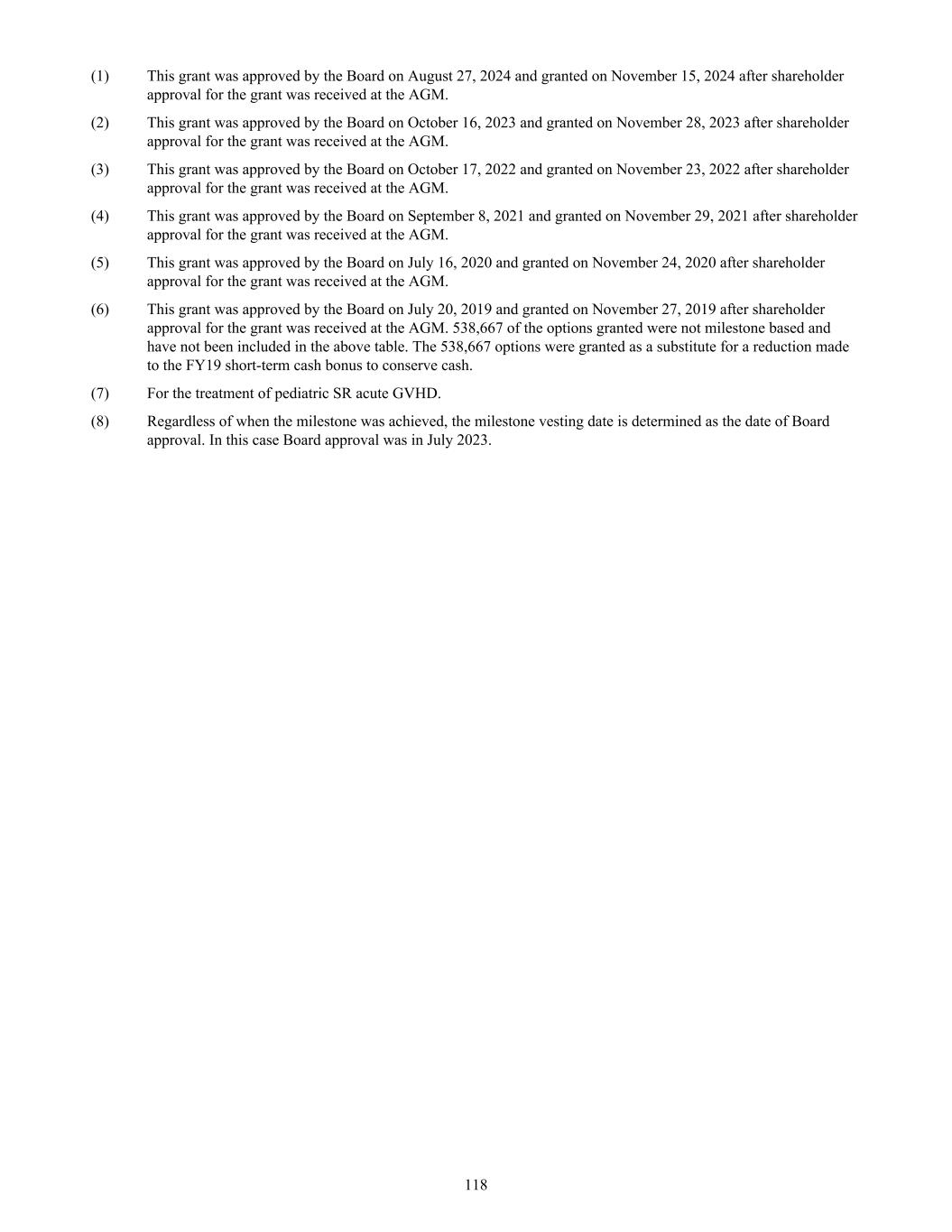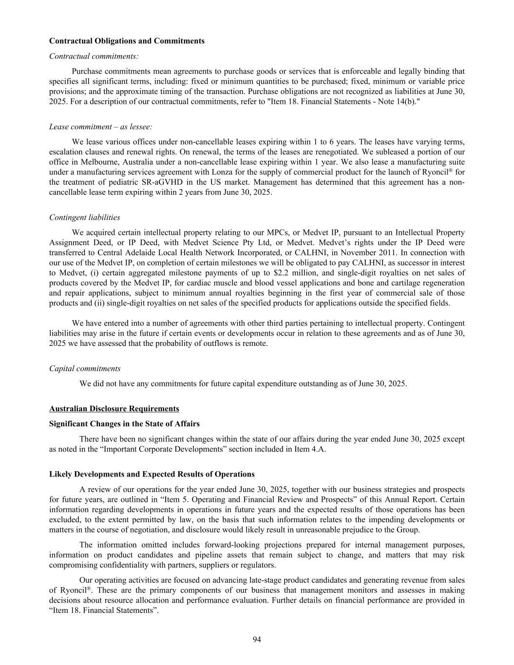 (1) As of June 30, 2025 and as of the date of this report, BeiCell Ltd is in voluntary liquidation. A Certificate of Dissolution has been issued by the Cayman Islands Registrar of Companies which states that the company will be deemed dissolved and removed from the Register of Companies on September 15, 2025. 13. Contingent assets and liabilities a. Contingent assets The Group did not have any contingent assets outstanding as of June 30, 2025 and June 30, 2024. b. Contingent liabilities (i) Central Adelaide Local Health Network Incorporated (“CALHNI”) (formerly Medvet) The Group acquired certain intellectual property relating to its MPCs, or Medvet IP, pursuant to an Intellectual Property Assignment Deed, or IP Deed, with Medvet Science Pty Ltd, or Medvet. Medvet’s rights under the IP Deed were transferred to Central Adelaide Local Health Network Incorporated, or CALHNI, in November 2011. In connection with its use of the Medvet IP, on completion of certain milestones the Group will be obligated to pay CALHNI, as successor in interest to Medvet, (i) certain aggregated milestone payments of up to $2.2 million and single-digit royalties on net sales of products covered by the Medvet IP, for cardiac muscle and blood vessel applications and bone and cartilage regeneration and repair applications, subject to minimum annual royalties beginning in the first year of commercial sale of those products and (ii) single-digit royalties on net sales of the specified products for applications outside the specified fields. (ii) Other contingent liabilities The Group has entered into a number of other agreements with other third parties pertaining to intellectual property. Contingent liabilities may arise in the future if certain events or developments occur in relation to these agreements. As of June 30, 2025, the Group has assessed these contingent liabilities to be remote and specific disclosure is not required. 14. Commitments a. Capital commitments The Group did not have any commitments for future capital expenditure outstanding as of June 30, 2025 and June 30, 2024. b. Purchase commitments In June 2025, the Group entered into a MSA, with Lonza, a global leader in biopharmaceutical manufacturing, and replaced the Group's prior MSAs with Lonza, for the supply of commercial product for the launch of Ryoncil® for the treatment of pediatric SR-aGVHD in the US market. This agreement contains lease and non-lease components. As of June 30, 2025, the agreement contains a minimum remaining financial commitment of the non-lease component of $20.4 million, payable until December 2026. The Group has accounted for the lease component within the agreement as a lease liability separately from the non-lease components. As of June 30, 2025, the lease component is $2.7 million on an undiscounted basis, as disclosed within the total contractual cash flows as lease liabilities in Note 10(c). The group have agreements with third parties related to contract manufacturing and other goods and services. As of June 30, 2025, the Group had $5.2 million of non-cancellable purchase commitments related to raw materials, manufacturing agreements and other goods and services (excluding those with Lonza). This amount represents our minimum contractual obligations, including termination fees. Certain agreements provide for termination rights subject to termination fees. Under such agreement, the Group are contractually obligated to make certain payments, mainly, to reimburse them for their unrecoverable outlays incurred prior to cancellation. The Group did not have any other purchase commitments as of June 30, 2025. 218