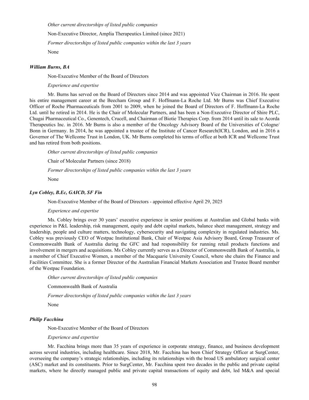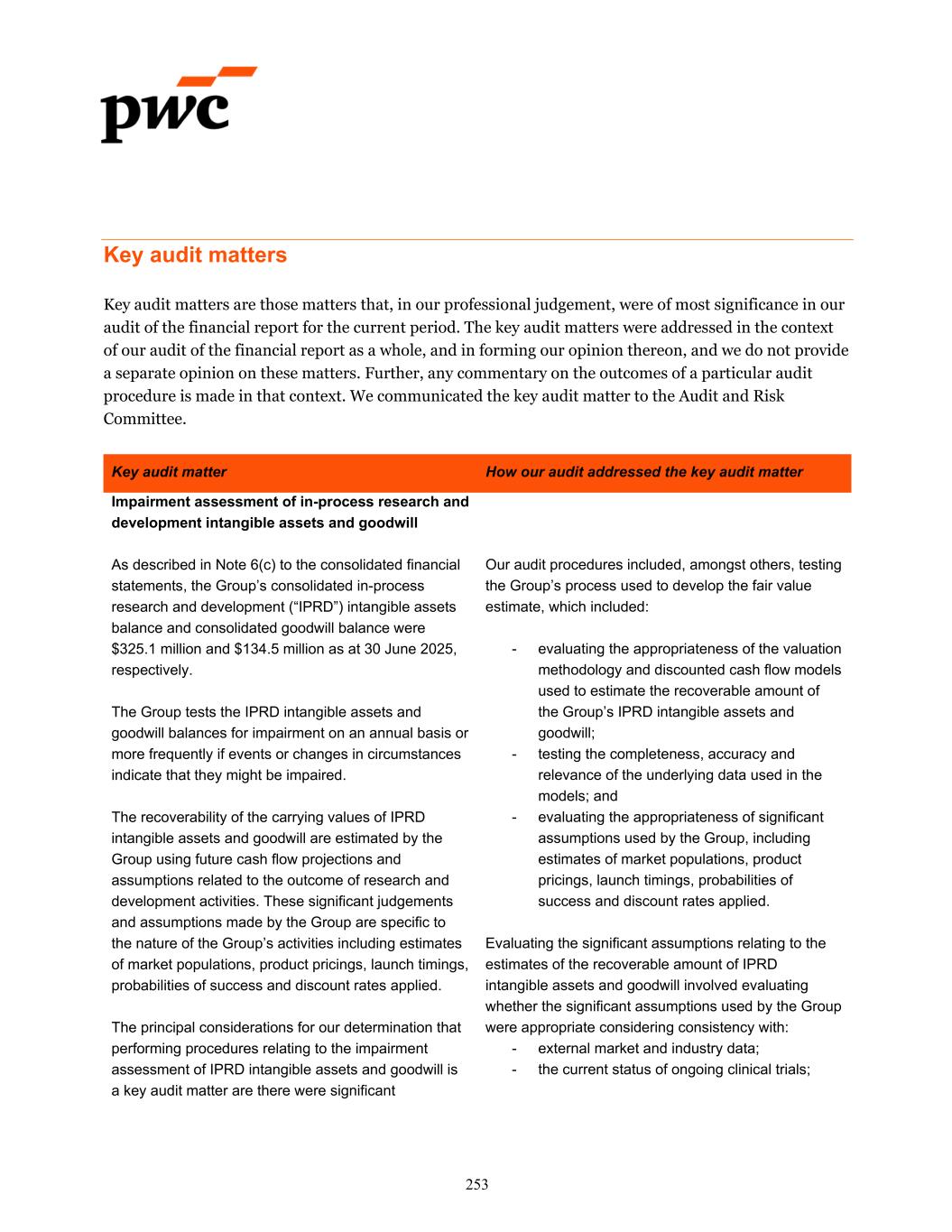 Key audit matters Key audit matters are those matters that, in our professional judgement, were of most significance in our audit of the financial report for the current period. The key audit matters were addressed in the context of our audit of the financial report as a whole, and in forming our opinion thereon, and we do not provide a separate opinion on these matters. Further, any commentary on the outcomes of a particular audit procedure is made in that context. We communicated the key audit matter to the Audit and Risk Committee. Key audit matter How our audit addressed the key audit matter Impairment assessment of in-process research and development intangible assets and goodwill As described in Note 6(c) to the consolidated financial statements, the Group’s consolidated in-process research and development (“IPRD”) intangible assets balance and consolidated goodwill balance were $325.1 million and $134.5 million as at 30 June 2025, respectively. The Group tests the IPRD intangible assets and goodwill balances for impairment on an annual basis or more frequently if events or changes in circumstances indicate that they might be impaired. The recoverability of the carrying values of IPRD intangible assets and goodwill are estimated by the Group using future cash flow projections and assumptions related to the outcome of research and development activities. These significant judgements and assumptions made by the Group are specific to the nature of the Group’s activities including estimates of market populations, product pricings, launch timings, probabilities of success and discount rates applied. The principal considerations for our determination that performing procedures relating to the impairment assessment of IPRD intangible assets and goodwill is a key audit matter are there were significant Our audit procedures included, amongst others, testing the Group’s process used to develop the fair value estimate, which included: - evaluating the appropriateness of the valuation methodology and discounted cash flow models used to estimate the recoverable amount of the Group’s IPRD intangible assets and goodwill; - testing the completeness, accuracy and relevance of the underlying data used in the models; and - evaluating the appropriateness of significant assumptions used by the Group, including estimates of market populations, product pricings, launch timings, probabilities of success and discount rates applied. Evaluating the significant assumptions relating to the estimates of the recoverable amount of IPRD intangible assets and goodwill involved evaluating whether the significant assumptions used by the Group were appropriate considering consistency with: - external market and industry data; - the current status of ongoing clinical trials; 253