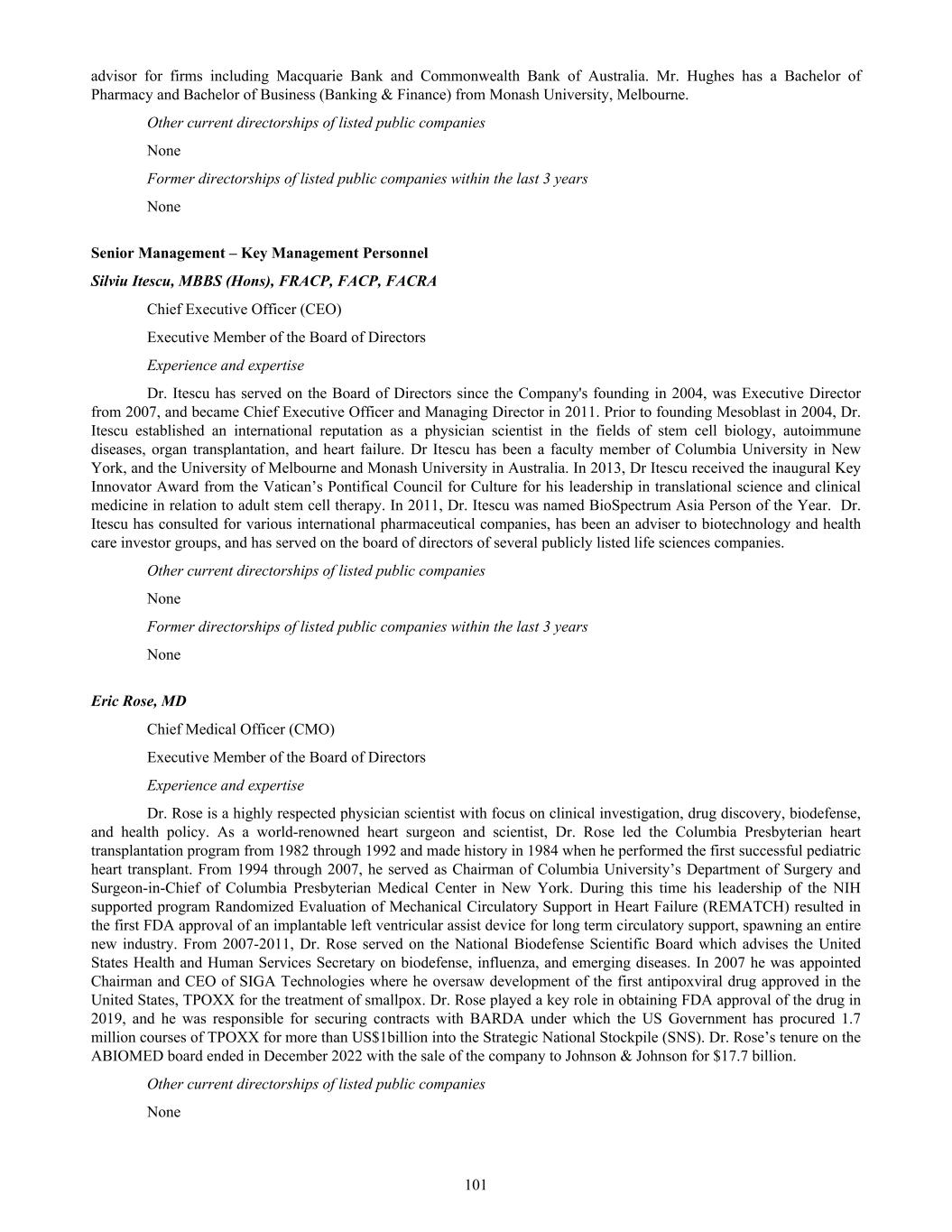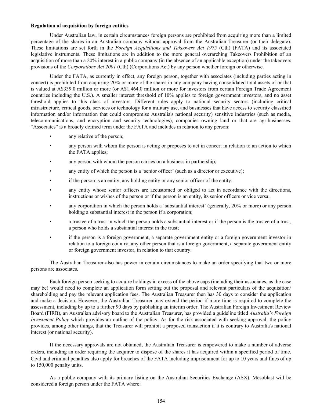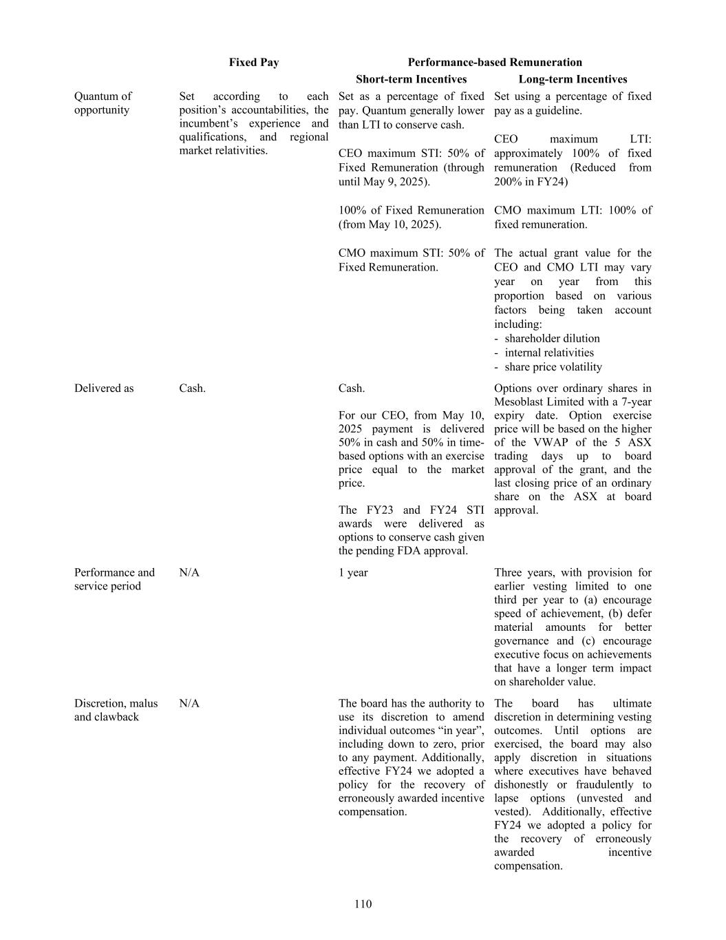 Table of Contents INTRODUCTION AND USE OF CERTAIN TERMS 3 FORWARD-LOOKING STATEMENTS 4 PART I 6 Item 1. Identity of Directors, Senior Management and Advisers 6 Item 2. Offer Statistics and Expected Timetable 6 Item 3. Key Information 6 3.A [Reserved] 6 3.B Capitalization and Indebtedness 6 3.C Reasons for the offer and use of proceeds 6 3.D Risk Factors 6 Item 4. Information on the Company 43 4.A History and Development of Mesoblast 43 4.B Business Overview 55 4.C Organizational Structure 81 4.D Property, Plants and Equipment 81 Item 4A. Unresolved Staff Comments 81 Item 5. Operating and Financial Review and Prospects 81 5.A Operating Results 81 5.B Liquidity and Capital Resources 95 5.C Research and Development, Patents and Licenses 97 5.D Trend Information 97 5.E Critical Accounting Estimates 97 Item 6. Directors, Senior Management and Employees 97 6.A Directors and Senior Management 97 6.B Compensation 107 6.C Board Practices 137 6.D Employees 139 6.E Share Ownership 140 6.F Disclosure of a Registrant’s Action to Recover Erroneously Awarded Compensation 142 Item 7. Major Shareholders and Related Party Transactions 142 7.A Major Shareholders 142 7.B Related Party Transactions 143 7.C Interests of Experts and Counsel 143 Item 8. Financial Information 143 8.A Consolidated Statements and Other Financial Information 143 8.B Significant Changes 143 Item 9. The Offer and Listing 144 9.A Offer and Listing Details 144 9.B Plan of Distribution 144 9.C Markets 144 9.D Selling Shareholders 144 9.E Dilution 144 9.F Expenses of the Issue 144 Item 10. Additional Information 144 10.A Share Capital 144