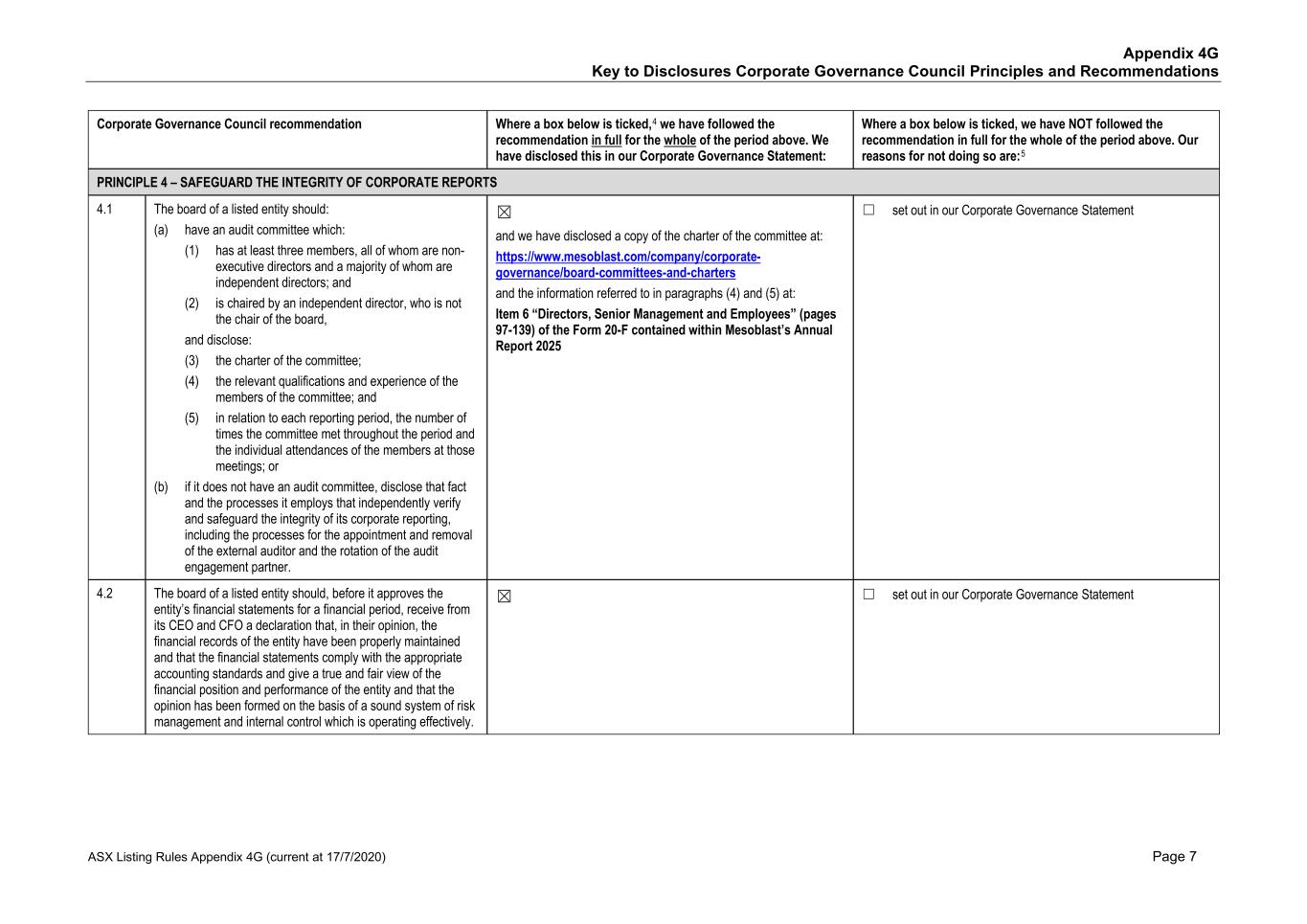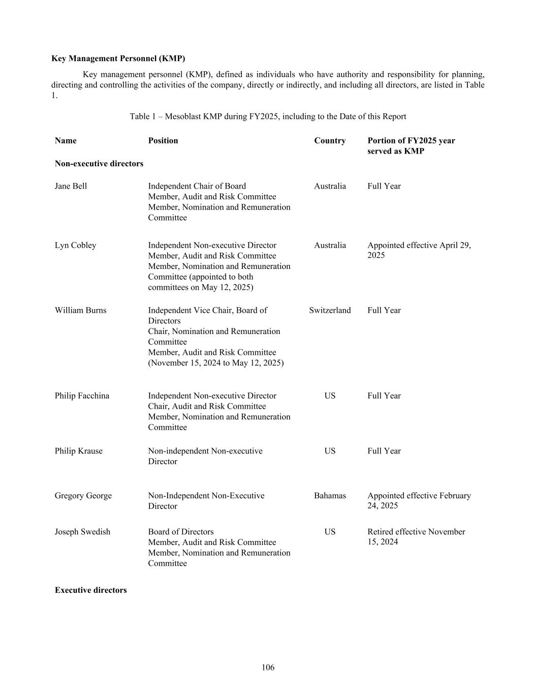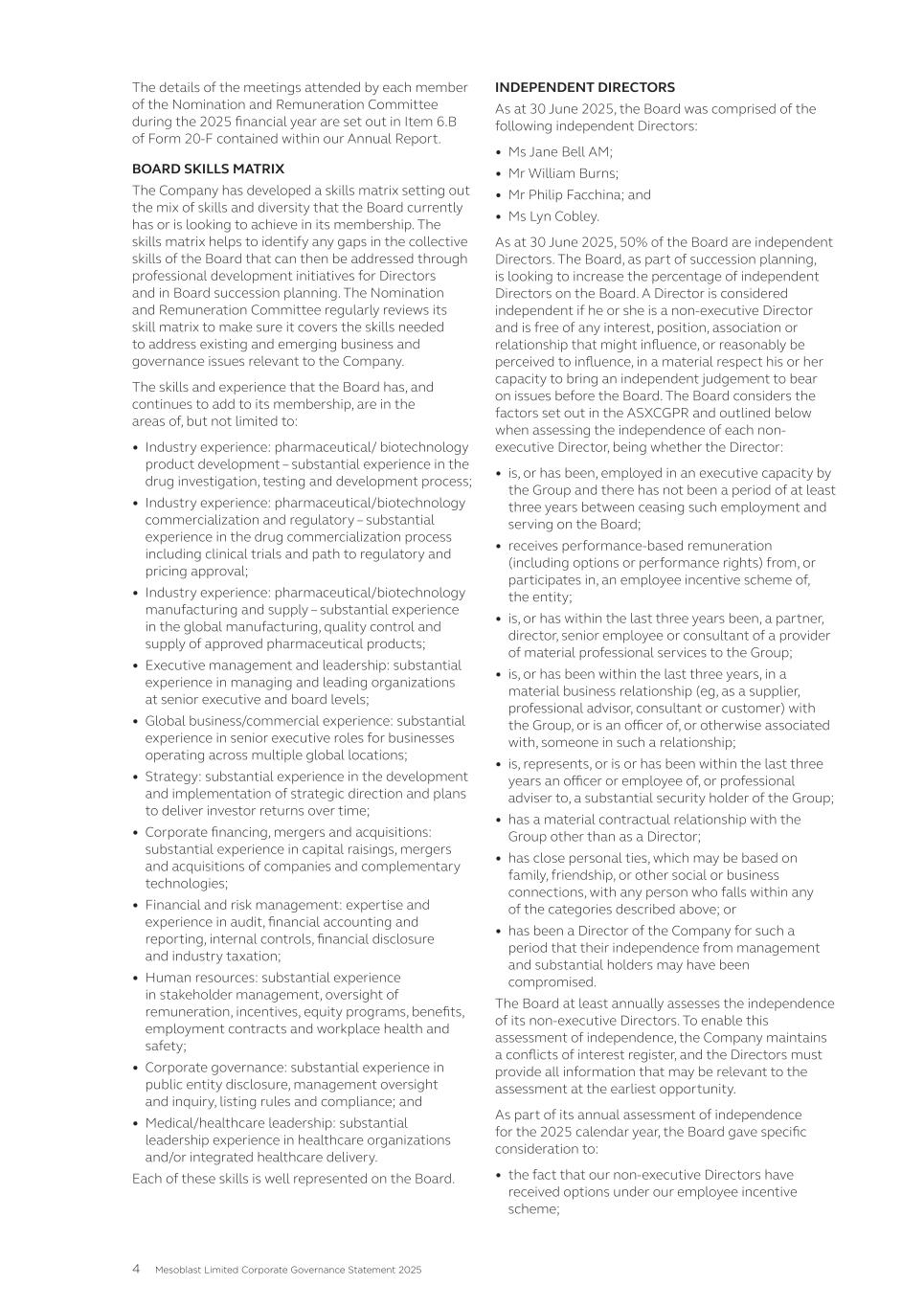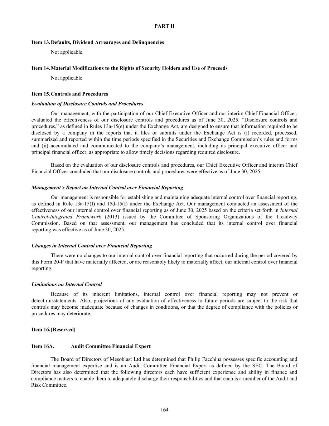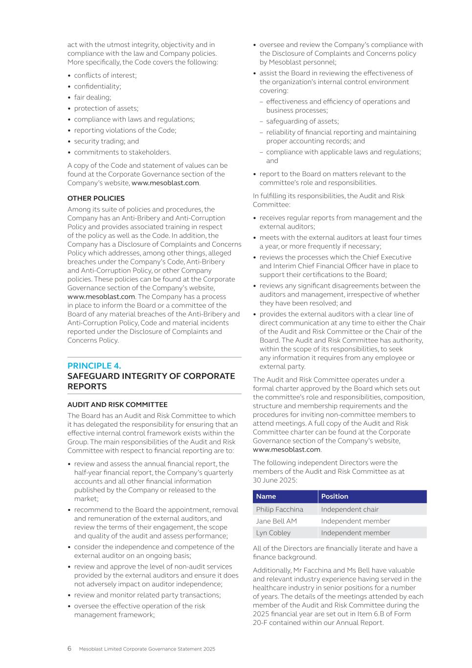 • Jane Bell (Audit and Risk Committee Member); • Lyn Cobley (Audit and Risk Committee Member, from May 12, 2025); • William Burns (Audit and Risk Committee Member, from November 15, 2024 to May 12, 2025); and • Joseph Swedish (Audit and Risk Committee Member until November 15, 2024, retired from the Board effective November 15, 2024) All members of the Audit and Risk Committee are “independent” according to the listing standards of the Nasdaq Global Select Market. Item 16B. Code of Ethics Our Code of Business Conduct and Ethics covers conflicts of interest, confidentiality, fair dealing, protection of assets, compliance with laws and regulations, whistle blowing, security trading and commitments to stakeholders. In summary, the Code requires that at all times all Company personnel act with the utmost integrity, objectivity and in compliance with the letter and the spirit of the law and Company policies. This document is accessible on our internet website at: http://www.mesoblast.com/company/corporate-governance/code-of-conduct-and-values. Item 16C. Principal Accountant Fees and Services Pre-Approval of Audit and Non-Audit Services The Audit and Risk Committee’s pre-approval is required for all services provided by PwC. These services may include audit services, audit-related services, tax services and permissible non-audit services, and are subject to a specific budget. The Audit and Risk Committee uses a combination of two approaches – general pre-approval and specific pre- approval – in considering whether particular services or categories of services are consistent with the SEC’s rules on auditor independence. Under general pre-approval proposed services may be pre-approved without consideration of specific case-by-case services. Audit and Non-Audit Services Fees See “Item 18. Financial Statements – Note 18”. For the purpose of SEC classification, there were no audit-related, tax or other fees that were paid or payable to PwC that were not pre-approved by the Audit and Risk Committee during the years ended June 30, 2025 and 2024. Item 16D. Exemptions from the Listing Standards for Audit Committees Not applicable. Item 16E. Purchases of Equity Securities by the Issuer and Affiliated Purchasers Not applicable. Item 16F. Change in Registrant’s Certifying Accountant Not applicable. Item 16G. Corporate Governance Under Nasdaq Stock Market Rule 5615(a)(3), foreign private issuers, such as our company, are permitted to follow certain home country corporate governance practices instead of certain provisions of the Nasdaq Stock Market Rules. For example, we may follow home country practice with regard to certain corporate governance requirements, such as the composition of the board of directors and quorum requirements applicable to shareholders’ meetings. In addition, we may follow home country practice instead of the Nasdaq Stock Market Rules requirement to hold executive sessions and to obtain shareholder approval prior to the issuance of securities in connection with certain acquisitions or private placements of securities. Further, we may follow home country practice instead of the Nasdaq Stock Market Rules requirement to obtain shareholder approval prior to the establishment or amendment of certain share option, purchase or other compensation plans. A foreign private issuer that elects to follow a home country practice instead of any Nasdaq rule must 165