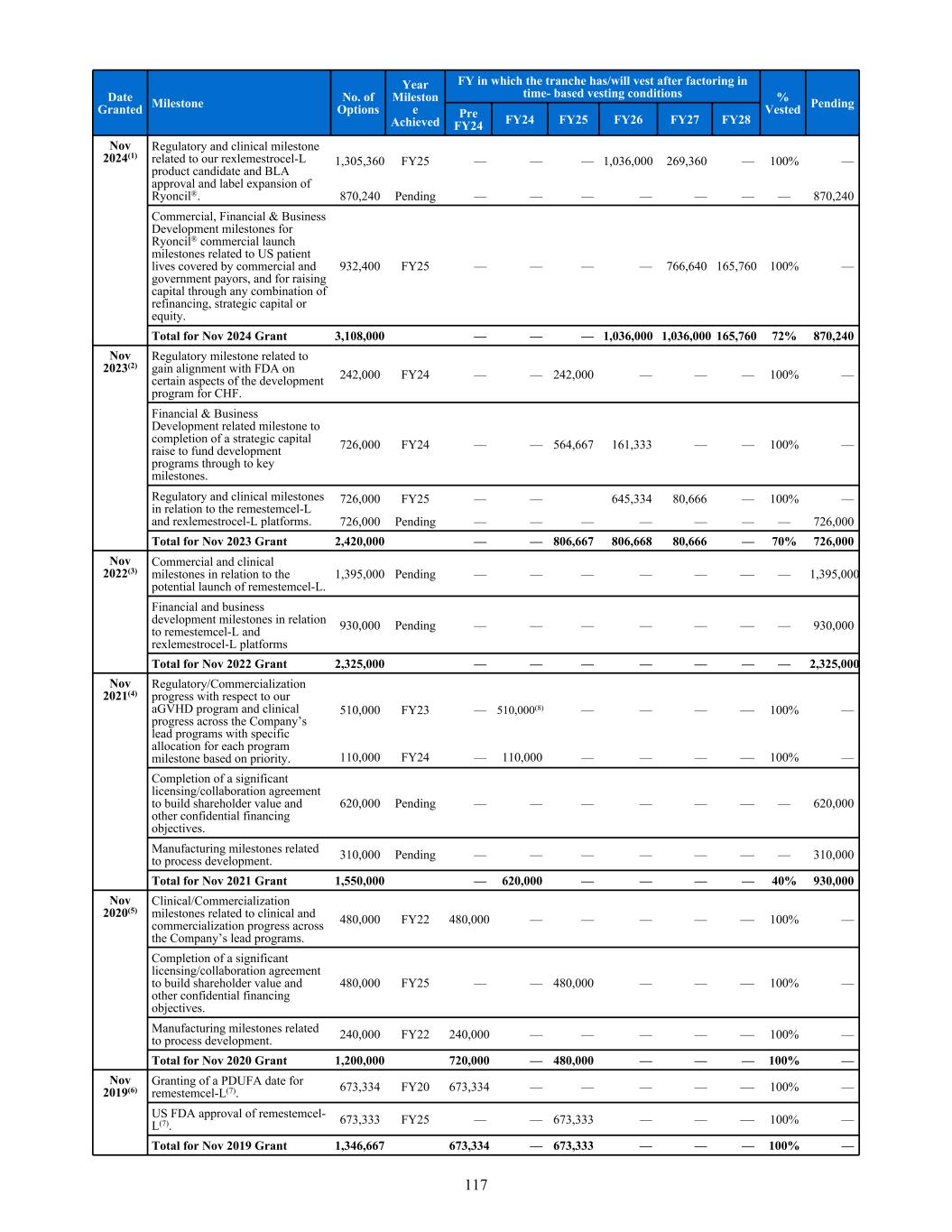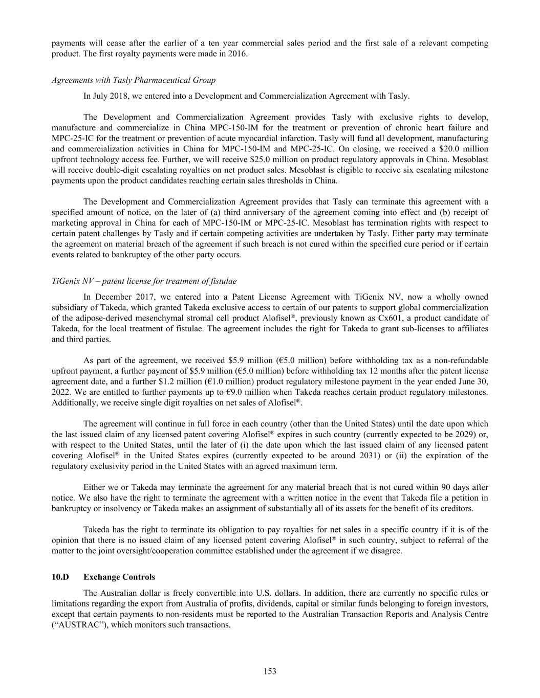 The Group received a non-refundable upfront payment of $15.0 million in October 2019, on signing of the contract with Grünenthal. The Group received a milestone payment in December 2019 of $2.5 million in relation to meeting a milestone event as part of the strategic partnership with Grünenthal. In June 2022, the Group amended the strategic partnership with Grünenthal and is eligible to receive payments up to US$112.5 million prior to product launch, inclusive of US$17.5 million already received, if certain clinical and regulatory milestones are satisfied and reimbursement targets are achieved. Cumulative milestone payments could reach US$1 billion depending on the final outcome of Phase 3 studies and patient adoption. The Group will also receive tiered double-digit royalties on product sales as per the original agreement. The $2.5 million milestone payment received in December 2019 from Grünenthal was considered deferred consideration as of June 30, 2025, as the performance obligation has not been met. There was no milestone revenue recognized in relation to this strategic partnership with Grünenthal in the years ended June 30, 2025, 2024 and 2023. Tasly arrangement In July 2018, the Group entered into a strategic alliance with Tasly Pharmaceutical Group (“Tasly”) for the development, manufacture and commercialization in China of the Group’s allogeneic MPC products, MPC-150-IM and MPC-25-IC. Tasly received all exclusive rights for MPC-150-IM and MPC-25-IC in China and Tasly will fund all development, manufacturing and commercialization activities in China. The Group received a $20.0 million upfront technology access fee from Tasly upon closing of this strategic alliance in October 2018. The Group recognized $10.0 million from this $20.0 million up-front technology access fee at closing in October 2018 and the remaining $10.0 million was recognized in revenue in February 2020. The Group is also entitled to receive $25.0 million on product regulatory approvals in China, double-digit escalating royalties on net product sales and up to six escalating milestone payments when the product candidates reach certain sales thresholds in China. For the years ended June 30, 2025, 2024 and 2023, no revenue was recognized in relation to this strategic alliance with Tasly. TiGenix arrangement In December 2017, the Group entered into a patent license agreement with TiGenix NV (“TiGenix”), now a wholly owned subsidiary of Takeda Pharmaceutical Company Limited (“Takeda”), which granted Takeda exclusive access to certain of our patents to support global commercialization of the adipose-derived MSC product, Alofisel® a registered trademark of TiGenix, previously known as Cx601, for the local treatment of fistulae. The agreement includes the right for Takeda to grant sub-licenses to affiliates and third parties. As part of the agreement, the Group received $5.9 million (€5.0 million) before withholding tax as a non-refundable up-front payment, a further payment of $5.9 million (€5.0 million) before withholding tax 12 months after the patent license agreement date, and a further $1.2 million (€1.0 million) product regulatory milestone payment in the year ended June 30, 2022. The Group is entitled to further payments up to €9.0 million when Takeda reaches certain product regulatory milestones. Additionally, the Group receive single digit royalties on net sales of Alofisel®. In the years ended June 30, 2025, 2024 and 2023, the Group earned $0.1 million, $0.4 million and $0.4 million, respectively, of royalty income on sales of Alofisel® by our licensee Takeda. No milestone revenue was recognized in the years ended June 30, 2025, 2024 and 2023 in relation to the Group's patent license agreement with Takeda. JCR arrangement In October 2013, the Group acquired all of the culture-expanded, MSC-based assets from Osiris. These assets included assumption of a collaboration agreement with JCR, a research and development oriented pharmaceutical company in Japan. Revenue recognized under this agreement is limited to the amount of cash received or for which the Group is entitled, as JCR has the right to terminate the agreement at any time. Under the JCR Agreement, JCR is responsible for all development and manufacturing costs including sales and marketing expenses. Under the JCR Agreement, JCR has the right to develop our MSCs in two fields for the Japanese 236