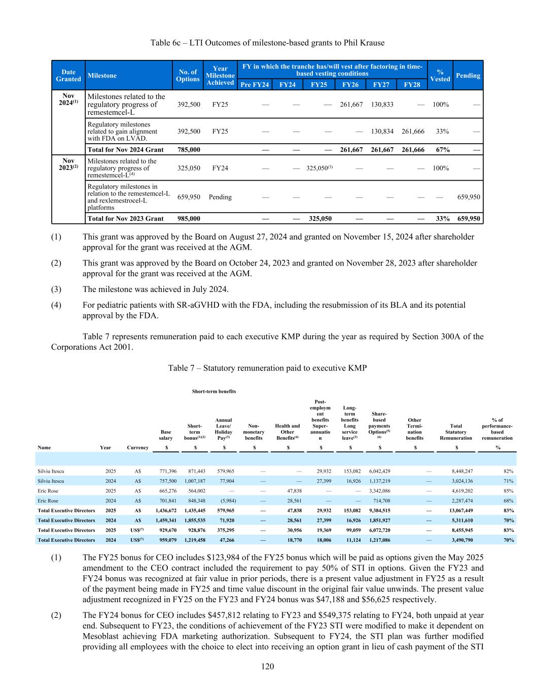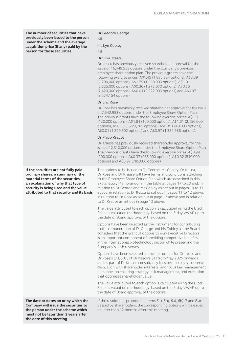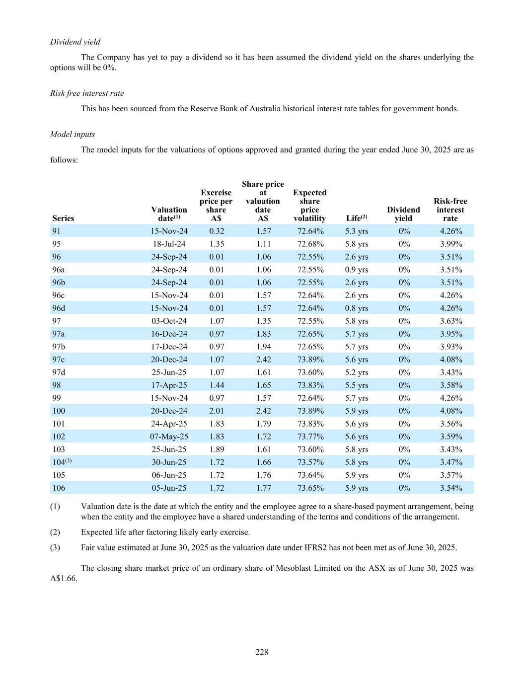 Dividend yield The Company has yet to pay a dividend so it has been assumed the dividend yield on the shares underlying the options will be 0%. Risk free interest rate This has been sourced from the Reserve Bank of Australia historical interest rate tables for government bonds. Model inputs The model inputs for the valuations of options approved and granted during the year ended June 30, 2025 are as follows: Series Valuation date(1) Exercise price per share A$ Share price at valuation date A$ Expected share price volatility Life(2) Dividend yield Risk-free interest rate 91 15-Nov-24 0.32 1.57 72.64% 5.3 yrs 0% 4.26% 95 18-Jul-24 1.35 1.11 72.68% 5.8 yrs 0% 3.99% 96 24-Sep-24 0.01 1.06 72.55% 2.6 yrs 0% 3.51% 96a 24-Sep-24 0.01 1.06 72.55% 0.9 yrs 0% 3.51% 96b 24-Sep-24 0.01 1.06 72.55% 2.6 yrs 0% 3.51% 96c 15-Nov-24 0.01 1.57 72.64% 2.6 yrs 0% 4.26% 96d 15-Nov-24 0.01 1.57 72.64% 0.8 yrs 0% 4.26% 97 03-Oct-24 1.07 1.35 72.55% 5.8 yrs 0% 3.63% 97a 16-Dec-24 0.97 1.83 72.65% 5.7 yrs 0% 3.95% 97b 17-Dec-24 0.97 1.94 72.65% 5.7 yrs 0% 3.93% 97c 20-Dec-24 1.07 2.42 73.89% 5.6 yrs 0% 4.08% 97d 25-Jun-25 1.07 1.61 73.60% 5.2 yrs 0% 3.43% 98 17-Apr-25 1.44 1.65 73.83% 5.5 yrs 0% 3.58% 99 15-Nov-24 0.97 1.57 72.64% 5.7 yrs 0% 4.26% 100 20-Dec-24 2.01 2.42 73.89% 5.9 yrs 0% 4.08% 101 24-Apr-25 1.83 1.79 73.83% 5.6 yrs 0% 3.56% 102 07-May-25 1.83 1.72 73.77% 5.6 yrs 0% 3.59% 103 25-Jun-25 1.89 1.61 73.60% 5.8 yrs 0% 3.43% 104(3) 30-Jun-25 1.72 1.66 73.57% 5.8 yrs 0% 3.47% 105 06-Jun-25 1.72 1.76 73.64% 5.9 yrs 0% 3.57% 106 05-Jun-25 1.72 1.77 73.65% 5.9 yrs 0% 3.54% (1) Valuation date is the date at which the entity and the employee agree to a share-based payment arrangement, being when the entity and the employee have a shared understanding of the terms and conditions of the arrangement. (2) Expected life after factoring likely early exercise. (3) Fair value estimated at June 30, 2025 as the valuation date under IFRS2 has not been met as of June 30, 2025. The closing share market price of an ordinary share of Mesoblast Limited on the ASX as of June 30, 2025 was A$1.66. 228