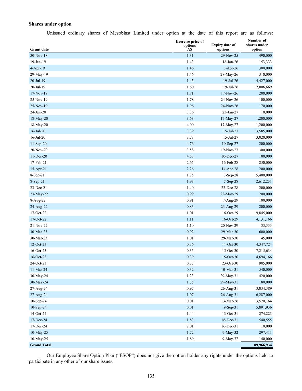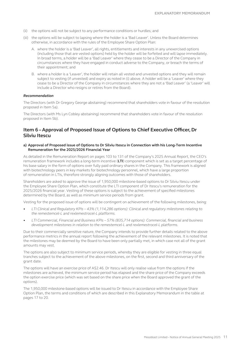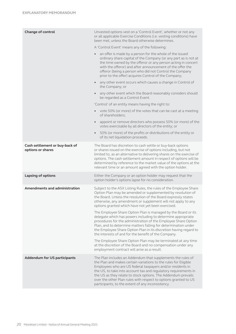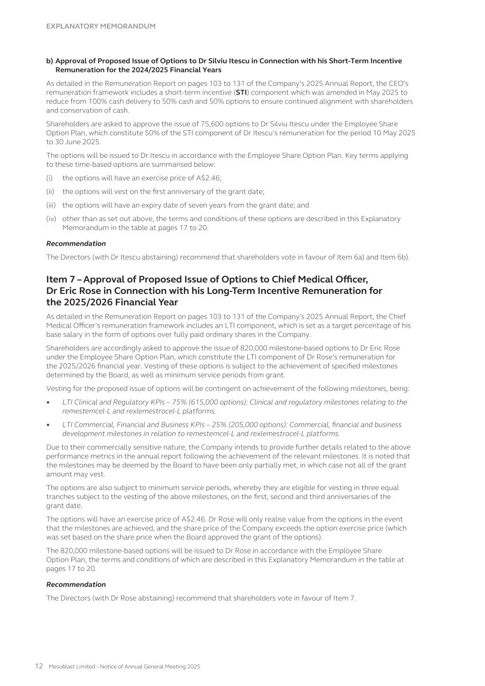 Dividend yield The Company has yet to pay a dividend so it has been assumed the dividend yield on the shares underlying the options will be 0%. Risk free interest rate This has been sourced from the Reserve Bank of Australia historical interest rate tables for government bonds. Model inputs The model inputs for the valuations of options approved and granted during the year ended June 30, 2025 are as follows: Series Valuation date(1) Exercise price per share A$ Share price at valuation date A$ Expected share price volatility Life(2) Dividend yield Risk-free interest rate 91 15-Nov-24 0.32 1.57 72.64% 5.3 yrs 0% 4.26% 95 18-Jul-24 1.35 1.11 72.68% 5.8 yrs 0% 3.99% 96 24-Sep-24 0.01 1.06 72.55% 2.6 yrs 0% 3.51% 96a 24-Sep-24 0.01 1.06 72.55% 0.9 yrs 0% 3.51% 96b 24-Sep-24 0.01 1.06 72.55% 2.6 yrs 0% 3.51% 96c 15-Nov-24 0.01 1.57 72.64% 2.6 yrs 0% 4.26% 96d 15-Nov-24 0.01 1.57 72.64% 0.8 yrs 0% 4.26% 97 03-Oct-24 1.07 1.35 72.55% 5.8 yrs 0% 3.63% 97a 16-Dec-24 0.97 1.83 72.65% 5.7 yrs 0% 3.95% 97b 17-Dec-24 0.97 1.94 72.65% 5.7 yrs 0% 3.93% 97c 20-Dec-24 1.07 2.42 73.89% 5.6 yrs 0% 4.08% 97d 25-Jun-25 1.07 1.61 73.60% 5.2 yrs 0% 3.43% 98 17-Apr-25 1.44 1.65 73.83% 5.5 yrs 0% 3.58% 99 15-Nov-24 0.97 1.57 72.64% 5.7 yrs 0% 4.26% 100 20-Dec-24 2.01 2.42 73.89% 5.9 yrs 0% 4.08% 101 24-Apr-25 1.83 1.79 73.83% 5.6 yrs 0% 3.56% 102 07-May-25 1.83 1.72 73.77% 5.6 yrs 0% 3.59% 103 25-Jun-25 1.89 1.61 73.60% 5.8 yrs 0% 3.43% 104(3) 30-Jun-25 1.72 1.66 73.57% 5.8 yrs 0% 3.47% 105 06-Jun-25 1.72 1.76 73.64% 5.9 yrs 0% 3.57% 106 05-Jun-25 1.72 1.77 73.65% 5.9 yrs 0% 3.54% (1) Valuation date is the date at which the entity and the employee agree to a share-based payment arrangement, being when the entity and the employee have a shared understanding of the terms and conditions of the arrangement. (2) Expected life after factoring likely early exercise. (3) Fair value estimated at June 30, 2025 as the valuation date under IFRS2 has not been met as of June 30, 2025. The closing share market price of an ordinary share of Mesoblast Limited on the ASX as of June 30, 2025 was A$1.66. 228