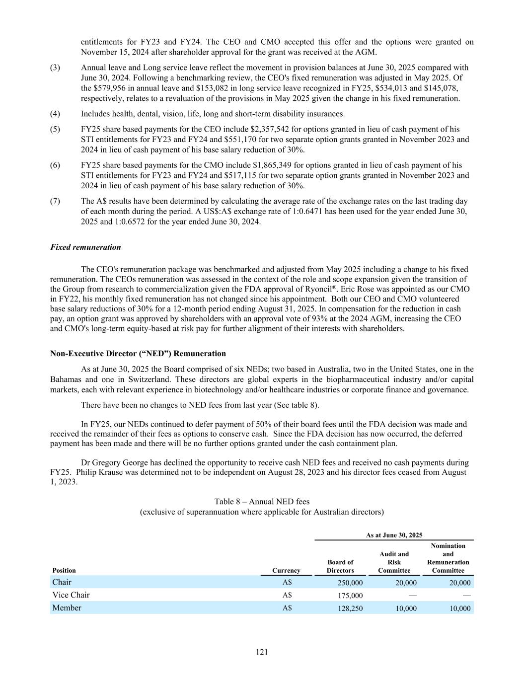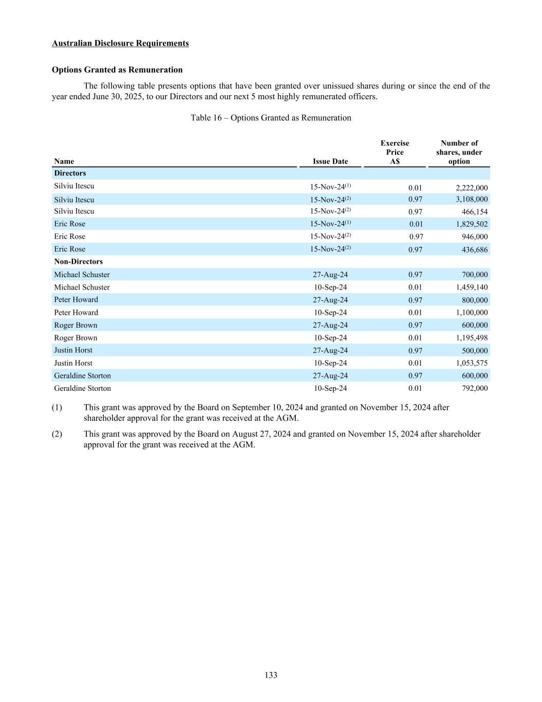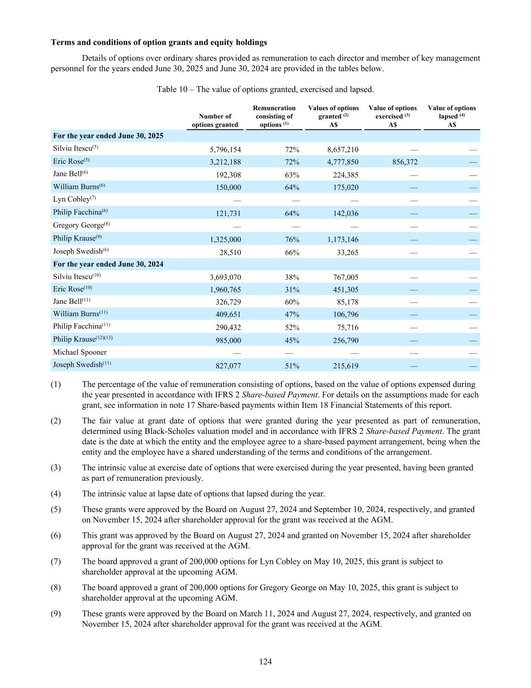 96d 10-Sep-24 14-Mar-25 A$0.01 548,851 (548,851) — — — 96d 10-Sep-24 13-Mar-26 A$0.01 1,280,651 — — 1,280,651 1,280,651 97 27-Aug-24 26-Aug-31 A$1.07 5,852,000 — (30,000) * 5,822,000 — 97a 27-Aug-24 26-Aug-31 A$0.97 6,800,000 — — 6,800,000 — 97b 27-Aug-24 26-Aug-31 A$0.97 4,839,000 — — 4,839,000 — 97c 27-Aug-24 26-Aug-31 A$1.07 240,000 — — 240,000 — 97d 27-Aug-24 26-Aug-31 A$1.07 225,000 — — 225,000 — 98 14-Oct-24 13-Oct-31 A$1.44 274,223 — — 274,223 91,408 99 27-Aug-24 26-Aug-31 A$0.97 1,395,389 — — 1,395,389 930,261 100 17-Dec-24 16-Dec-31 A$2.01 235,000 — (225,000) * 10,000 — 101 17-Dec-24 16-Dec-31 A$1.83 483,514 — (178,254) * 305,260 77,986 102 17-Dec-24 16-Dec-31 A$1.83 235,295 — — 235,295 — 103 10-May-25 09-May-32 A$1.89 180,000 — (25,000) * 155,000 — 104 10-May-25 09-May-32 A$1.72 215,000 — — 215,000 — 105 10-May-25 09-May-32 A$1.72 197,411 — — 197,411 98,705 106 10-May-25 09-May-32 A$1.72 100,000 — — 100,000 — June 30, 2025 72,416,208 42,563,353 (17,150,514) (4,247,345) 93,581,702 51,019,572 Weighted average share purchase price A$1.43 A$0.55 A$0.48 A$1.50 A$1.20 A$1.37 Series Grant Date(1) Expiry Date Exercise Price Opening Balance Granted No. (during the year) Exercised No. (during the year) Lapsed/ Forfeited* No. (during the year) Closing Balance Vested and exercisable No (end of year) (1) The dates presented in the grant date column represent the date on which board approval was obtained. For valuation dates per IFRS 2, refer to Note 17(c). 35a 08-Jul-20 08-Jul-23 A$2.86 1,500,000 — (1,500,000) — — 36 06-Dec-16 05-Dec-23 A$1.31 533,000 — (533,000) — — 36a 06-Dec-16 05-Dec-23 A$1.19 1,950,730 — (1,950,730) — — 38 16-Sep-17 15-Sep-24 A$1.52 50,000 — — 50,000 50,000 39 13-Oct-17 12-Oct-24 A$1.92 975,000 — (160,000) 815,000 815,000 39a 13-Oct-17 12-Oct-24 A$1.74 902,425 — — 902,425 902,425 40 24-Nov-17 23-Nov-24 A$1.39 750,000 — — 750,000 750,000 40a 24-Nov-17 23-Nov-24 A$1.26 750,000 — — 750,000 — 41 18-Jun-18 17-Jun-25 A$1.50 200,000 — — 200,000 200,000 42 11-Jul-18 10-Jul-25 A$1.54 200,000 — — 200,000 200,000 43 18-Jul-18 17-Jul-25 A$1.85 3,133,332 — (135,000) 2,998,332 2,998,332 43b 18-Jul-18 17-Jul-25 A$1.85 350,000 — — 350,000 350,000 45 30-Nov-18 29-Nov-25 A$1.31 590,000 — — 590,000 590,000 46 19-Jan-19 18-Jan-26 A$1.43 3,333 — — 3,333 3,333 47 19-Jan-19 18-Jan-26 A$1.43 150,000 — — 150,000 150,000 48 04-Apr-19 03-Apr-26 A$1.46 300,000 — — 300,000 300,000 49 20-Jul-19 19-Jul-26 A$1.60 3,018,669 — (310,000) 2,708,669 2,708,669 49a 20-Jul-19 19-Jul-26 A$1.45 2,833,332 — — 2,833,332 1,883,332 49b 20-Jul-19 19-Jul-26 A$1.45 1,346,667 — — 1,346,667 673,334 49c 20-Jul-19 19-Jul-26 A$1.45 538,667 — — 538,667 538,667 50 20-Jul-19 19-Jul-26 A$1.45 700,000 — — 700,000 175,000 54 25-Nov-19 24-Nov-26 A$1.96 20,000 — — 20,000 20,000 55 29-May-19 28-May-26 A$1.46 350,000 — — 350,000 300,000 56 18-Nov-19 17-Nov-26 A$1.81 200,000 — — 200,000 200,000 57 25-Nov-19 24-Nov-26 A$1.78 100,000 — — 100,000 100,000 58 25-Nov-19 24-Nov-26 A$1.96 150,000 — — 150,000 150,000 Series Grant Date(1) Expiry Date Exercise Price Opening Balance Granted No. (during the year) Exercised No. (during the year) Lapsed/ Forfeited* No. (during the year) Closing Balance Vested and exercisable No (end of year) 222