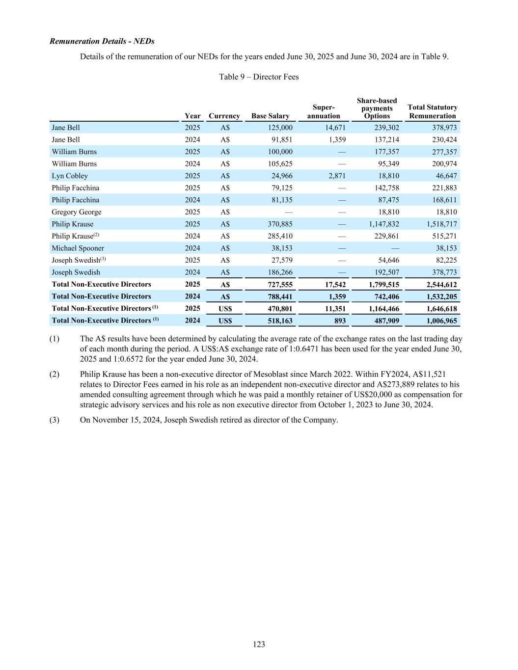 (2) Expected life after factoring likely early exercise. The closing share market price of an ordinary share of Mesoblast Limited on the ASX as of June 30, 2023 was A$1.14. 18. Remuneration of auditors During the year the following fees were paid or payable for services provided by the auditor of the parent entity, its related practices and non-related audit firms: Year Ended June 30, (in U.S. dollars) 2025 2024 2023 a. PricewaterhouseCoopers Australia Audit and other assurance services Audit and review of financial reports 675,921 623,605 669,603 Other audit services(1) 76,569 33,180 180,339 Total remuneration of PricewaterhouseCoopers Australia 752,490 656,785 849,942 b. Network firms of PricewaterhouseCoopers Australia Audit and other assurance services Audit and review of financial reports 198,747 65,722 144,864 Total remuneration of Network firms of PricewaterhouseCoopers Australia 198,747 65,722 144,864 Total auditors' remuneration(2) 951,237 722,507 994,806 (1) Other audit services relates to services performed in connection with the filing of registration statements on the Form F-3. (2) All services provided are considered audit fees for the purpose of SEC classification. 230