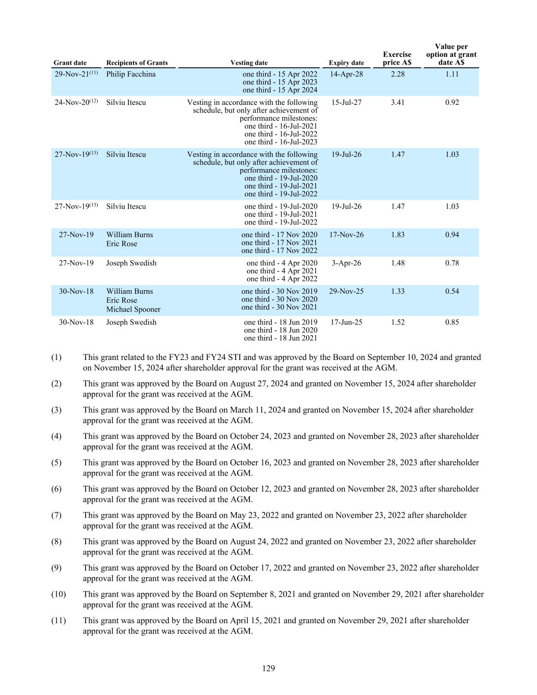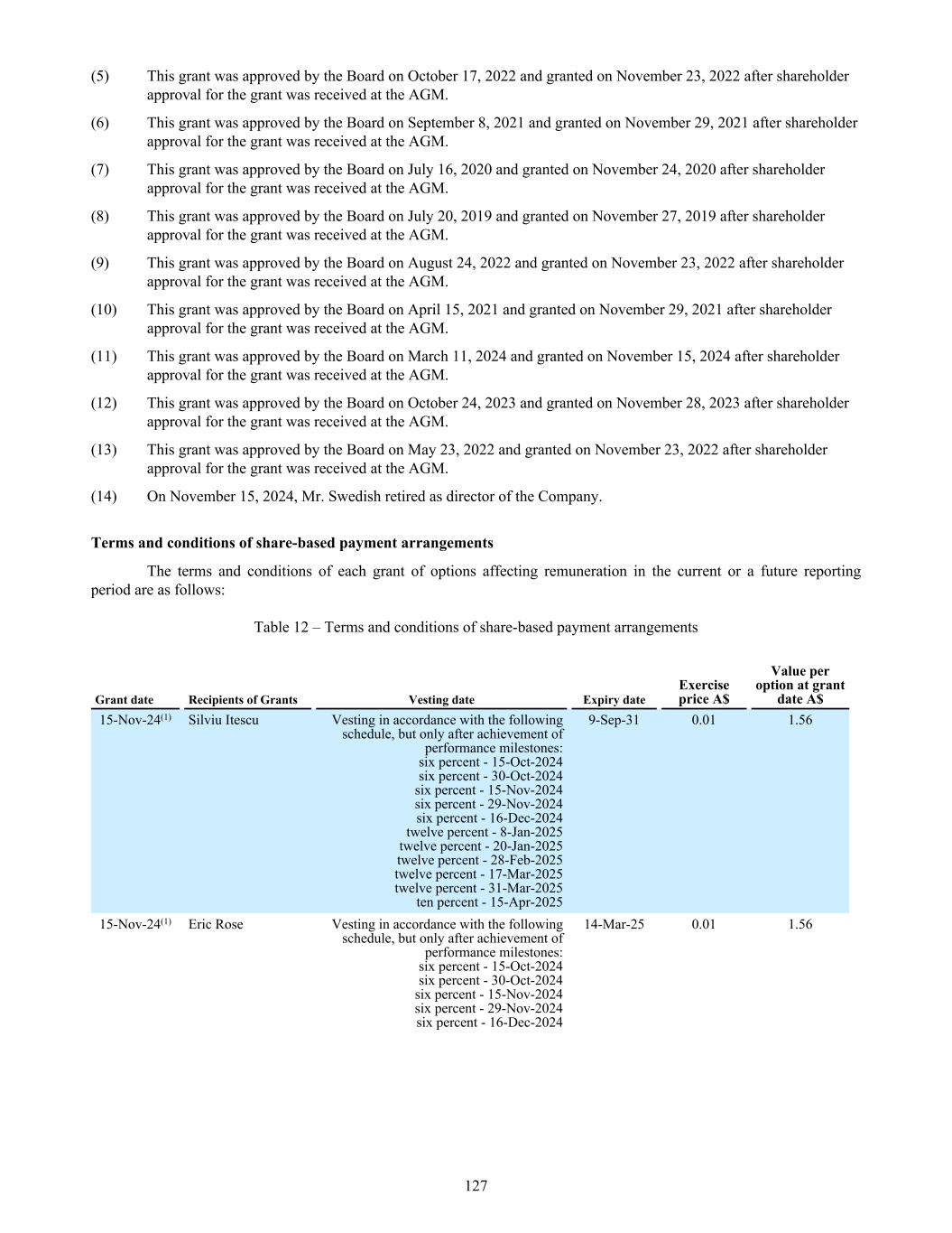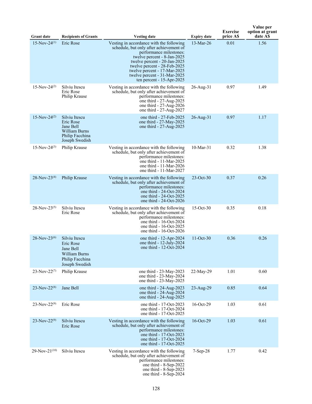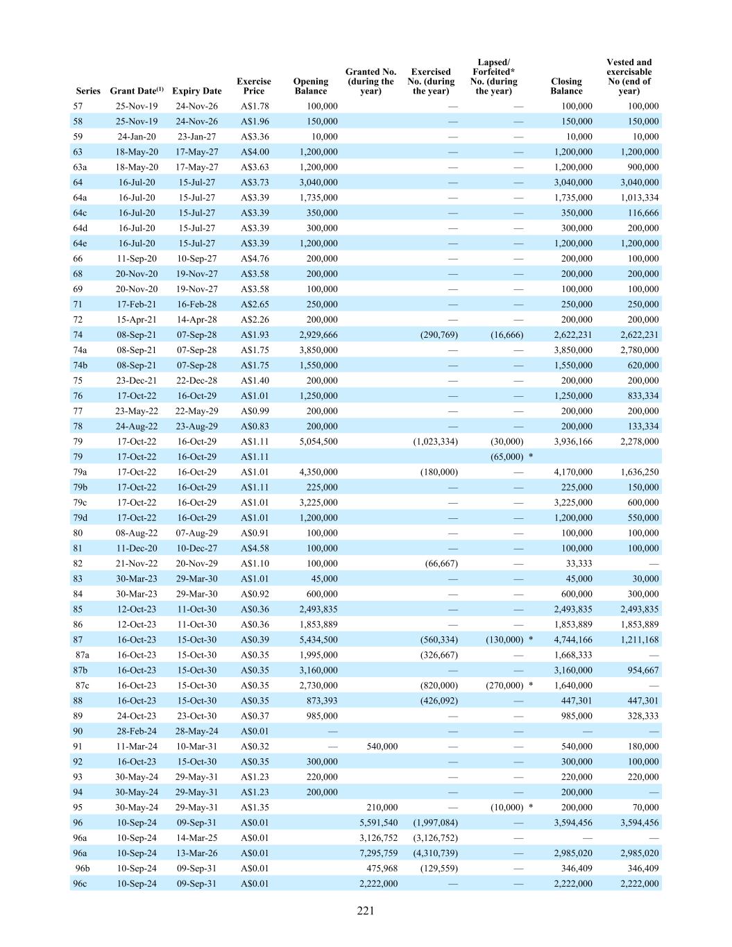 57 25-Nov-19 24-Nov-26 A$1.78 100,000 — — 100,000 100,000 58 25-Nov-19 24-Nov-26 A$1.96 150,000 — — 150,000 150,000 59 24-Jan-20 23-Jan-27 A$3.36 10,000 — — 10,000 10,000 63 18-May-20 17-May-27 A$4.00 1,200,000 — — 1,200,000 1,200,000 63a 18-May-20 17-May-27 A$3.63 1,200,000 — — 1,200,000 900,000 64 16-Jul-20 15-Jul-27 A$3.73 3,040,000 — — 3,040,000 3,040,000 64a 16-Jul-20 15-Jul-27 A$3.39 1,735,000 — — 1,735,000 1,013,334 64c 16-Jul-20 15-Jul-27 A$3.39 350,000 — — 350,000 116,666 64d 16-Jul-20 15-Jul-27 A$3.39 300,000 — — 300,000 200,000 64e 16-Jul-20 15-Jul-27 A$3.39 1,200,000 — — 1,200,000 1,200,000 66 11-Sep-20 10-Sep-27 A$4.76 200,000 — — 200,000 100,000 68 20-Nov-20 19-Nov-27 A$3.58 200,000 — — 200,000 200,000 69 20-Nov-20 19-Nov-27 A$3.58 100,000 — — 100,000 100,000 71 17-Feb-21 16-Feb-28 A$2.65 250,000 — — 250,000 250,000 72 15-Apr-21 14-Apr-28 A$2.26 200,000 — — 200,000 200,000 74 08-Sep-21 07-Sep-28 A$1.93 2,929,666 (290,769) (16,666) 2,622,231 2,622,231 74a 08-Sep-21 07-Sep-28 A$1.75 3,850,000 — — 3,850,000 2,780,000 74b 08-Sep-21 07-Sep-28 A$1.75 1,550,000 — — 1,550,000 620,000 75 23-Dec-21 22-Dec-28 A$1.40 200,000 — — 200,000 200,000 76 17-Oct-22 16-Oct-29 A$1.01 1,250,000 — — 1,250,000 833,334 77 23-May-22 22-May-29 A$0.99 200,000 — — 200,000 200,000 78 24-Aug-22 23-Aug-29 A$0.83 200,000 — — 200,000 133,334 79 17-Oct-22 16-Oct-29 A$1.11 5,054,500 (1,023,334) (30,000) 3,936,166 2,278,000 79 17-Oct-22 16-Oct-29 A$1.11 (65,000) * 79a 17-Oct-22 16-Oct-29 A$1.01 4,350,000 (180,000) — 4,170,000 1,636,250 79b 17-Oct-22 16-Oct-29 A$1.11 225,000 — — 225,000 150,000 79c 17-Oct-22 16-Oct-29 A$1.01 3,225,000 — — 3,225,000 600,000 79d 17-Oct-22 16-Oct-29 A$1.01 1,200,000 — — 1,200,000 550,000 80 08-Aug-22 07-Aug-29 A$0.91 100,000 — — 100,000 100,000 81 11-Dec-20 10-Dec-27 A$4.58 100,000 — — 100,000 100,000 82 21-Nov-22 20-Nov-29 A$1.10 100,000 (66,667) — 33,333 — 83 30-Mar-23 29-Mar-30 A$1.01 45,000 — — 45,000 30,000 84 30-Mar-23 29-Mar-30 A$0.92 600,000 — — 600,000 300,000 85 12-Oct-23 11-Oct-30 A$0.36 2,493,835 — — 2,493,835 2,493,835 86 12-Oct-23 11-Oct-30 A$0.36 1,853,889 — — 1,853,889 1,853,889 87 16-Oct-23 15-Oct-30 A$0.39 5,434,500 (560,334) (130,000) * 4,744,166 1,211,168 87a 16-Oct-23 15-Oct-30 A$0.35 1,995,000 (326,667) — 1,668,333 — 87b 16-Oct-23 15-Oct-30 A$0.35 3,160,000 — — 3,160,000 954,667 87c 16-Oct-23 15-Oct-30 A$0.35 2,730,000 (820,000) (270,000) * 1,640,000 — 88 16-Oct-23 15-Oct-30 A$0.35 873,393 (426,092) — 447,301 447,301 89 24-Oct-23 23-Oct-30 A$0.37 985,000 — — 985,000 328,333 90 28-Feb-24 28-May-24 A$0.01 — — — — — 91 11-Mar-24 10-Mar-31 A$0.32 — 540,000 — — 540,000 180,000 92 16-Oct-23 15-Oct-30 A$0.35 300,000 — — 300,000 100,000 93 30-May-24 29-May-31 A$1.23 220,000 — — 220,000 220,000 94 30-May-24 29-May-31 A$1.23 200,000 — — 200,000 — 95 30-May-24 29-May-31 A$1.35 210,000 — (10,000) * 200,000 70,000 96 10-Sep-24 09-Sep-31 A$0.01 5,591,540 (1,997,084) — 3,594,456 3,594,456 96a 10-Sep-24 14-Mar-25 A$0.01 3,126,752 (3,126,752) — — — 96a 10-Sep-24 13-Mar-26 A$0.01 7,295,759 (4,310,739) — 2,985,020 2,985,020 96b 10-Sep-24 09-Sep-31 A$0.01 475,968 (129,559) — 346,409 346,409 96c 10-Sep-24 09-Sep-31 A$0.01 2,222,000 — — 2,222,000 2,222,000 Series Grant Date(1) Expiry Date Exercise Price Opening Balance Granted No. (during the year) Exercised No. (during the year) Lapsed/ Forfeited* No. (during the year) Closing Balance Vested and exercisable No (end of year) 221