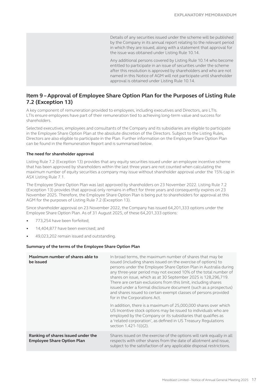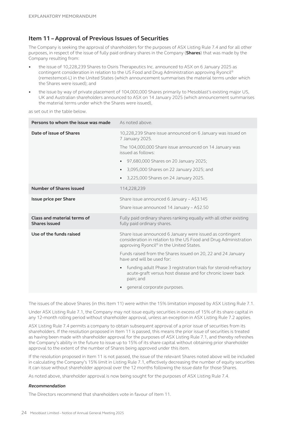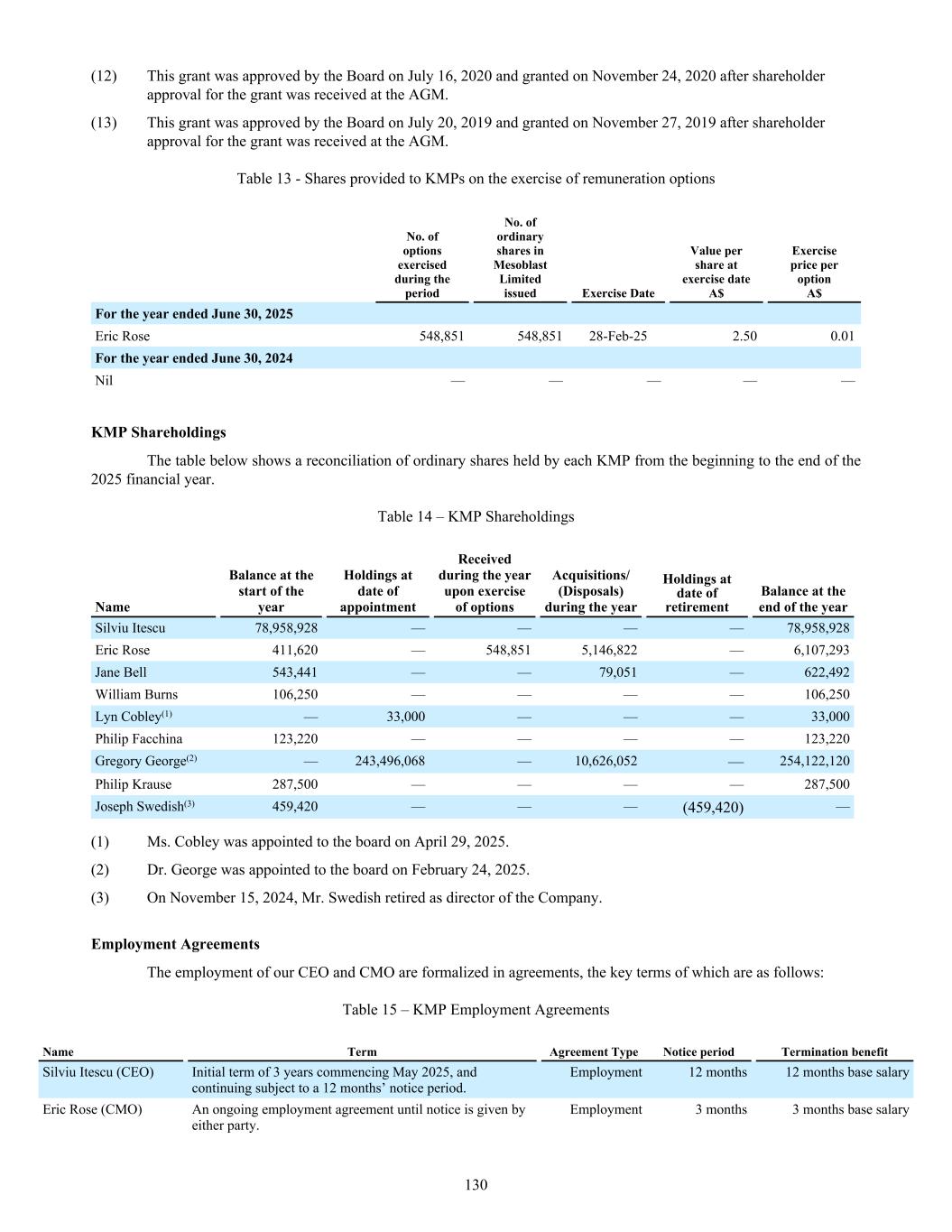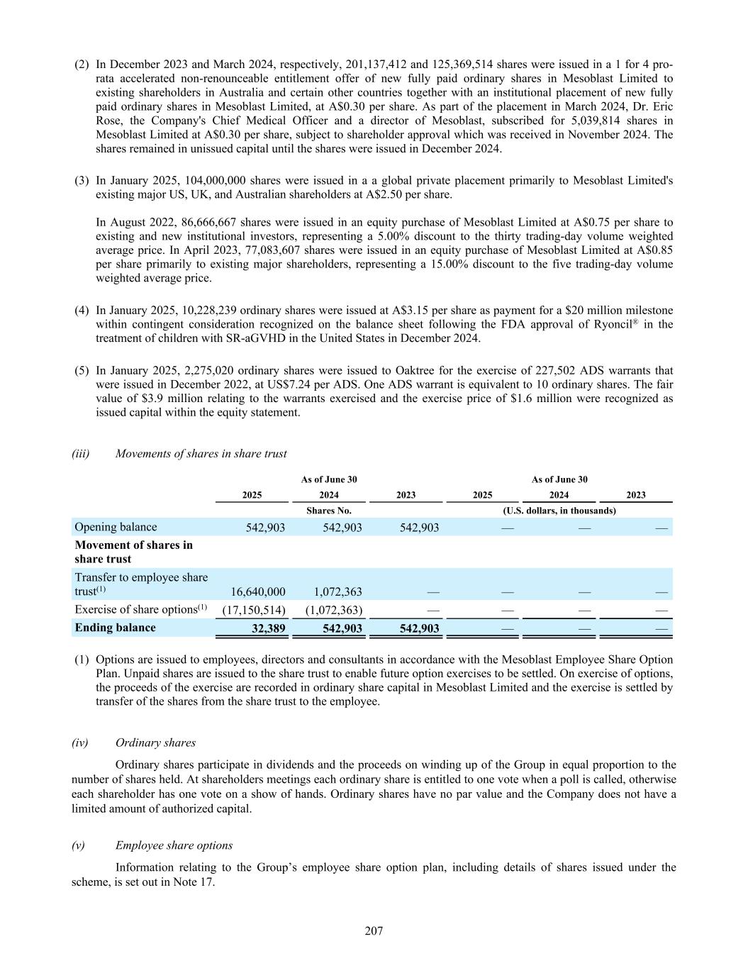 (2) In December 2023 and March 2024, respectively, 201,137,412 and 125,369,514 shares were issued in a 1 for 4 pro- rata accelerated non-renounceable entitlement offer of new fully paid ordinary shares in Mesoblast Limited to existing shareholders in Australia and certain other countries together with an institutional placement of new fully paid ordinary shares in Mesoblast Limited, at A$0.30 per share. As part of the placement in March 2024, Dr. Eric Rose, the Company's Chief Medical Officer and a director of Mesoblast, subscribed for 5,039,814 shares in Mesoblast Limited at A$0.30 per share, subject to shareholder approval which was received in November 2024. The shares remained in unissued capital until the shares were issued in December 2024. (3) In January 2025, 104,000,000 shares were issued in a a global private placement primarily to Mesoblast Limited's existing major US, UK, and Australian shareholders at A$2.50 per share. In August 2022, 86,666,667 shares were issued in an equity purchase of Mesoblast Limited at A$0.75 per share to existing and new institutional investors, representing a 5.00% discount to the thirty trading-day volume weighted average price. In April 2023, 77,083,607 shares were issued in an equity purchase of Mesoblast Limited at A$0.85 per share primarily to existing major shareholders, representing a 15.00% discount to the five trading-day volume weighted average price. (4) In January 2025, 10,228,239 ordinary shares were issued at A$3.15 per share as payment for a $20 million milestone within contingent consideration recognized on the balance sheet following the FDA approval of Ryoncil® in the treatment of children with SR-aGVHD in the United States in December 2024. (5) In January 2025, 2,275,020 ordinary shares were issued to Oaktree for the exercise of 227,502 ADS warrants that were issued in December 2022, at US$7.24 per ADS. One ADS warrant is equivalent to 10 ordinary shares. The fair value of $3.9 million relating to the warrants exercised and the exercise price of $1.6 million were recognized as issued capital within the equity statement. (iii) Movements of shares in share trust As of June 30 As of June 30 2025 2024 2023 2025 2024 2023 Shares No. (U.S. dollars, in thousands) Opening balance 542,903 542,903 542,903 — — — Movement of shares in share trust Transfer to employee share trust(1) 16,640,000 1,072,363 — — — — Exercise of share options(1) (17,150,514) (1,072,363) — — — — Ending balance 32,389 542,903 542,903 — — — (1) Options are issued to employees, directors and consultants in accordance with the Mesoblast Employee Share Option Plan. Unpaid shares are issued to the share trust to enable future option exercises to be settled. On exercise of options, the proceeds of the exercise are recorded in ordinary share capital in Mesoblast Limited and the exercise is settled by transfer of the shares from the share trust to the employee. (iv) Ordinary shares Ordinary shares participate in dividends and the proceeds on winding up of the Group in equal proportion to the number of shares held. At shareholders meetings each ordinary share is entitled to one vote when a poll is called, otherwise each shareholder has one vote on a show of hands. Ordinary shares have no par value and the Company does not have a limited amount of authorized capital. (v) Employee share options Information relating to the Group’s employee share option plan, including details of shares issued under the scheme, is set out in Note 17. 207