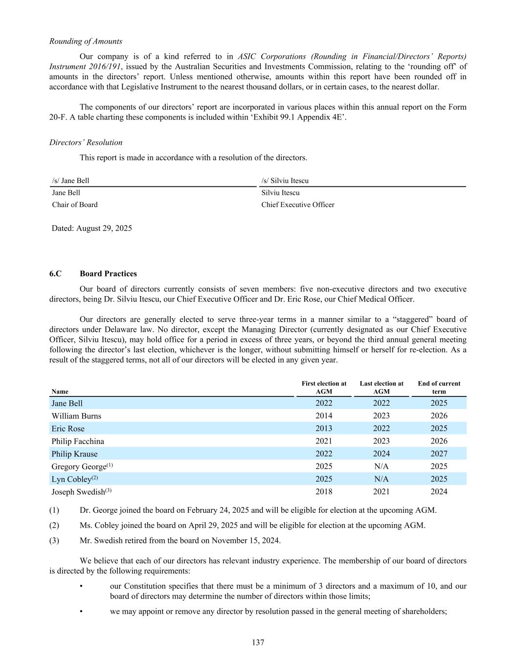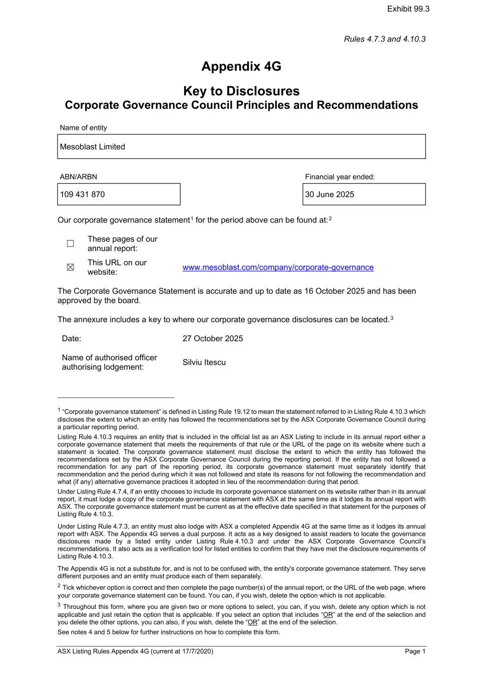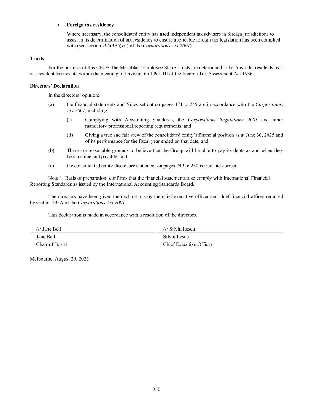 • Foreign tax residency Where necessary, the consolidated entity has used independent tax advisers in foreign jurisdictions to assist in its determination of tax residency to ensure applicable foreign tax legislation has been complied with (see section 295(3A)(vii) of the Corporations Act 2001). Trusts For the purpose of this CEDS, the Mesoblast Employee Share Trusts are determined to be Australia residents as it is a resident trust estate within the meaning of Division 6 of Part III of the Income Tax Assessment Act 1936. Directors’ Declaration In the directors’ opinion: (a) the financial statements and Notes set out on pages 171 to 249 are in accordance with the Corporations Act 2001, including: (i) Complying with Accounting Standards, the Corporations Regulations 2001 and other mandatory professional reporting requirements, and (ii) Giving a true and fair view of the consolidated entity’s financial position as at June 30, 2025 and of its performance for the fiscal year ended on that date, and (b) There are reasonable grounds to believe that the Group will be able to pay its debts as and when they become due and payable, and (c) the consolidated entity disclosure statement on pages 249 to 250 is true and correct. Note 1 ‘Basis of preparation’ confirms that the financial statements also comply with International Financial Reporting Standards as issued by the International Accounting Standards Board. The directors have been given the declarations by the chief executive officer and chief financial officer required by section 295A of the Corporations Act 2001. This declaration is made in accordance with a resolution of the directors. /s/ Jane Bell /s/ Silviu Itescu Jane Bell Silviu Itescu Chair of Board Chief Executive Officer Melbourne, August 29, 2025 250