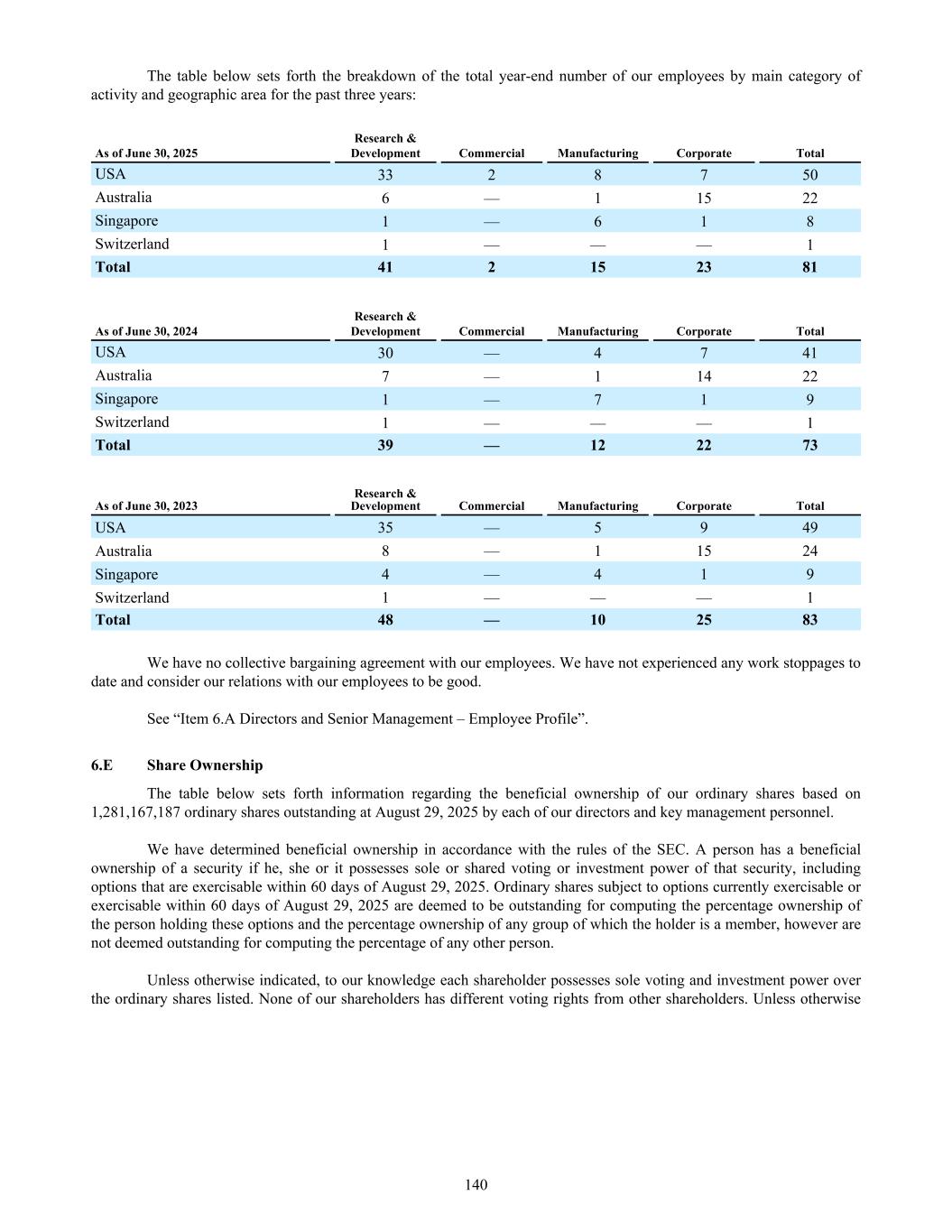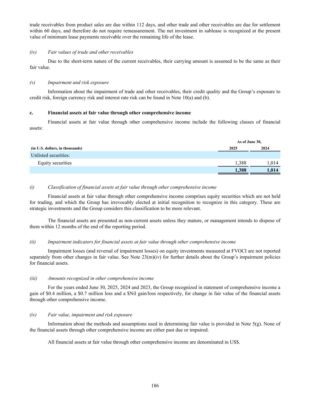 trade receivables from product sales are due within 112 days, and other trade and other receivables are due for settlement within 60 days, and therefore do not require remeasurement. The net investment in sublease is recognized at the present value of minimum lease payments receivable over the remaining life of the lease. (iv) Fair values of trade and other receivables Due to the short-term nature of the current receivables, their carrying amount is assumed to be the same as their fair value. (v) Impairment and risk exposure Information about the impairment of trade and other receivables, their credit quality and the Group’s exposure to credit risk, foreign currency risk and interest rate risk can be found in Note 10(a) and (b). c. Financial assets at fair value through other comprehensive income Financial assets at fair value through other comprehensive income include the following classes of financial assets: As of June 30, (in U.S. dollars, in thousands) 2025 2024 Unlisted securities: Equity securities 1,388 1,014 1,388 1,014 (i) Classification of financial assets at fair value through other comprehensive income Financial assets at fair value through other comprehensive income comprises equity securities which are not held for trading, and which the Group has irrevocably elected at initial recognition to recognize in this category. These are strategic investments and the Group considers this classification to be more relevant. The financial assets are presented as non-current assets unless they mature, or management intends to dispose of them within 12 months of the end of the reporting period. (ii) Impairment indicators for financial assets at fair value through other comprehensive income Impairment losses (and reversal of impairment losses) on equity investments measured at FVOCI are not reported separately from other changes in fair value. See Note 23(m)(iv) for further details about the Group’s impairment policies for financial assets. (iii) Amounts recognized in other comprehensive income For the years ended June 30, 2025, 2024 and 2023, the Group recognized in statement of comprehensive income a gain of $0.4 million, a $0.7 million loss and a $Nil gain/loss respectively, for change in fair value of the financial assets through other comprehensive income. (iv) Fair value, impairment and risk exposure Information about the methods and assumptions used in determining fair value is provided in Note 5(g). None of the financial assets through other comprehensive income are either past due or impaired. All financial assets at fair value through other comprehensive income are denominated in US$. 186