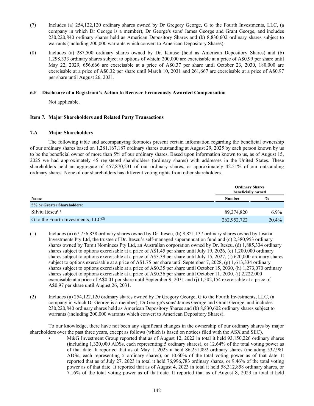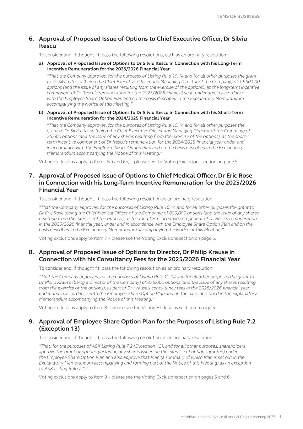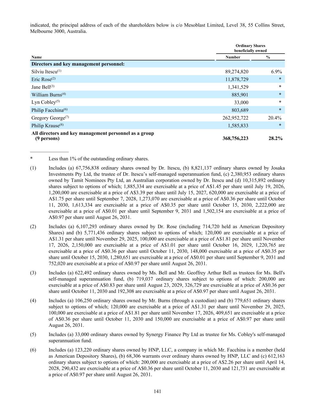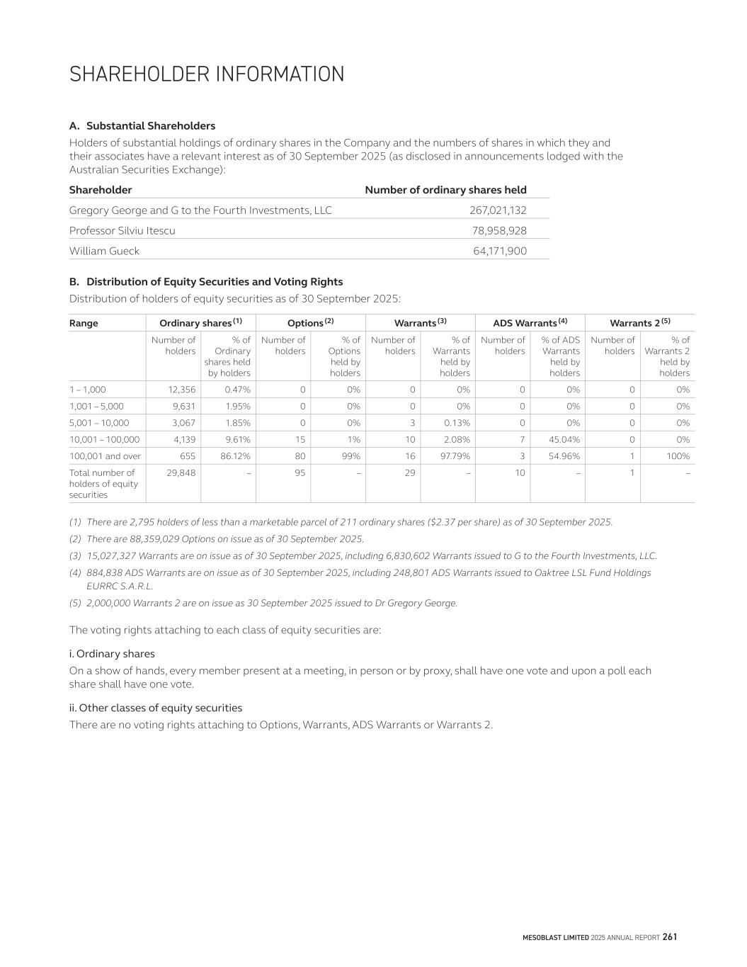 SHAREHOLDER INFORMATION A. Substantial Shareholders Holders of substantial holdings of ordinary shares in the Company and the numbers of shares in which they and their associates have a relevant interest as of 30 September 2025 (as disclosed in announcements lodged with the Australian Securities Exchange): Shareholder Number of ordinary shares held Gregory George and G to the Fourth Investments, LLC 267,021,132 Professor Silviu Itescu 78,958,928 William Gueck 64,171,900 B. Distribution of Equity Securities and Voting Rights Distribution of holders of equity securities as of 30 September 2025: Range Ordinary shares(1) Options(2) Warrants(3) ADS Warrants(4) Warrants 2(5) Number of holders % of Ordinary shares held by holders Number of holders % of Options held by holders Number of holders % of Warrants held by holders Number of holders % of ADS Warrants held by holders Number of holders % of Warrants 2 held by holders 1 – 1,000 12,356 0.47% 0 0% 0 0% 0 0% 0 0% 1,001 – 5,000 9,631 1.95% 0 0% 0 0% 0 0% 0 0% 5,001 – 10,000 3,067 1.85% 0 0% 3 0.13% 0 0% 0 0% 10,001 – 100,000 4,139 9.61% 15 1% 10 2.08% 7 45.04% 0 0% 100,001 and over 655 86.12% 80 99% 16 97.79% 3 54.96% 1 100% Total number of holders of equity securities 29,848 – 95 – 29 – 10 – 1 – (1) There are 2,795 holders of less than a marketable parcel of 211 ordinary shares ($2.37 per share) as of 30 September 2025. (2) There are 88,359,029 Options on issue as of 30 September 2025. (3) 15,027,327 Warrants are on issue as of 30 September 2025, including 6,830,602 Warrants issued to G to the Fourth Investments, LLC. (4) 884,838 ADS Warrants are on issue as of 30 September 2025, including 248,801 ADS Warrants issued to Oaktree LSL Fund Holdings EURRC S.A.R.L. (5) 2,000,000 Warrants 2 are on issue as 30 September 2025 issued to Dr Gregory George. The voting rights attaching to each class of equity securities are: i. Ordinary shares On a show of hands, every member present at a meeting, in person or by proxy, shall have one vote and upon a poll each share shall have one vote. ii. Other classes of equity securities There are no voting rights attaching to Options, Warrants, ADS Warrants or Warrants 2. MESOBLAST LIMITED 2025 ANNUAL REPORT 261