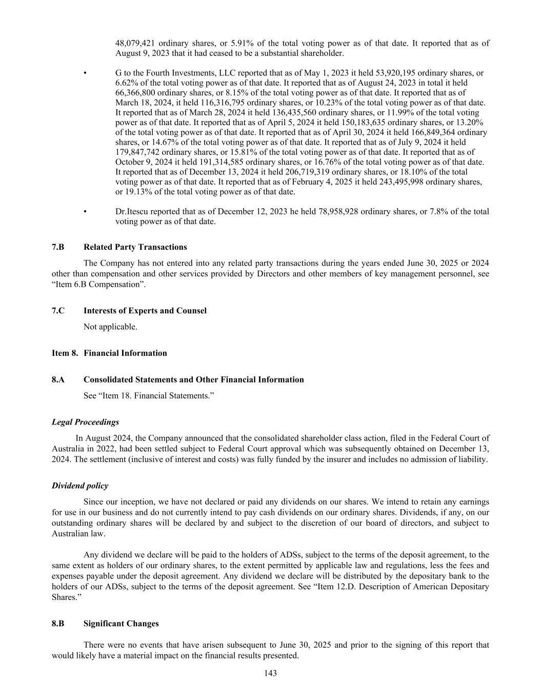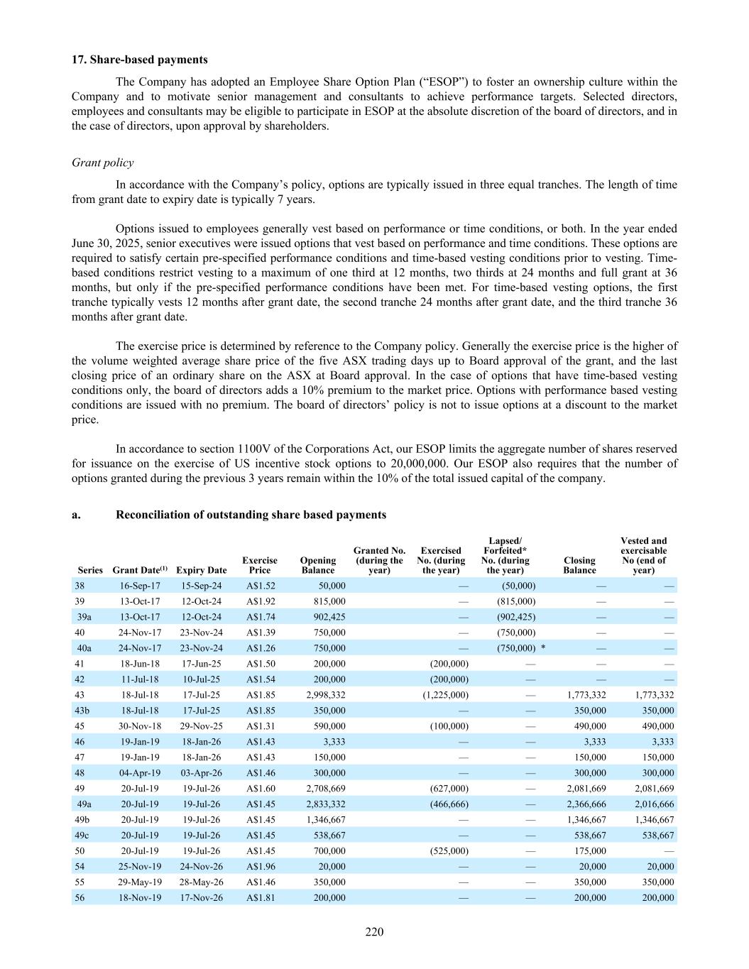 17. Share-based payments The Company has adopted an Employee Share Option Plan (“ESOP”) to foster an ownership culture within the Company and to motivate senior management and consultants to achieve performance targets. Selected directors, employees and consultants may be eligible to participate in ESOP at the absolute discretion of the board of directors, and in the case of directors, upon approval by shareholders. Grant policy In accordance with the Company’s policy, options are typically issued in three equal tranches. The length of time from grant date to expiry date is typically 7 years. Options issued to employees generally vest based on performance or time conditions, or both. In the year ended June 30, 2025, senior executives were issued options that vest based on performance and time conditions. These options are required to satisfy certain pre-specified performance conditions and time-based vesting conditions prior to vesting. Time- based conditions restrict vesting to a maximum of one third at 12 months, two thirds at 24 months and full grant at 36 months, but only if the pre-specified performance conditions have been met. For time-based vesting options, the first tranche typically vests 12 months after grant date, the second tranche 24 months after grant date, and the third tranche 36 months after grant date. The exercise price is determined by reference to the Company policy. Generally the exercise price is the higher of the volume weighted average share price of the five ASX trading days up to Board approval of the grant, and the last closing price of an ordinary share on the ASX at Board approval. In the case of options that have time-based vesting conditions only, the board of directors adds a 10% premium to the market price. Options with performance based vesting conditions are issued with no premium. The board of directors’ policy is not to issue options at a discount to the market price. In accordance to section 1100V of the Corporations Act, our ESOP limits the aggregate number of shares reserved for issuance on the exercise of US incentive stock options to 20,000,000. Our ESOP also requires that the number of options granted during the previous 3 years remain within the 10% of the total issued capital of the company. a. Reconciliation of outstanding share based payments 38 16-Sep-17 15-Sep-24 A$1.52 50,000 — (50,000) — — 39 13-Oct-17 12-Oct-24 A$1.92 815,000 — (815,000) — — 39a 13-Oct-17 12-Oct-24 A$1.74 902,425 — (902,425) — — 40 24-Nov-17 23-Nov-24 A$1.39 750,000 — (750,000) — — 40a 24-Nov-17 23-Nov-24 A$1.26 750,000 — (750,000) * — — 41 18-Jun-18 17-Jun-25 A$1.50 200,000 (200,000) — — — 42 11-Jul-18 10-Jul-25 A$1.54 200,000 (200,000) — — — 43 18-Jul-18 17-Jul-25 A$1.85 2,998,332 (1,225,000) — 1,773,332 1,773,332 43b 18-Jul-18 17-Jul-25 A$1.85 350,000 — — 350,000 350,000 45 30-Nov-18 29-Nov-25 A$1.31 590,000 (100,000) — 490,000 490,000 46 19-Jan-19 18-Jan-26 A$1.43 3,333 — — 3,333 3,333 47 19-Jan-19 18-Jan-26 A$1.43 150,000 — — 150,000 150,000 48 04-Apr-19 03-Apr-26 A$1.46 300,000 — — 300,000 300,000 49 20-Jul-19 19-Jul-26 A$1.60 2,708,669 (627,000) — 2,081,669 2,081,669 49a 20-Jul-19 19-Jul-26 A$1.45 2,833,332 (466,666) — 2,366,666 2,016,666 49b 20-Jul-19 19-Jul-26 A$1.45 1,346,667 — — 1,346,667 1,346,667 49c 20-Jul-19 19-Jul-26 A$1.45 538,667 — — 538,667 538,667 50 20-Jul-19 19-Jul-26 A$1.45 700,000 (525,000) — 175,000 — 54 25-Nov-19 24-Nov-26 A$1.96 20,000 — — 20,000 20,000 55 29-May-19 28-May-26 A$1.46 350,000 — — 350,000 350,000 56 18-Nov-19 17-Nov-26 A$1.81 200,000 — — 200,000 200,000 Series Grant Date(1) Expiry Date Exercise Price Opening Balance Granted No. (during the year) Exercised No. (during the year) Lapsed/ Forfeited* No. (during the year) Closing Balance Vested and exercisable No (end of year) 220