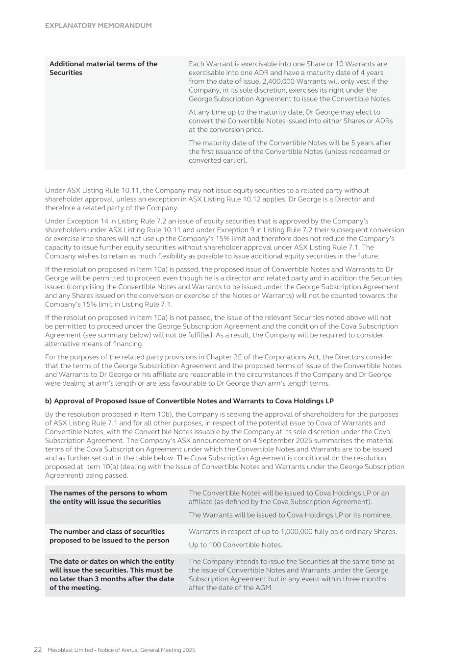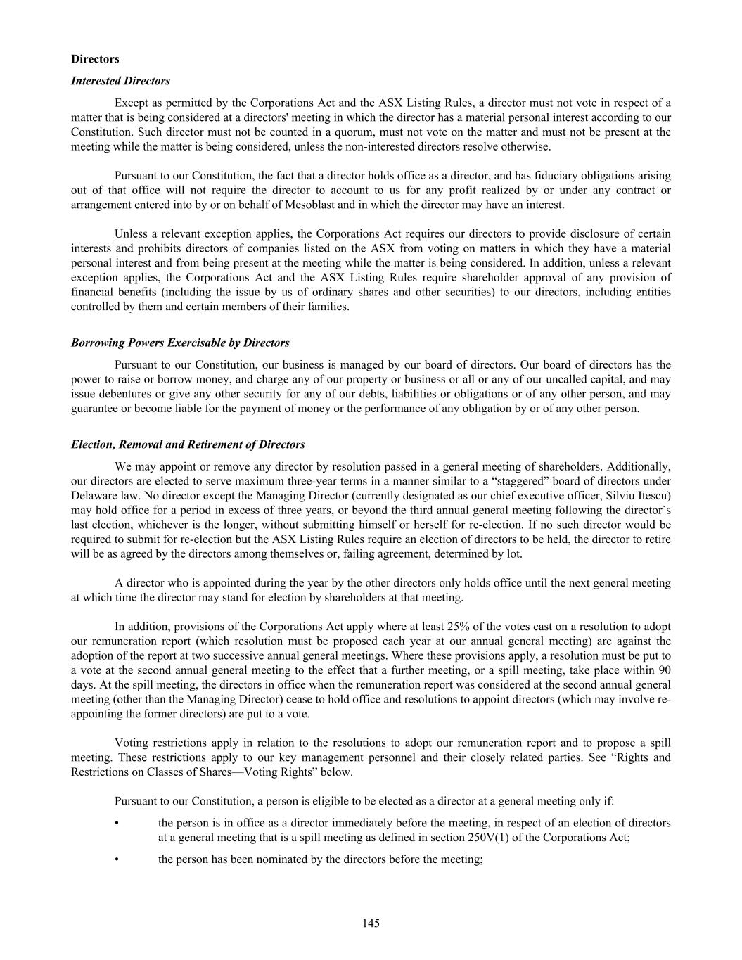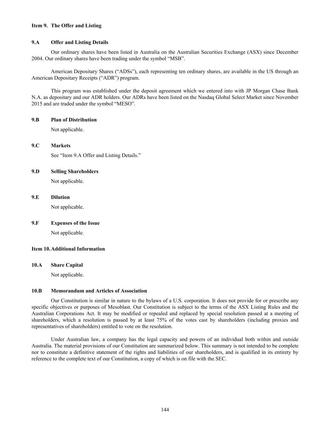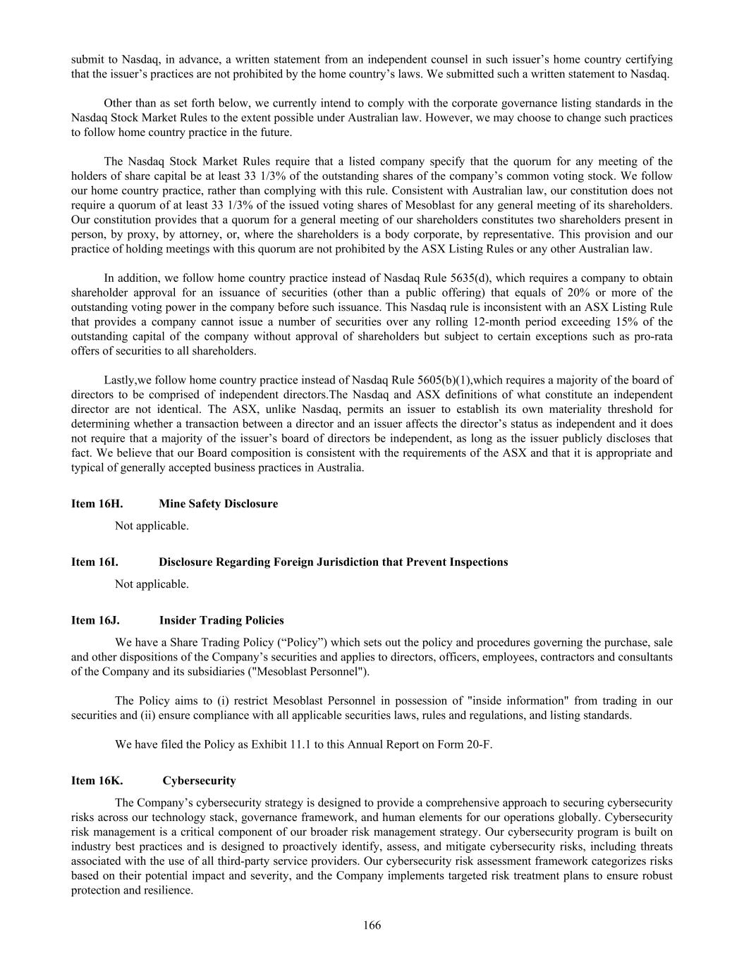 submit to Nasdaq, in advance, a written statement from an independent counsel in such issuer’s home country certifying that the issuer’s practices are not prohibited by the home country’s laws. We submitted such a written statement to Nasdaq. Other than as set forth below, we currently intend to comply with the corporate governance listing standards in the Nasdaq Stock Market Rules to the extent possible under Australian law. However, we may choose to change such practices to follow home country practice in the future. The Nasdaq Stock Market Rules require that a listed company specify that the quorum for any meeting of the holders of share capital be at least 33 1/3% of the outstanding shares of the company’s common voting stock. We follow our home country practice, rather than complying with this rule. Consistent with Australian law, our constitution does not require a quorum of at least 33 1/3% of the issued voting shares of Mesoblast for any general meeting of its shareholders. Our constitution provides that a quorum for a general meeting of our shareholders constitutes two shareholders present in person, by proxy, by attorney, or, where the shareholders is a body corporate, by representative. This provision and our practice of holding meetings with this quorum are not prohibited by the ASX Listing Rules or any other Australian law. In addition, we follow home country practice instead of Nasdaq Rule 5635(d), which requires a company to obtain shareholder approval for an issuance of securities (other than a public offering) that equals of 20% or more of the outstanding voting power in the company before such issuance. This Nasdaq rule is inconsistent with an ASX Listing Rule that provides a company cannot issue a number of securities over any rolling 12-month period exceeding 15% of the outstanding capital of the company without approval of shareholders but subject to certain exceptions such as pro-rata offers of securities to all shareholders. Lastly,we follow home country practice instead of Nasdaq Rule 5605(b)(1),which requires a majority of the board of directors to be comprised of independent directors.The Nasdaq and ASX definitions of what constitute an independent director are not identical. The ASX, unlike Nasdaq, permits an issuer to establish its own materiality threshold for determining whether a transaction between a director and an issuer affects the director’s status as independent and it does not require that a majority of the issuer’s board of directors be independent, as long as the issuer publicly discloses that fact. We believe that our Board composition is consistent with the requirements of the ASX and that it is appropriate and typical of generally accepted business practices in Australia. Item 16H. Mine Safety Disclosure Not applicable. Item 16I. Disclosure Regarding Foreign Jurisdiction that Prevent Inspections Not applicable. Item 16J. Insider Trading Policies We have a Share Trading Policy (“Policy”) which sets out the policy and procedures governing the purchase, sale and other dispositions of the Company’s securities and applies to directors, officers, employees, contractors and consultants of the Company and its subsidiaries ("Mesoblast Personnel"). The Policy aims to (i) restrict Mesoblast Personnel in possession of "inside information" from trading in our securities and (ii) ensure compliance with all applicable securities laws, rules and regulations, and listing standards. We have filed the Policy as Exhibit 11.1 to this Annual Report on Form 20-F. Item 16K. Cybersecurity The Company’s cybersecurity strategy is designed to provide a comprehensive approach to securing cybersecurity risks across our technology stack, governance framework, and human elements for our operations globally. Cybersecurity risk management is a critical component of our broader risk management strategy. Our cybersecurity program is built on industry best practices and is designed to proactively identify, assess, and mitigate cybersecurity risks, including threats associated with the use of all third-party service providers. Our cybersecurity risk assessment framework categorizes risks based on their potential impact and severity, and the Company implements targeted risk treatment plans to ensure robust protection and resilience. 166