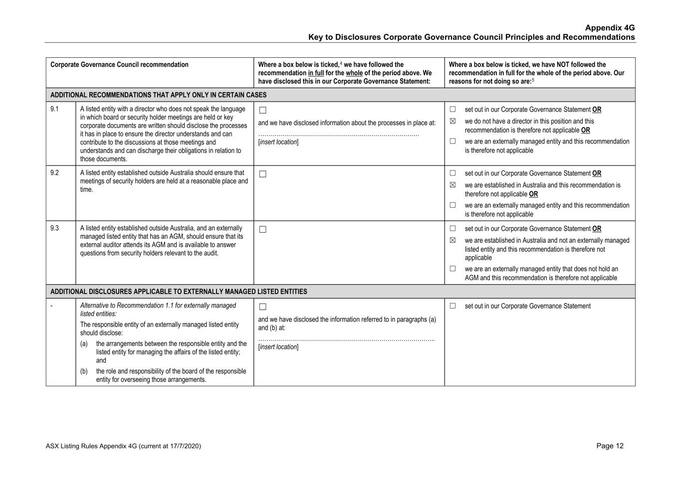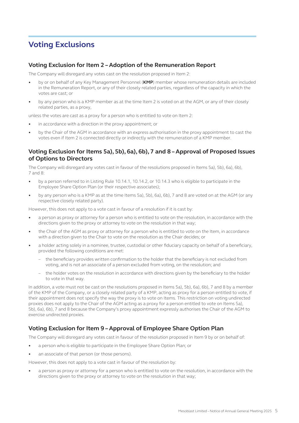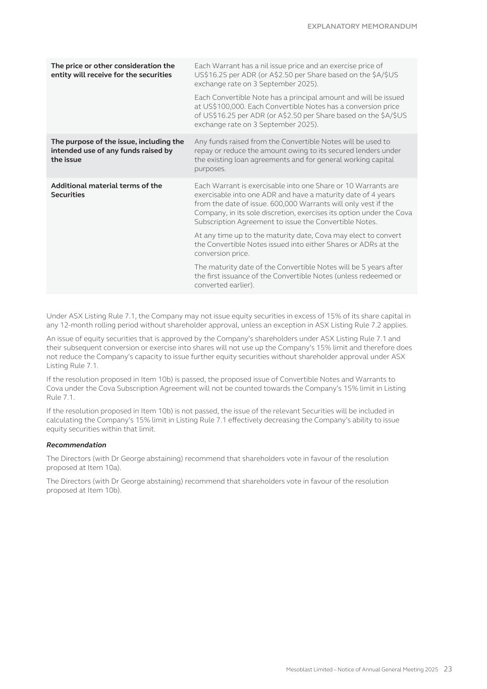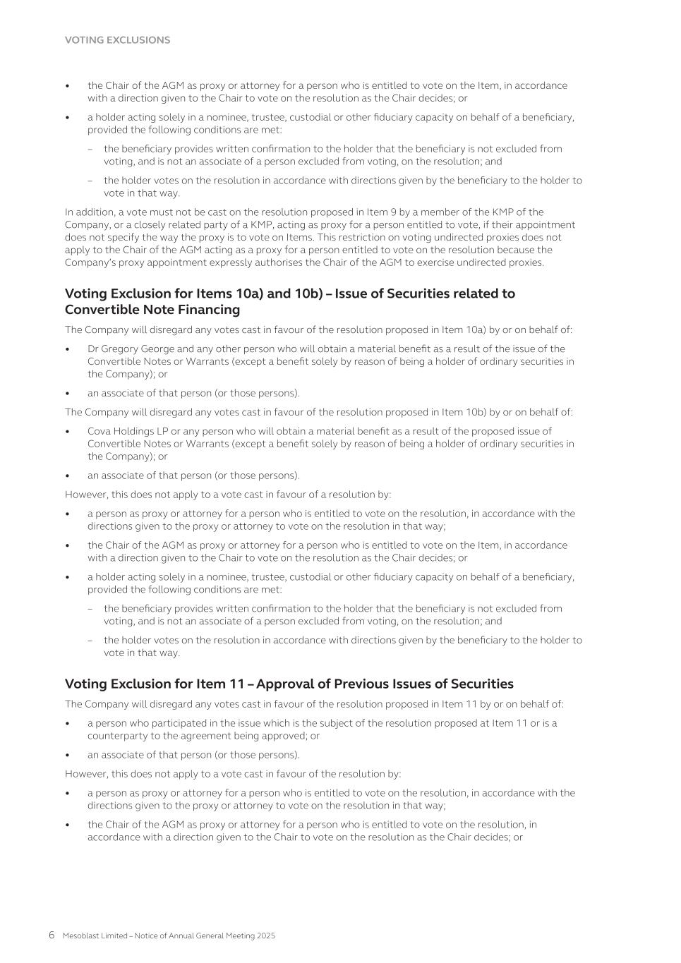 submit to Nasdaq, in advance, a written statement from an independent counsel in such issuer’s home country certifying that the issuer’s practices are not prohibited by the home country’s laws. We submitted such a written statement to Nasdaq. Other than as set forth below, we currently intend to comply with the corporate governance listing standards in the Nasdaq Stock Market Rules to the extent possible under Australian law. However, we may choose to change such practices to follow home country practice in the future. The Nasdaq Stock Market Rules require that a listed company specify that the quorum for any meeting of the holders of share capital be at least 33 1/3% of the outstanding shares of the company’s common voting stock. We follow our home country practice, rather than complying with this rule. Consistent with Australian law, our constitution does not require a quorum of at least 33 1/3% of the issued voting shares of Mesoblast for any general meeting of its shareholders. Our constitution provides that a quorum for a general meeting of our shareholders constitutes two shareholders present in person, by proxy, by attorney, or, where the shareholders is a body corporate, by representative. This provision and our practice of holding meetings with this quorum are not prohibited by the ASX Listing Rules or any other Australian law. In addition, we follow home country practice instead of Nasdaq Rule 5635(d), which requires a company to obtain shareholder approval for an issuance of securities (other than a public offering) that equals of 20% or more of the outstanding voting power in the company before such issuance. This Nasdaq rule is inconsistent with an ASX Listing Rule that provides a company cannot issue a number of securities over any rolling 12-month period exceeding 15% of the outstanding capital of the company without approval of shareholders but subject to certain exceptions such as pro-rata offers of securities to all shareholders. Lastly,we follow home country practice instead of Nasdaq Rule 5605(b)(1),which requires a majority of the board of directors to be comprised of independent directors.The Nasdaq and ASX definitions of what constitute an independent director are not identical. The ASX, unlike Nasdaq, permits an issuer to establish its own materiality threshold for determining whether a transaction between a director and an issuer affects the director’s status as independent and it does not require that a majority of the issuer’s board of directors be independent, as long as the issuer publicly discloses that fact. We believe that our Board composition is consistent with the requirements of the ASX and that it is appropriate and typical of generally accepted business practices in Australia. Item 16H. Mine Safety Disclosure Not applicable. Item 16I. Disclosure Regarding Foreign Jurisdiction that Prevent Inspections Not applicable. Item 16J. Insider Trading Policies We have a Share Trading Policy (“Policy”) which sets out the policy and procedures governing the purchase, sale and other dispositions of the Company’s securities and applies to directors, officers, employees, contractors and consultants of the Company and its subsidiaries ("Mesoblast Personnel"). The Policy aims to (i) restrict Mesoblast Personnel in possession of "inside information" from trading in our securities and (ii) ensure compliance with all applicable securities laws, rules and regulations, and listing standards. We have filed the Policy as Exhibit 11.1 to this Annual Report on Form 20-F. Item 16K. Cybersecurity The Company’s cybersecurity strategy is designed to provide a comprehensive approach to securing cybersecurity risks across our technology stack, governance framework, and human elements for our operations globally. Cybersecurity risk management is a critical component of our broader risk management strategy. Our cybersecurity program is built on industry best practices and is designed to proactively identify, assess, and mitigate cybersecurity risks, including threats associated with the use of all third-party service providers. Our cybersecurity risk assessment framework categorizes risks based on their potential impact and severity, and the Company implements targeted risk treatment plans to ensure robust protection and resilience. 166