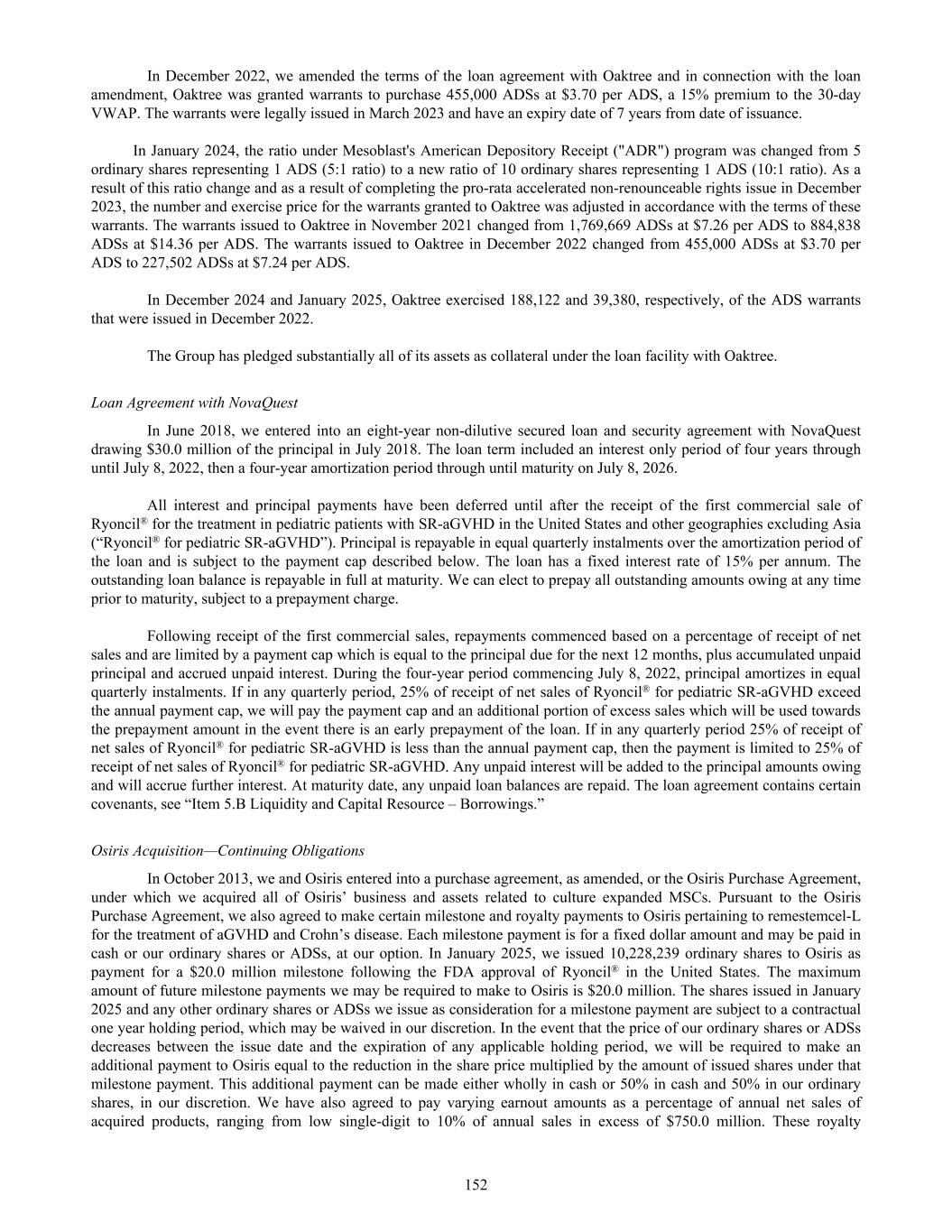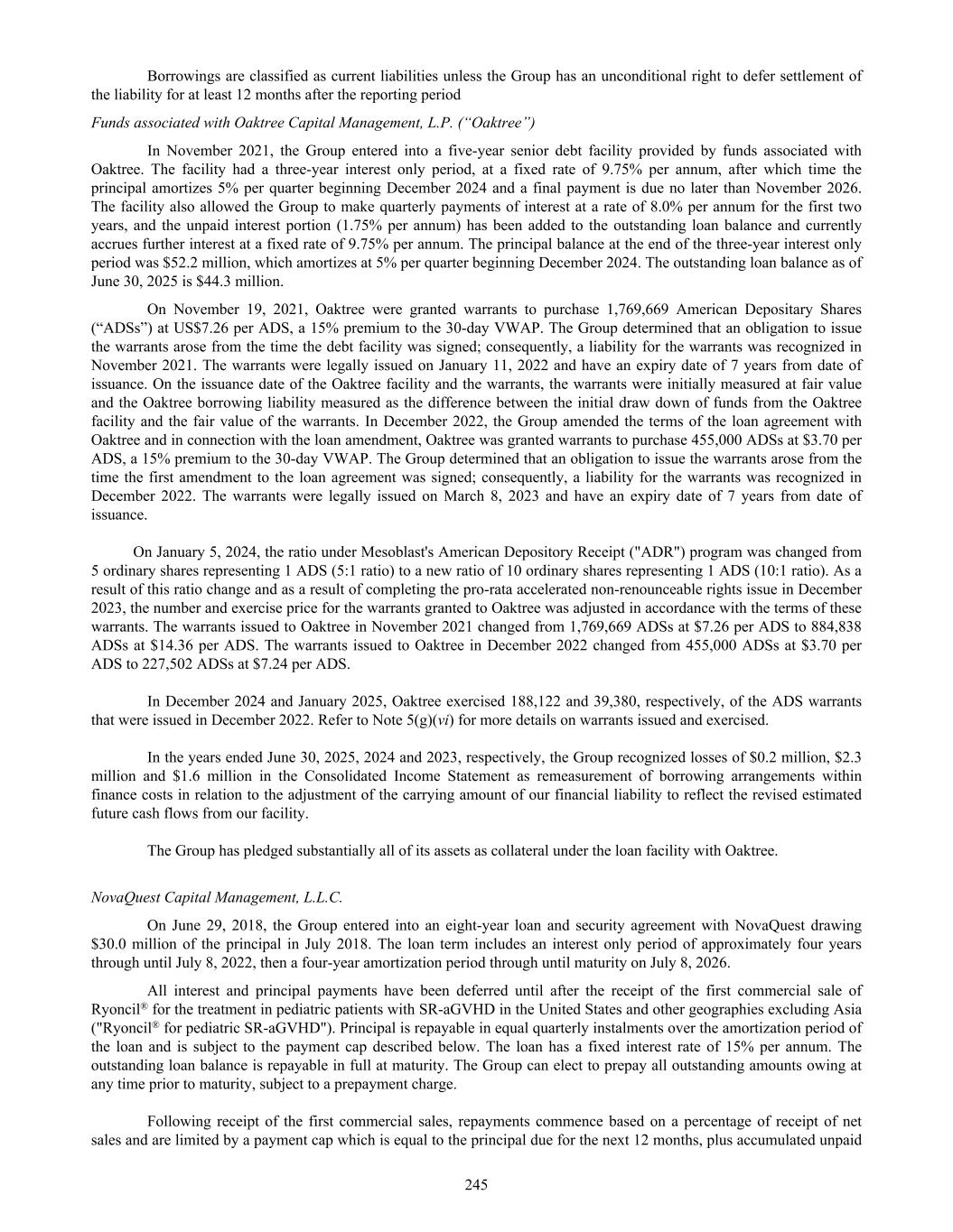 Borrowings are classified as current liabilities unless the Group has an unconditional right to defer settlement of the liability for at least 12 months after the reporting period Funds associated with Oaktree Capital Management, L.P. (“Oaktree”) In November 2021, the Group entered into a five-year senior debt facility provided by funds associated with Oaktree. The facility had a three-year interest only period, at a fixed rate of 9.75% per annum, after which time the principal amortizes 5% per quarter beginning December 2024 and a final payment is due no later than November 2026. The facility also allowed the Group to make quarterly payments of interest at a rate of 8.0% per annum for the first two years, and the unpaid interest portion (1.75% per annum) has been added to the outstanding loan balance and currently accrues further interest at a fixed rate of 9.75% per annum. The principal balance at the end of the three-year interest only period was $52.2 million, which amortizes at 5% per quarter beginning December 2024. The outstanding loan balance as of June 30, 2025 is $44.3 million. On November 19, 2021, Oaktree were granted warrants to purchase 1,769,669 American Depositary Shares (“ADSs”) at US$7.26 per ADS, a 15% premium to the 30-day VWAP. The Group determined that an obligation to issue the warrants arose from the time the debt facility was signed; consequently, a liability for the warrants was recognized in November 2021. The warrants were legally issued on January 11, 2022 and have an expiry date of 7 years from date of issuance. On the issuance date of the Oaktree facility and the warrants, the warrants were initially measured at fair value and the Oaktree borrowing liability measured as the difference between the initial draw down of funds from the Oaktree facility and the fair value of the warrants. In December 2022, the Group amended the terms of the loan agreement with Oaktree and in connection with the loan amendment, Oaktree was granted warrants to purchase 455,000 ADSs at $3.70 per ADS, a 15% premium to the 30-day VWAP. The Group determined that an obligation to issue the warrants arose from the time the first amendment to the loan agreement was signed; consequently, a liability for the warrants was recognized in December 2022. The warrants were legally issued on March 8, 2023 and have an expiry date of 7 years from date of issuance. On January 5, 2024, the ratio under Mesoblast's American Depository Receipt ("ADR") program was changed from 5 ordinary shares representing 1 ADS (5:1 ratio) to a new ratio of 10 ordinary shares representing 1 ADS (10:1 ratio). As a result of this ratio change and as a result of completing the pro-rata accelerated non-renounceable rights issue in December 2023, the number and exercise price for the warrants granted to Oaktree was adjusted in accordance with the terms of these warrants. The warrants issued to Oaktree in November 2021 changed from 1,769,669 ADSs at $7.26 per ADS to 884,838 ADSs at $14.36 per ADS. The warrants issued to Oaktree in December 2022 changed from 455,000 ADSs at $3.70 per ADS to 227,502 ADSs at $7.24 per ADS. In December 2024 and January 2025, Oaktree exercised 188,122 and 39,380, respectively, of the ADS warrants that were issued in December 2022. Refer to Note 5(g)(vi) for more details on warrants issued and exercised. In the years ended June 30, 2025, 2024 and 2023, respectively, the Group recognized losses of $0.2 million, $2.3 million and $1.6 million in the Consolidated Income Statement as remeasurement of borrowing arrangements within finance costs in relation to the adjustment of the carrying amount of our financial liability to reflect the revised estimated future cash flows from our facility. The Group has pledged substantially all of its assets as collateral under the loan facility with Oaktree. NovaQuest Capital Management, L.L.C. On June 29, 2018, the Group entered into an eight-year loan and security agreement with NovaQuest drawing $30.0 million of the principal in July 2018. The loan term includes an interest only period of approximately four years through until July 8, 2022, then a four-year amortization period through until maturity on July 8, 2026. All interest and principal payments have been deferred until after the receipt of the first commercial sale of Ryoncil® for the treatment in pediatric patients with SR-aGVHD in the United States and other geographies excluding Asia ("Ryoncil® for pediatric SR-aGVHD"). Principal is repayable in equal quarterly instalments over the amortization period of the loan and is subject to the payment cap described below. The loan has a fixed interest rate of 15% per annum. The outstanding loan balance is repayable in full at maturity. The Group can elect to prepay all outstanding amounts owing at any time prior to maturity, subject to a prepayment charge. Following receipt of the first commercial sales, repayments commence based on a percentage of receipt of net sales and are limited by a payment cap which is equal to the principal due for the next 12 months, plus accumulated unpaid 245