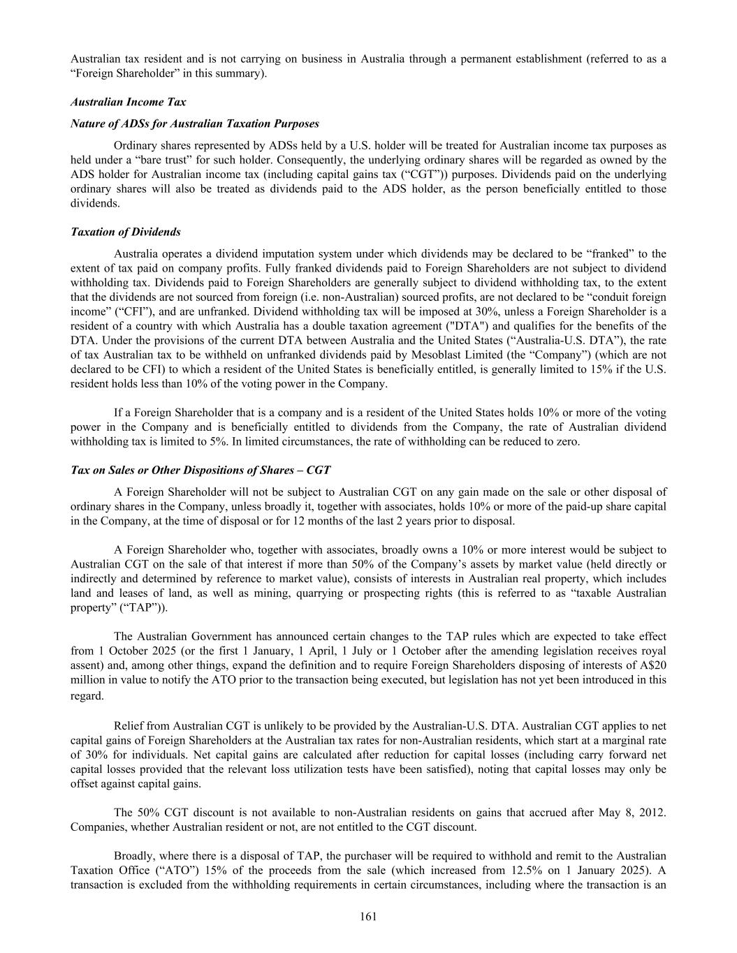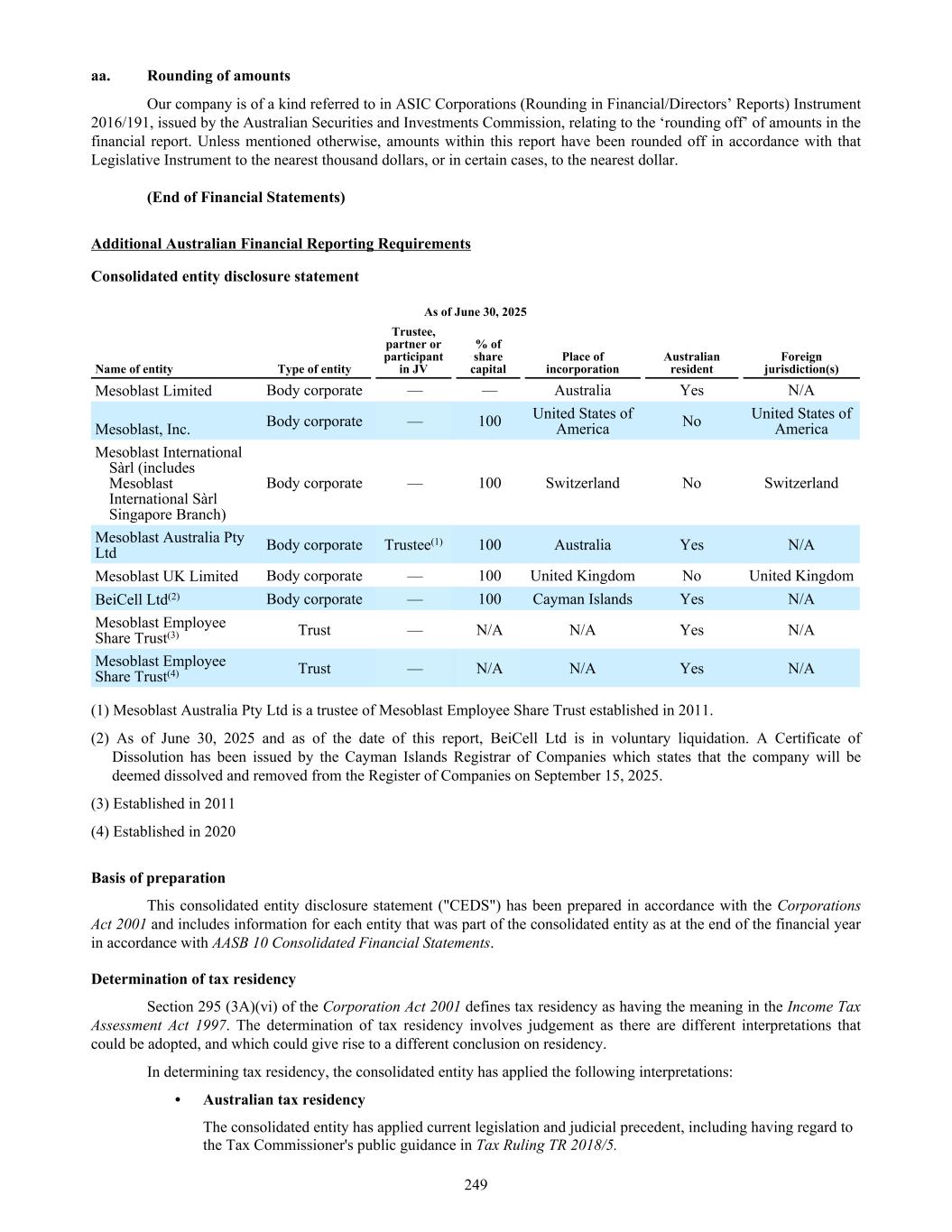 aa. Rounding of amounts Our company is of a kind referred to in ASIC Corporations (Rounding in Financial/Directors’ Reports) Instrument 2016/191, issued by the Australian Securities and Investments Commission, relating to the ‘rounding off’ of amounts in the financial report. Unless mentioned otherwise, amounts within this report have been rounded off in accordance with that Legislative Instrument to the nearest thousand dollars, or in certain cases, to the nearest dollar. (End of Financial Statements) Additional Australian Financial Reporting Requirements Consolidated entity disclosure statement As of June 30, 2025 Name of entity Type of entity Trustee, partner or participant in JV % of share capital Place of incorporation Australian resident Foreign jurisdiction(s) Mesoblast Limited Body corporate — — Australia Yes N/A Mesoblast, Inc. Body corporate — 100 United States of America No United States of America Mesoblast International Sàrl (includes Mesoblast International Sàrl Singapore Branch) Body corporate — 100 Switzerland No Switzerland Mesoblast Australia Pty Ltd Body corporate Trustee(1) 100 Australia Yes N/A Mesoblast UK Limited Body corporate — 100 United Kingdom No United Kingdom BeiCell Ltd(2) Body corporate — 100 Cayman Islands Yes N/A Mesoblast Employee Share Trust(3) Trust — N/A N/A Yes N/A Mesoblast Employee Share Trust(4) Trust — N/A N/A Yes N/A (1) Mesoblast Australia Pty Ltd is a trustee of Mesoblast Employee Share Trust established in 2011. (2) As of June 30, 2025 and as of the date of this report, BeiCell Ltd is in voluntary liquidation. A Certificate of Dissolution has been issued by the Cayman Islands Registrar of Companies which states that the company will be deemed dissolved and removed from the Register of Companies on September 15, 2025. (3) Established in 2011 (4) Established in 2020 Basis of preparation This consolidated entity disclosure statement ("CEDS") has been prepared in accordance with the Corporations Act 2001 and includes information for each entity that was part of the consolidated entity as at the end of the financial year in accordance with AASB 10 Consolidated Financial Statements. Determination of tax residency Section 295 (3A)(vi) of the Corporation Act 2001 defines tax residency as having the meaning in the Income Tax Assessment Act 1997. The determination of tax residency involves judgement as there are different interpretations that could be adopted, and which could give rise to a different conclusion on residency. In determining tax residency, the consolidated entity has applied the following interpretations: • Australian tax residency The consolidated entity has applied current legislation and judicial precedent, including having regard to the Tax Commissioner's public guidance in Tax Ruling TR 2018/5. 249
