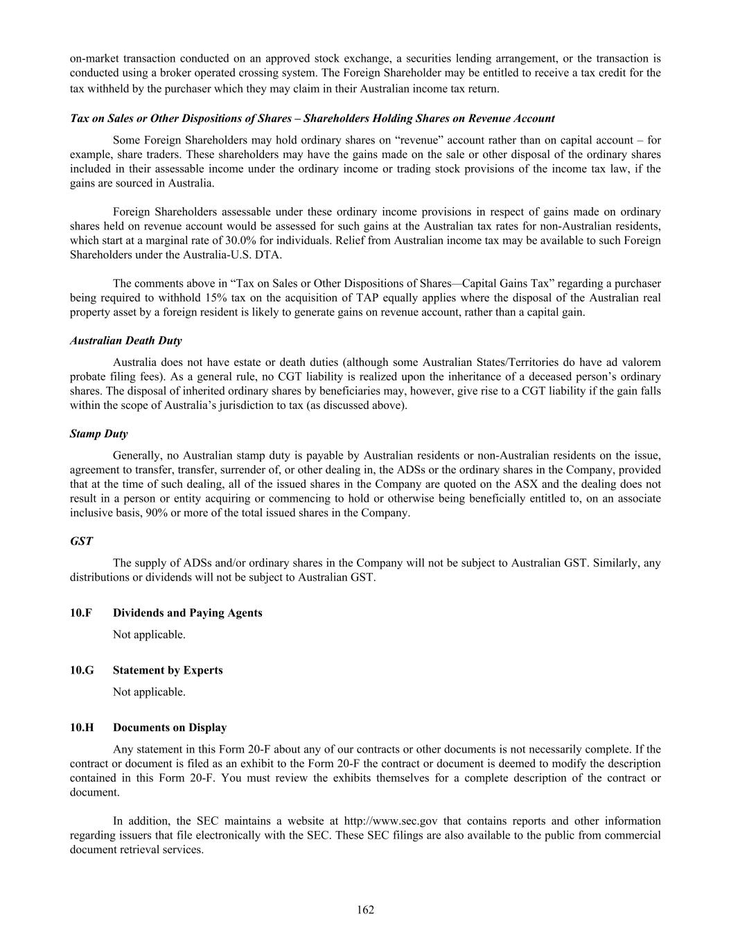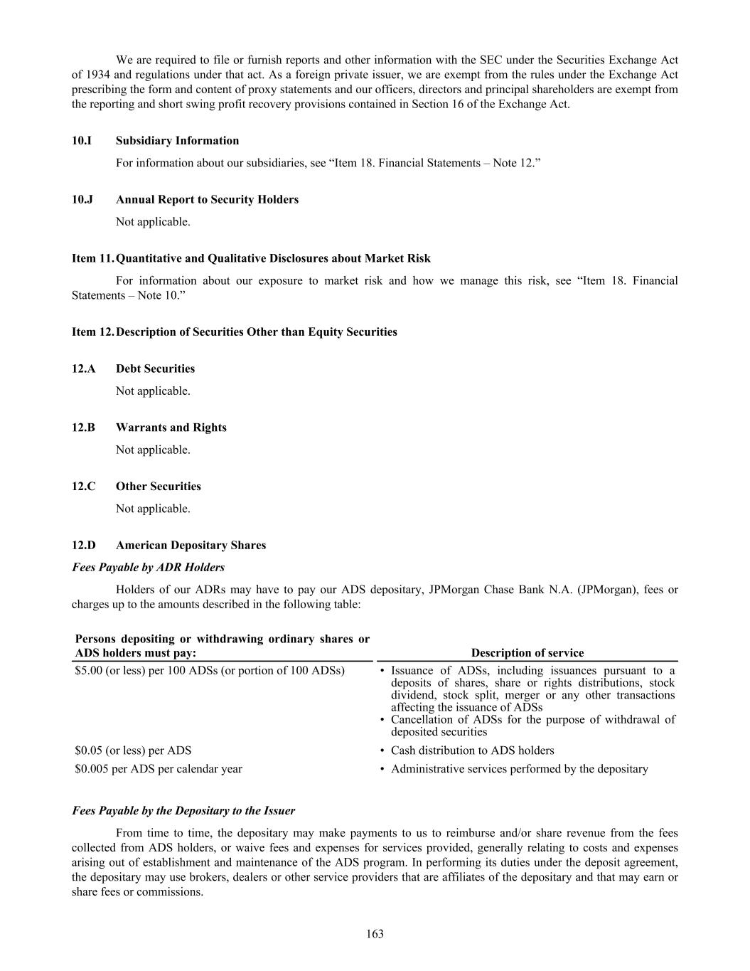 10.B Memorandum and Articles of Association 144 10.C Material Contracts 150 10.D Exchange Controls 153 10.E Taxation 155 10.F Dividends and Paying Agents 162 10.G Statement by Experts 162 10.H Documents on Display 162 10.I Subsidiary Information 163 10.J Annual Report to Security Holders 163 Item 11. Quantitative and Qualitative Disclosures about Market Risk 163 Item 12. Description of Securities Other than Equity Securities 163 12.A Debt Securities 163 12.B Warrants and Rights 163 12.C Other Securities 163 12.D American Depositary Shares 163 PART II 164 Item 13. Defaults, Dividend Arrearages and Delinquencies 164 Item 14. Material Modifications to the Rights of Security Holders and Use of Proceeds 164 Item 15. Controls and Procedures 164 Item 16. [Reserved] 164 Item 16A. Audit Committee Financial Expert 164 Item 16B. Code of Ethics 165 Item 16C. Principal Accountant Fees and Services 165 Item 16D. Exemptions from the Listing Standards for Audit Committees 165 Item 16E. Purchases of Equity Securities by the Issuer and Affiliated Purchasers 165 Item 16F. Change in Registrant’s Certifying Accountant 165 Item 16G. Corporate Governance 165 Item 16H. Mine Safety Disclosure 166 Item 16I. Disclosure Regarding Foreign Jurisdiction that Prevent Inspections 166 Item 16J. Insider Trading Policies 166 Item 16K. Cybersecurity 166 PART III 167 Item 17. Financial Statements 167 Item 18. Financial Statements 167 Item 19. Exhibits 257 SIGNATURES 260