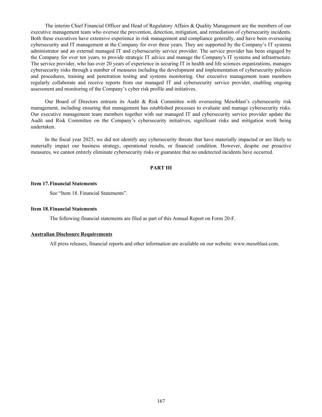 The interim Chief Financial Officer and Head of Regulatory Affairs & Quality Management are the members of our executive management team who oversee the prevention, detection, mitigation, and remediation of cybersecurity incidents. Both these executives have extensive experience in risk management and compliance generally, and have been overseeing cybersecurity and IT management at the Company for over three years. They are supported by the Company’s IT systems administrator and an external managed IT and cybersecurity service provider. The service provider has been engaged by the Company for over ten years, to provide strategic IT advice and manage the Company's IT systems and infrastructure. The service provider, who has over 20 years of experience in securing IT in health and life sciences organizations, manages cybersecurity risks through a number of measures including the development and implementation of cybersecurity policies and procedures, training and penetration testing and systems monitoring. Our executive management team members regularly collaborate and receive reports from our managed IT and cybersecurity service provider, enabling ongoing assessment and monitoring of the Company’s cyber risk profile and initiatives. Our Board of Directors entrusts its Audit & Risk Committee with overseeing Mesoblast’s cybersecurity risk management, including ensuring that management has established processes to evaluate and manage cybersecurity risks. Our executive management team members together with our managed IT and cybersecurity service provider update the Audit and Risk Committee on the Company’s cybersecurity initiatives, significant risks and mitigation work being undertaken. In the fiscal year 2025, we did not identify any cybersecurity threats that have materially impacted or are likely to materially impact our business strategy, operational results, or financial condition. However, despite our proactive measures, we cannot entirely eliminate cybersecurity risks or guarantee that no undetected incidents have occurred. PART III Item 17. Financial Statements See “Item 18. Financial Statements”. Item 18. Financial Statements The following financial statements are filed as part of this Annual Report on Form 20-F. Australian Disclosure Requirements All press releases, financial reports and other information are available on our website: www.mesoblast.com. 167